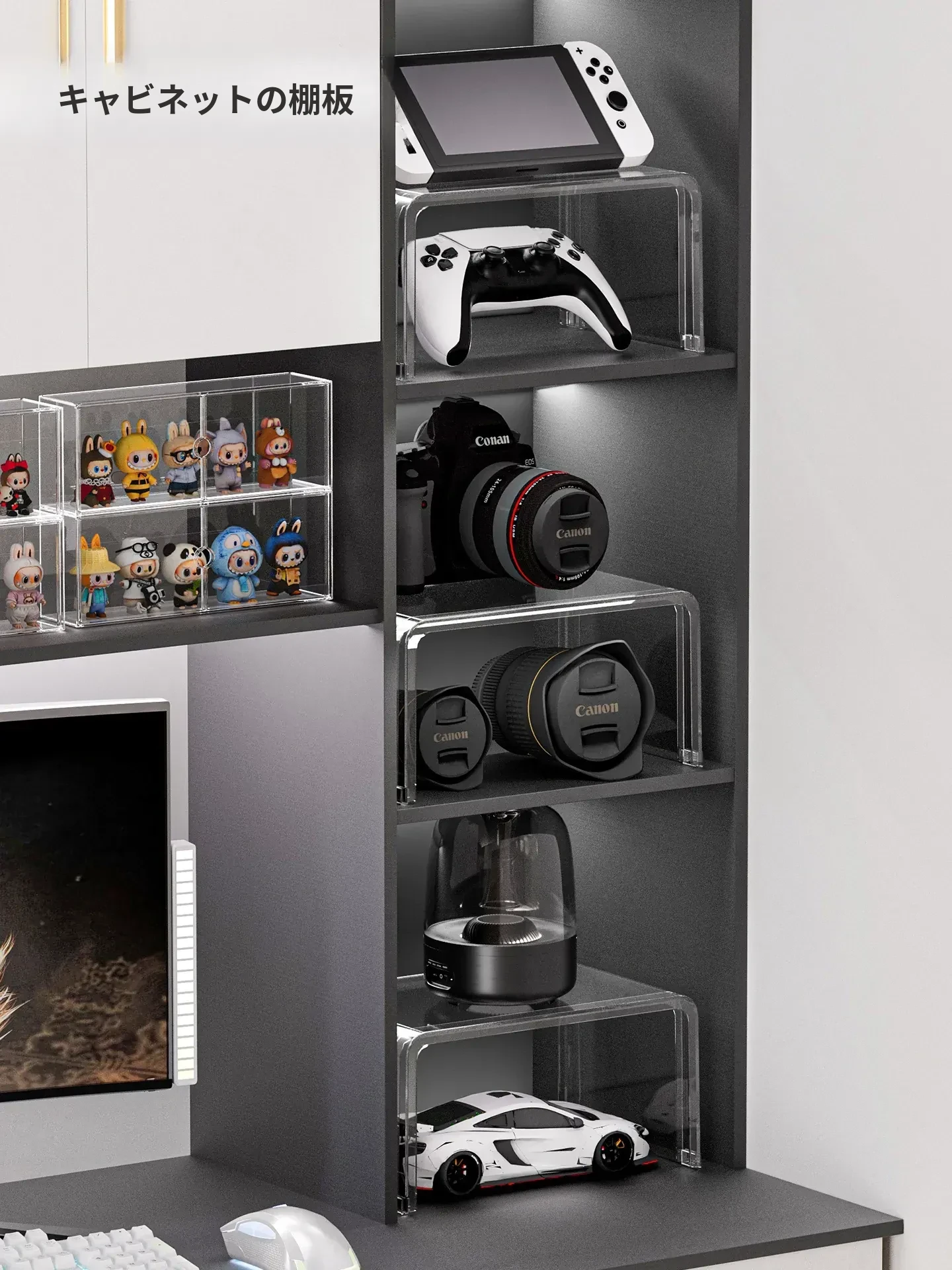 分けて収納できるアクリル製多層キャビネット仕切り!U型デザインでデスク周りもスッキリ整理。フィギュアや小物を美しくディスプレイできる便利な収納ラック!
