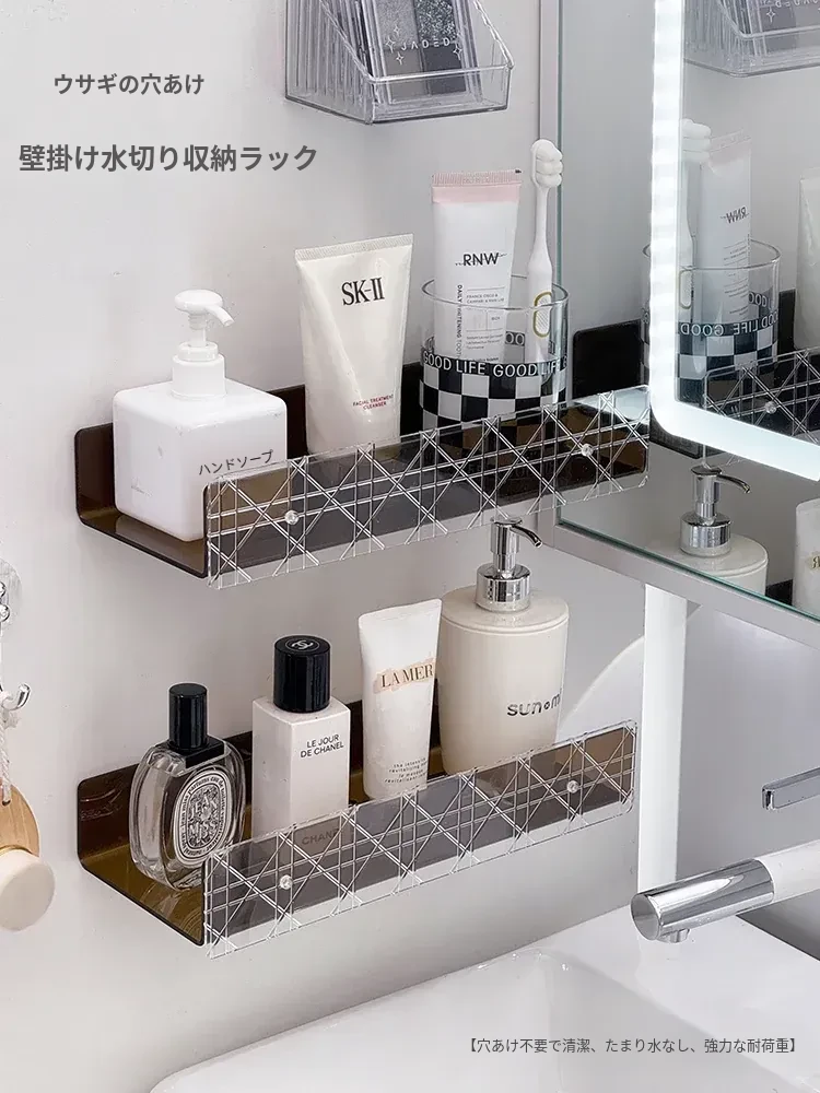 壁掛け式バスルーム収納ラック - 化粧品整理ボックス、穴を開けずに取り付け可能!洗面台やトイレで使える水切り付き、スッキリとした空間を実現します。おしゃれで実用的な収納ソリューション!