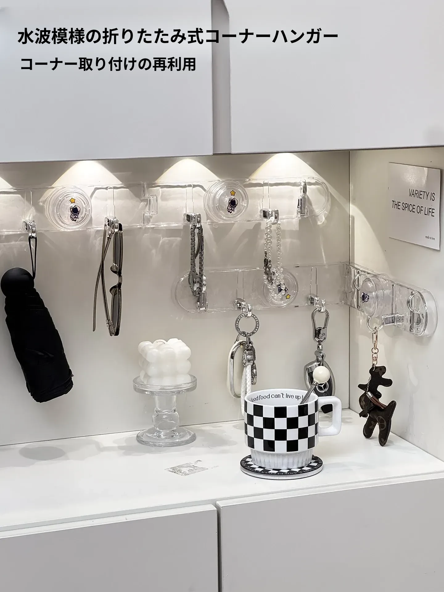 玄関用吸盤型コーナー連結フック!入室ドアの裏に隠せる折りたたみ式収納ラックで、鍵や帽子をスッキリ整理。スペースを有効活用して、すっきりした玄関を実現!