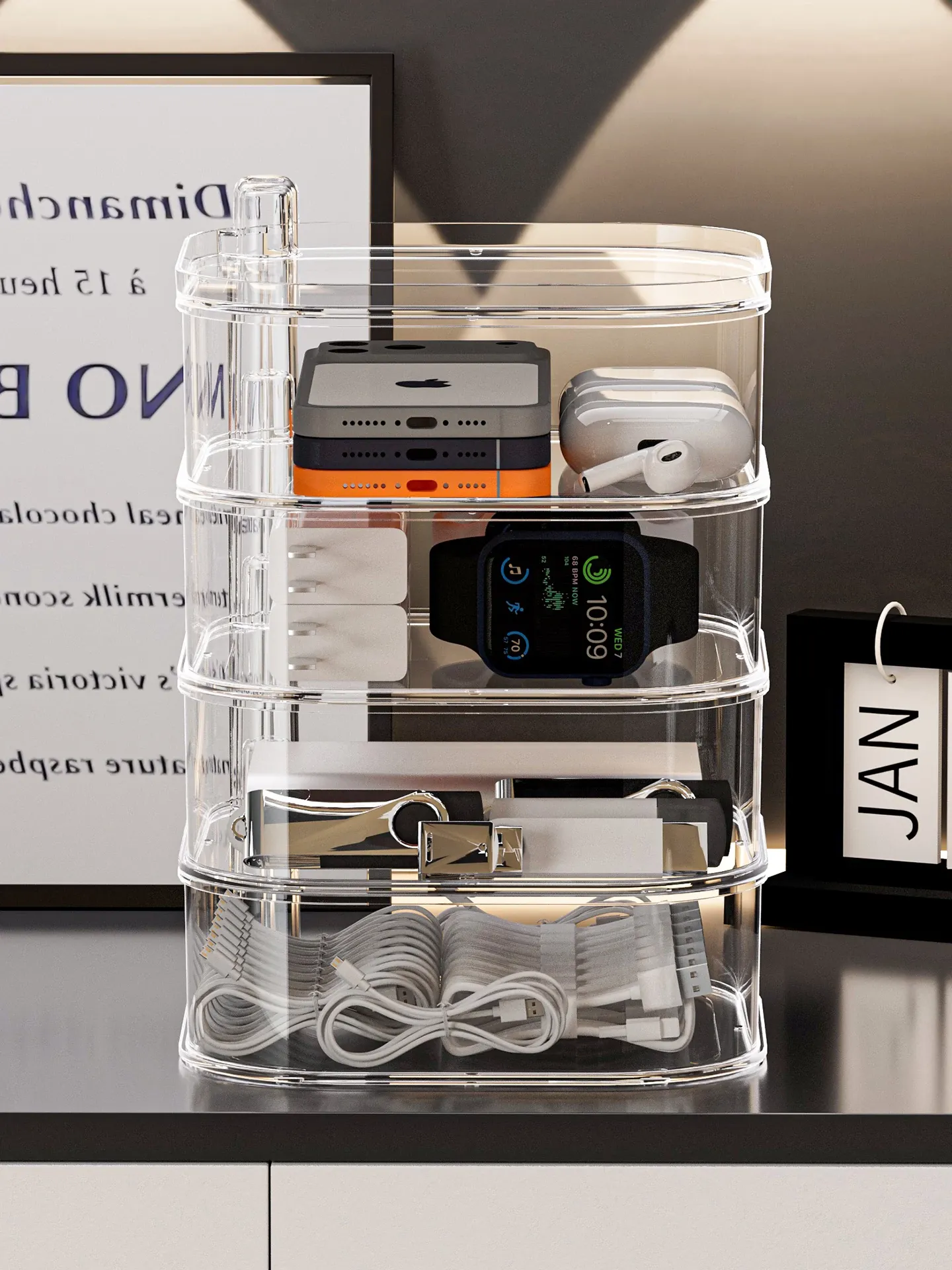 デスク上で回転するデータケーブル収納ボックス - スマホ充電器整理の必需品!透明の多層ハブで、ケーブルをすっきり整理して、使いやすさとスタイルを両立。あなたのデスクを美しく保ちましょう!