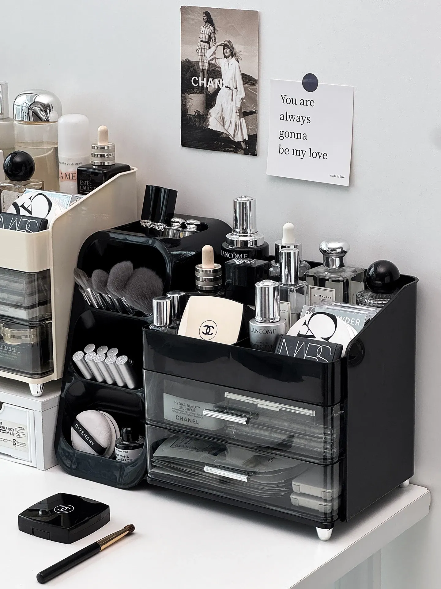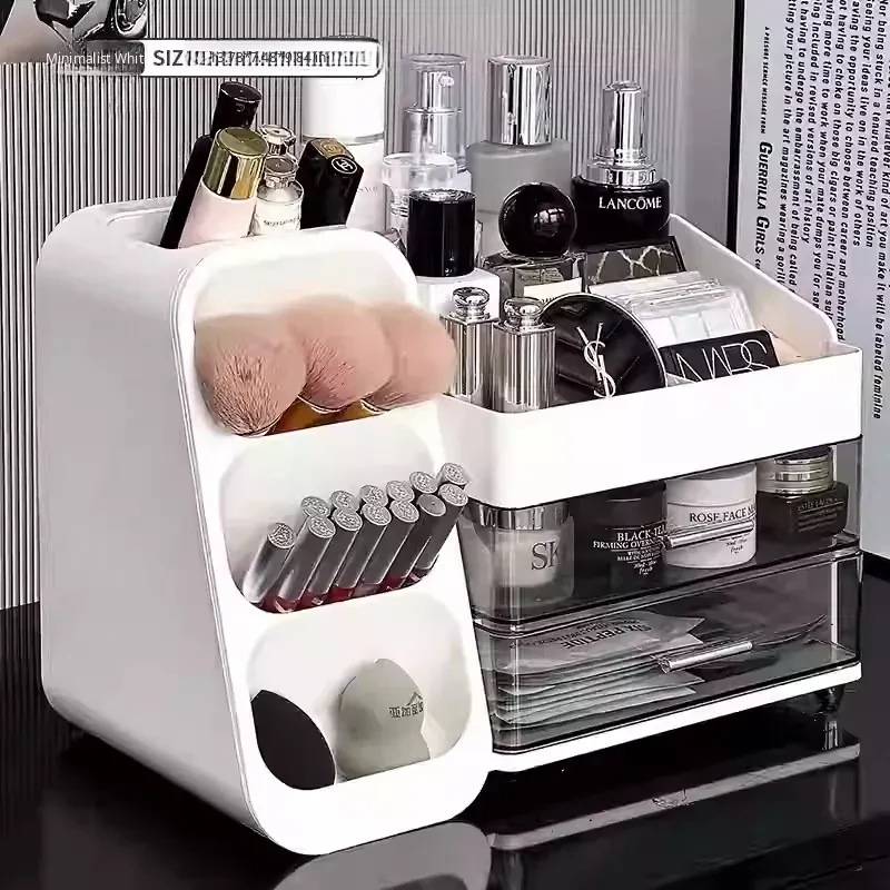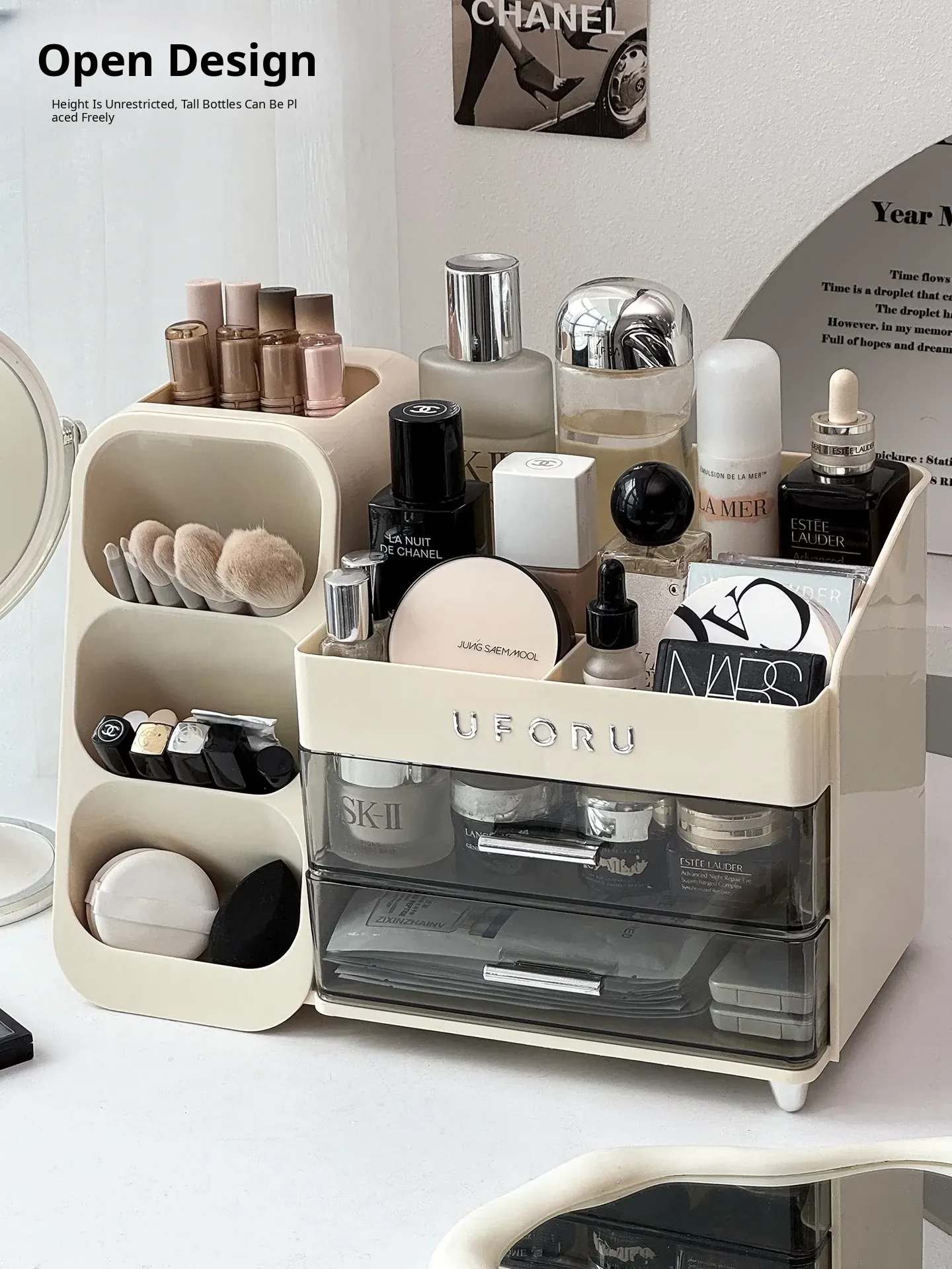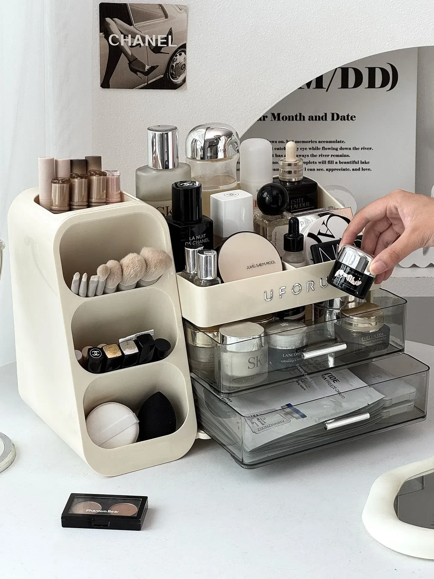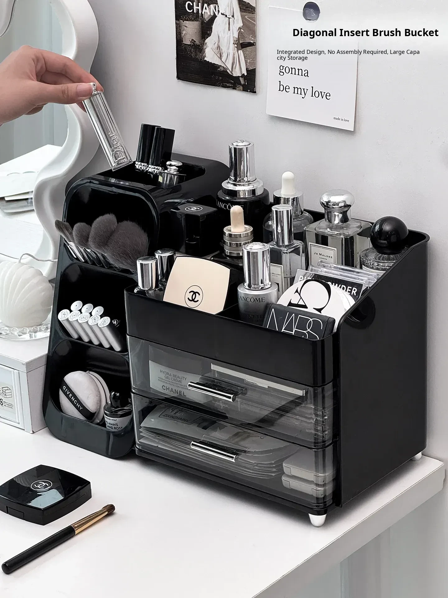 Elegant Desktop Makeup Organizer - Spacious Cosmetic Storage Box for Dressing Table with Drawers and Lipstick Organizer, Perfect for Skincare Products and Beauty Essentials.