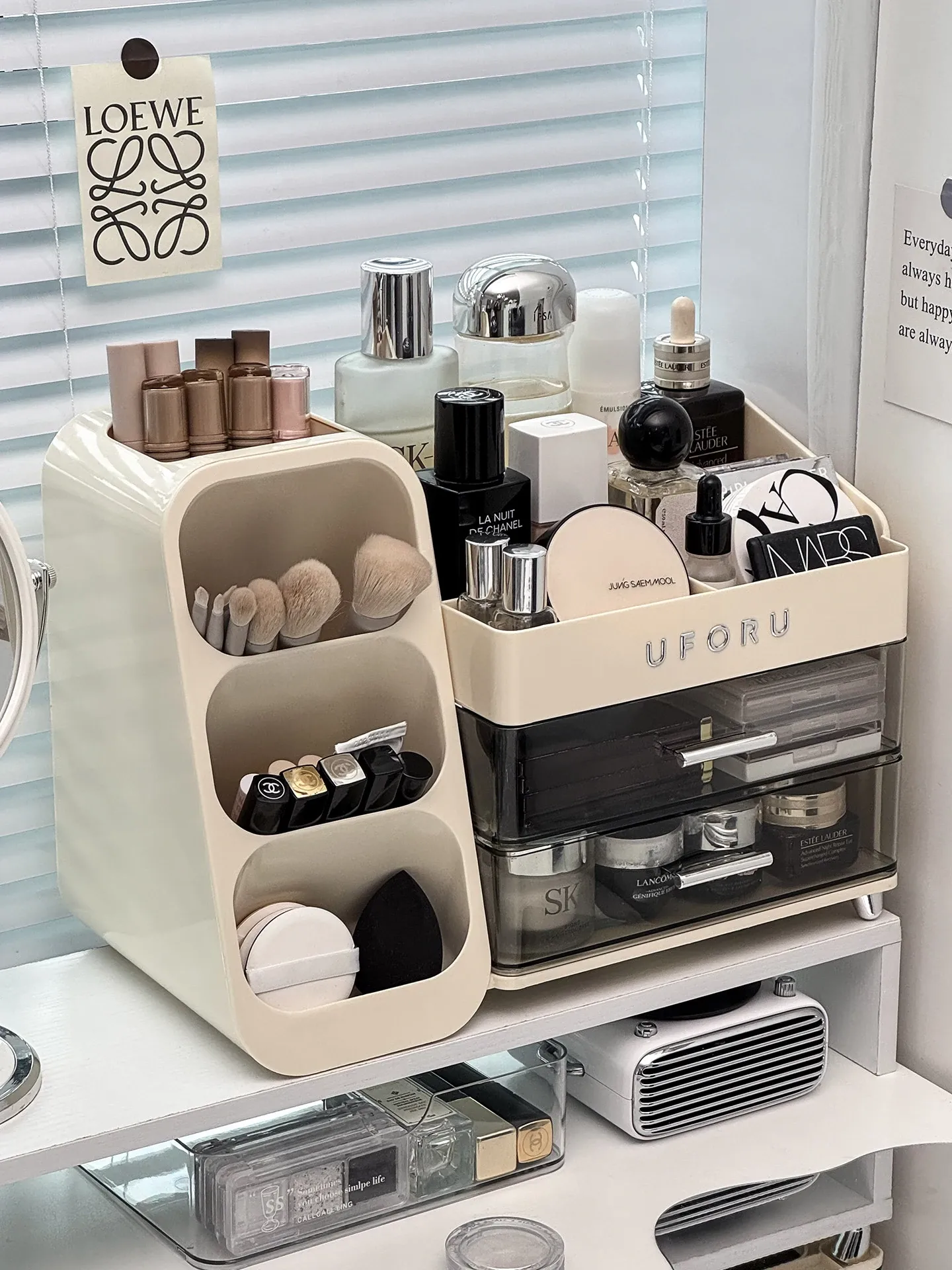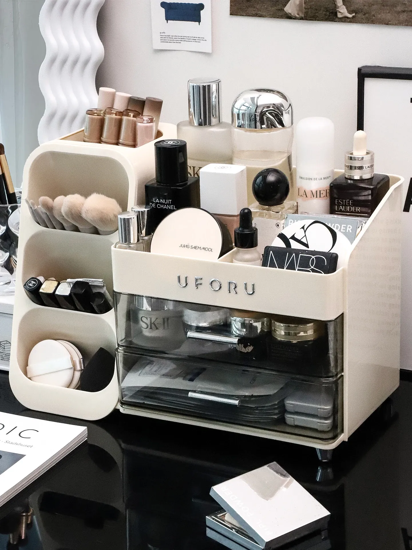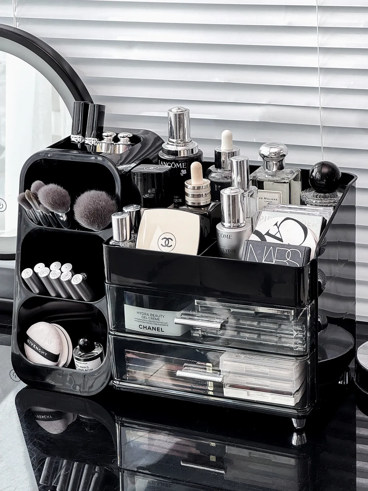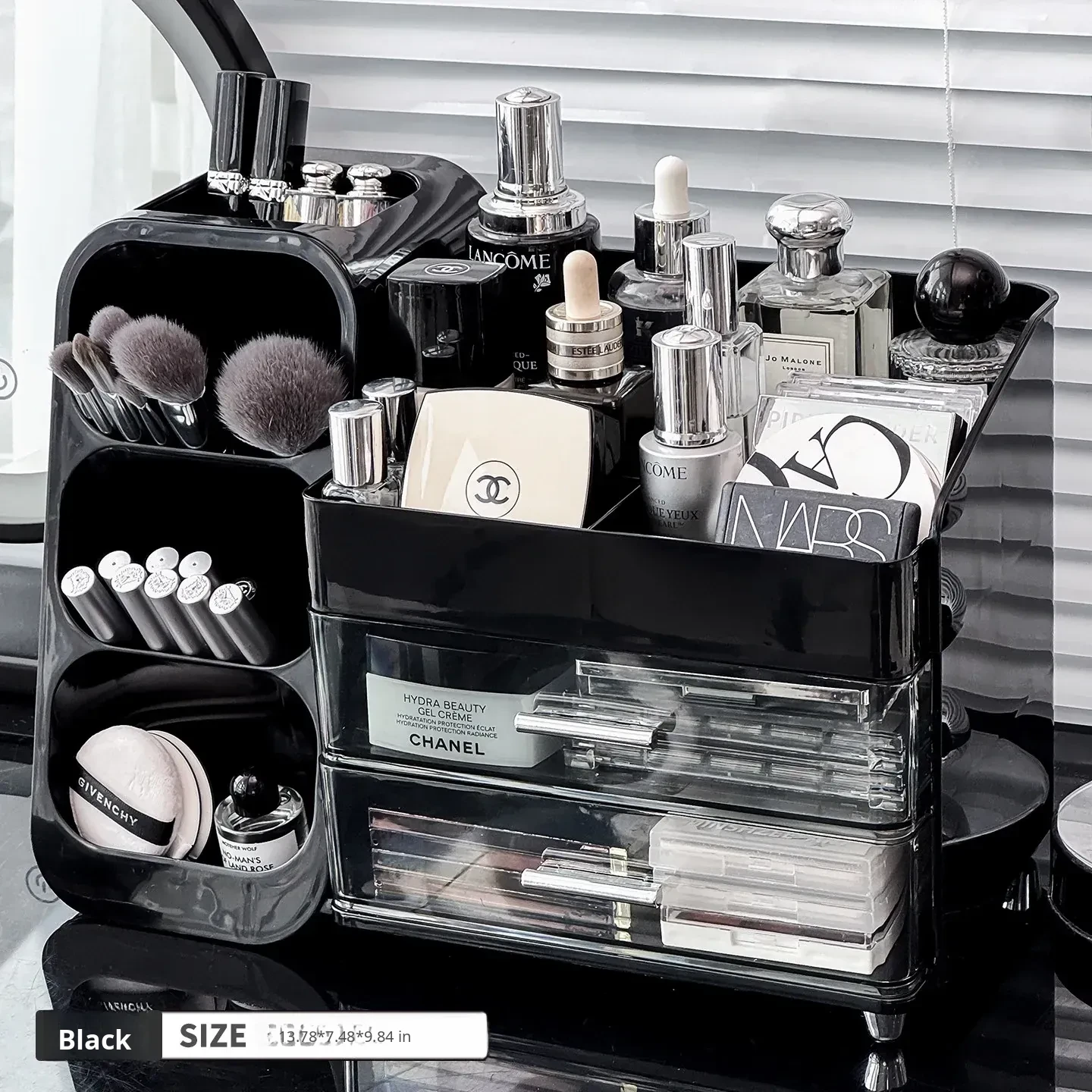 Elegant Desktop Makeup Organizer - Spacious Cosmetic Storage Box for Dressing Table with Drawers and Lipstick Organizer, Perfect for Skincare Products and Beauty Essentials.
