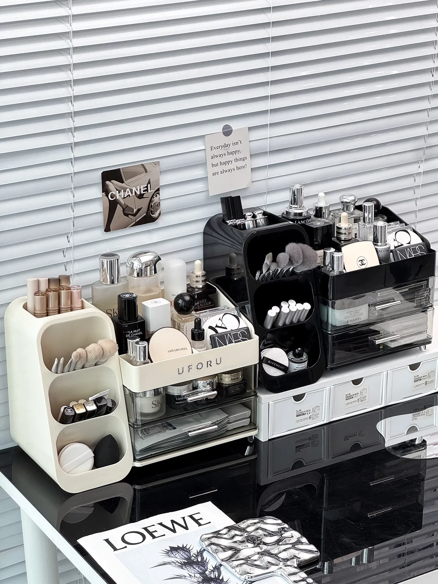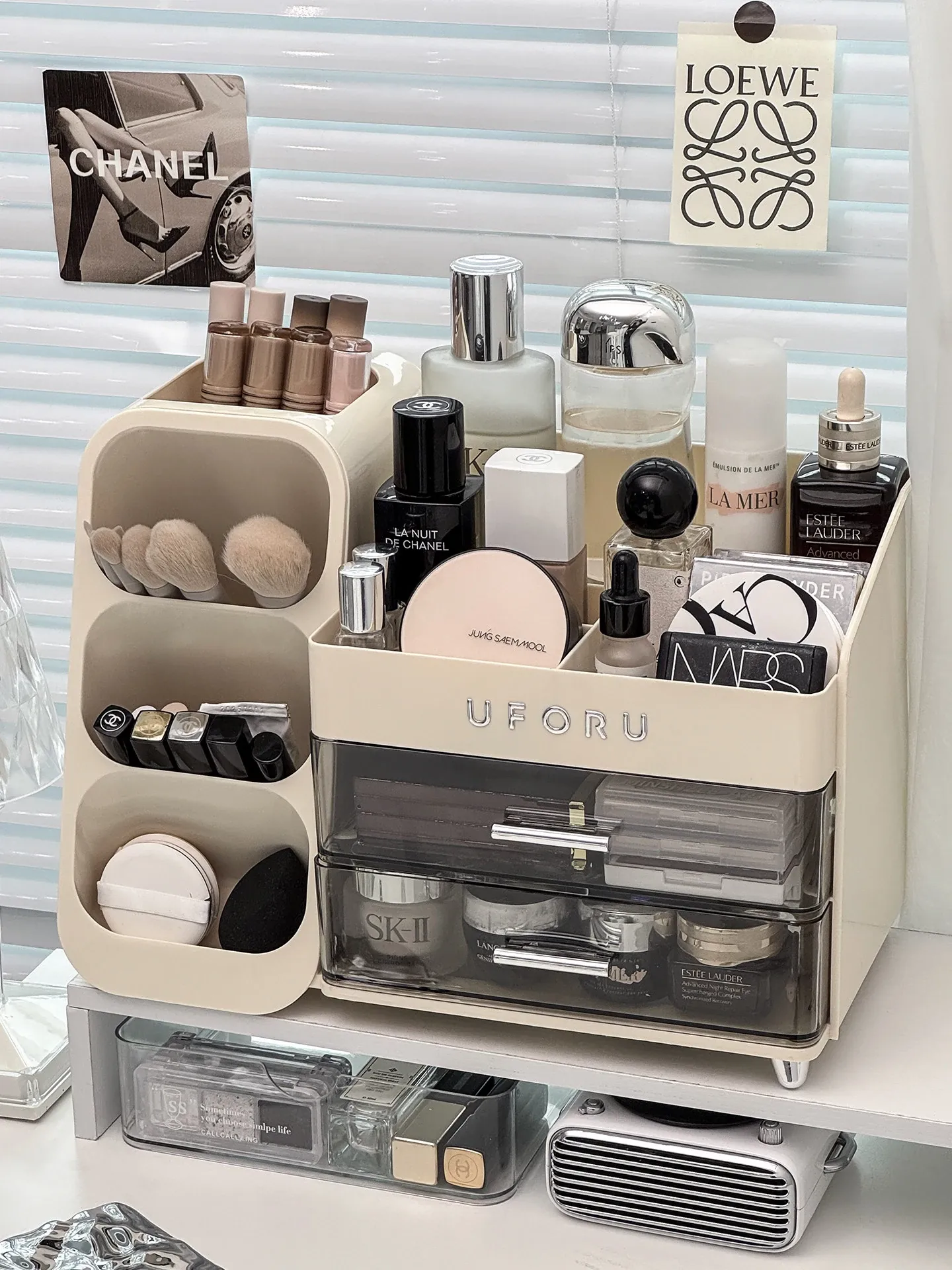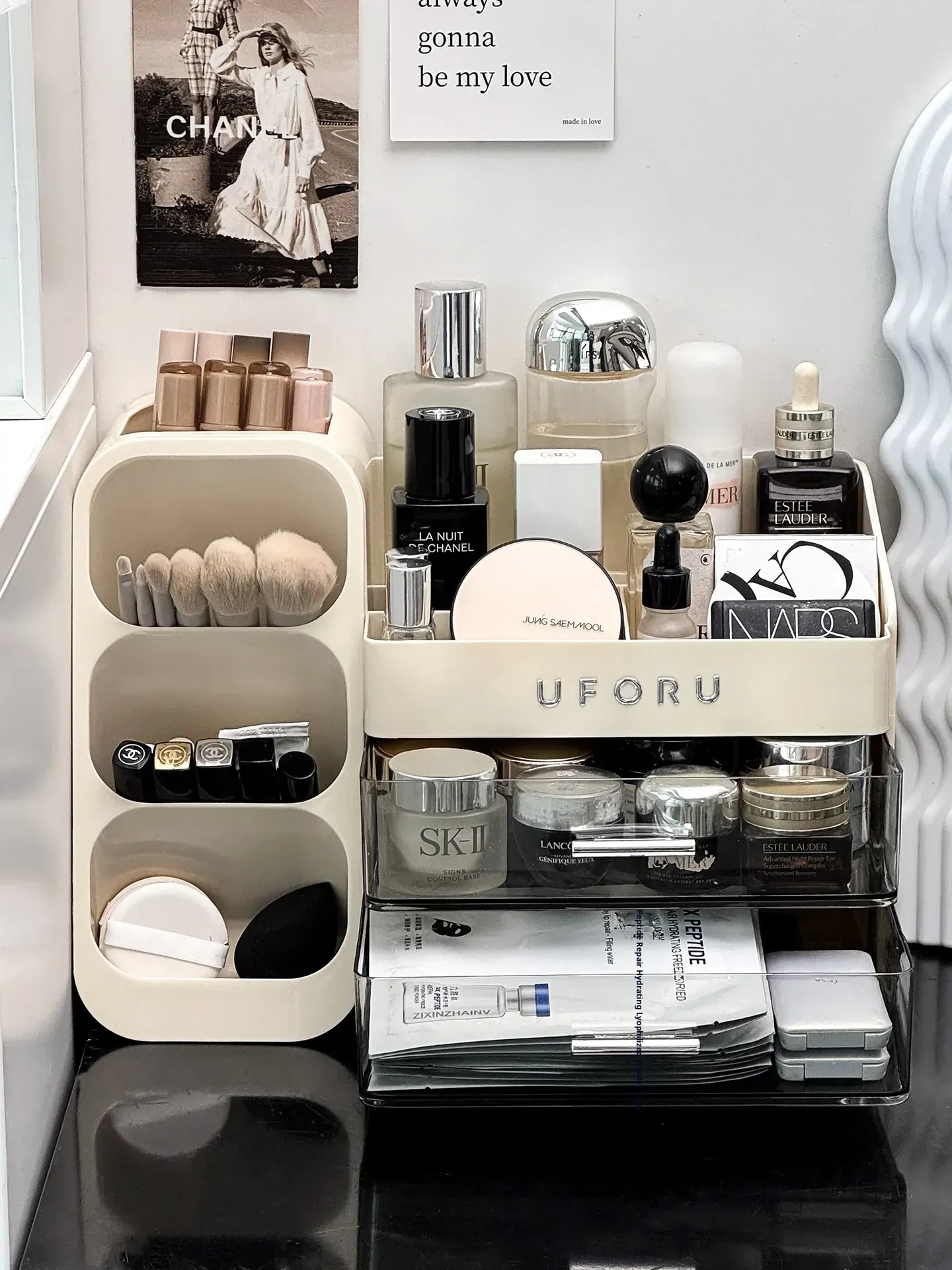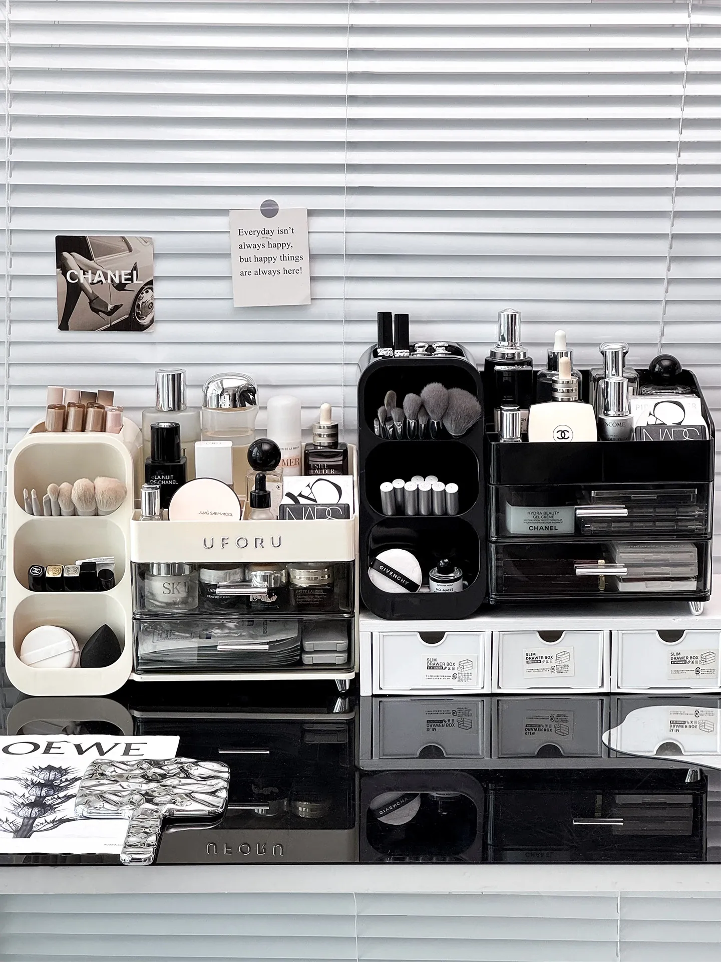 Elegant Desktop Makeup Organizer - Spacious Cosmetic Storage Box for Dressing Table with Drawers and Lipstick Organizer, Perfect for Skincare Products and Beauty Essentials.