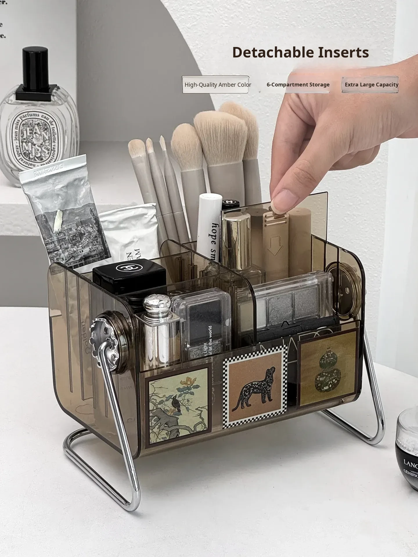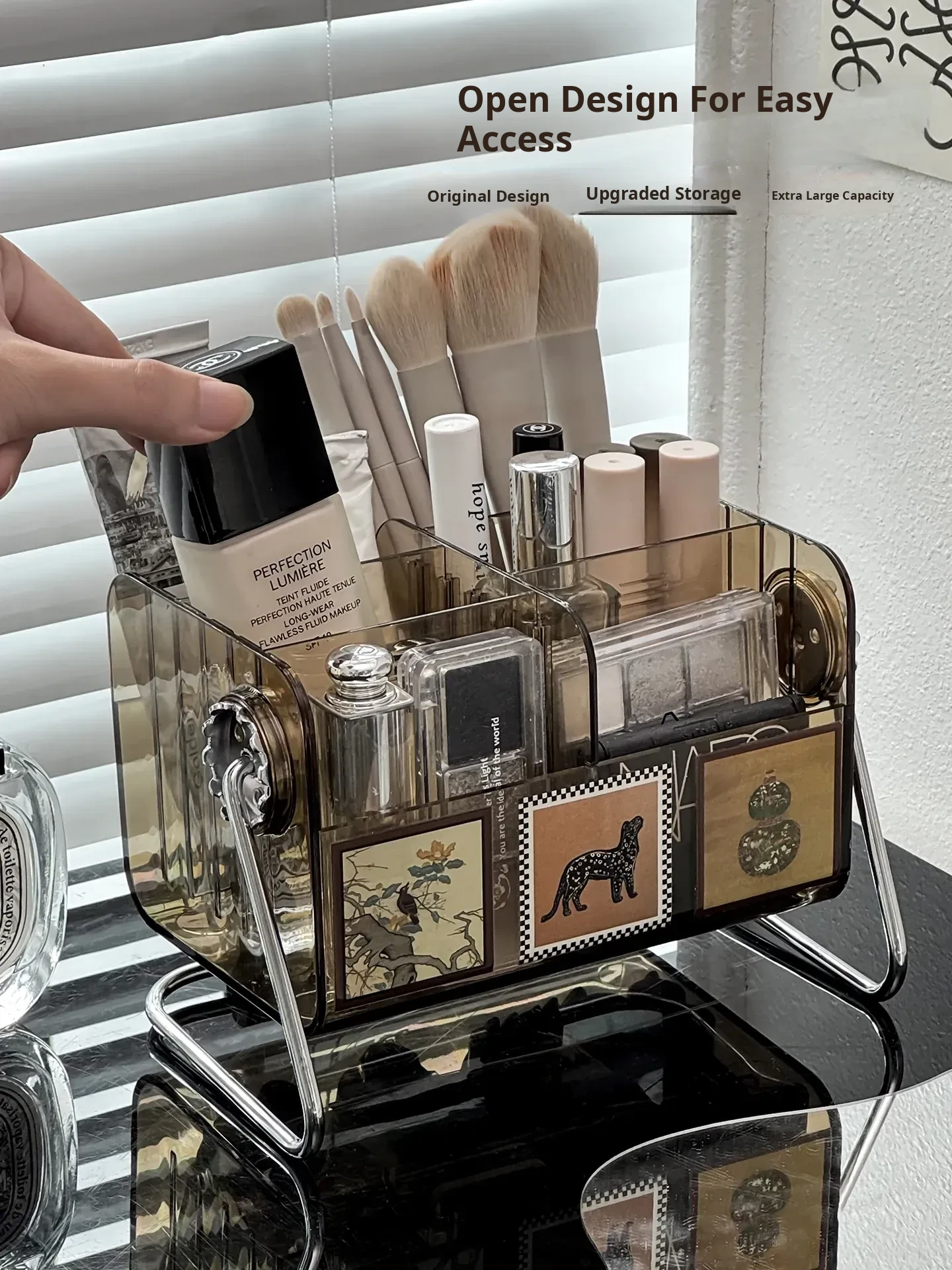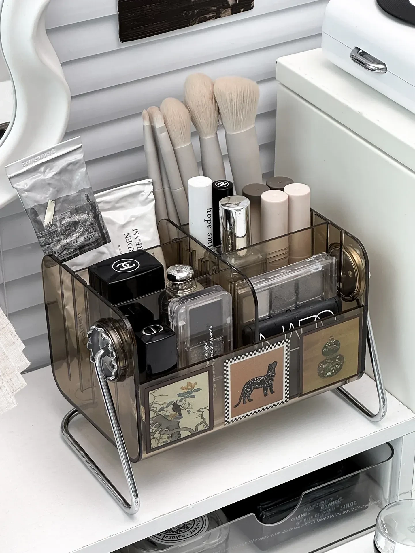 Elegant Rotating Makeup Organizer - Luxury Cosmetic Storage Box with Divided Brush Holder for Desktop, Stylish Lipstick and Eyeshadow Display Rack