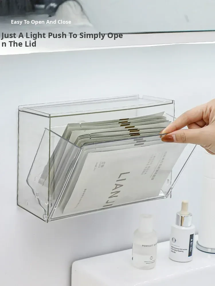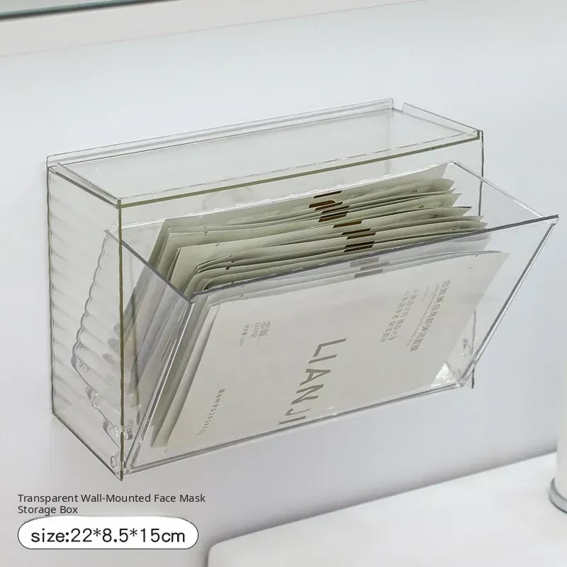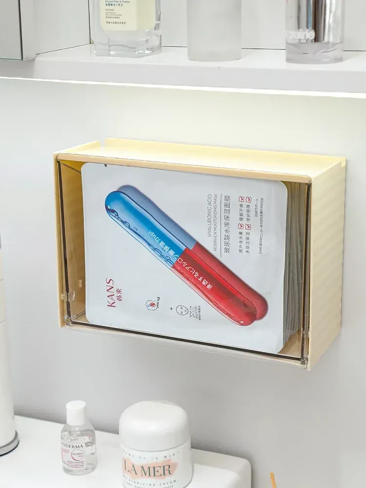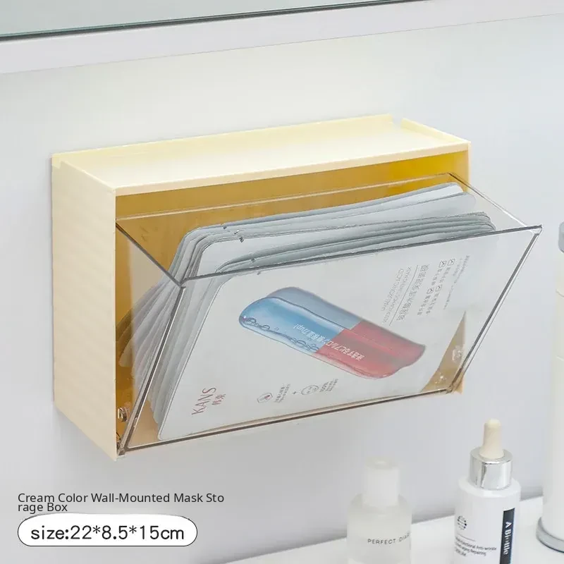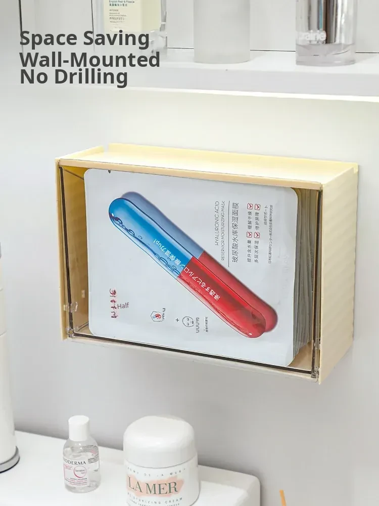 Wall-Mounted Face Mask Organizer Box - No Drill, Transparent Dustproof Skincare Storage for Bathroom - Stylish Cosmetic Holder with Easy Access