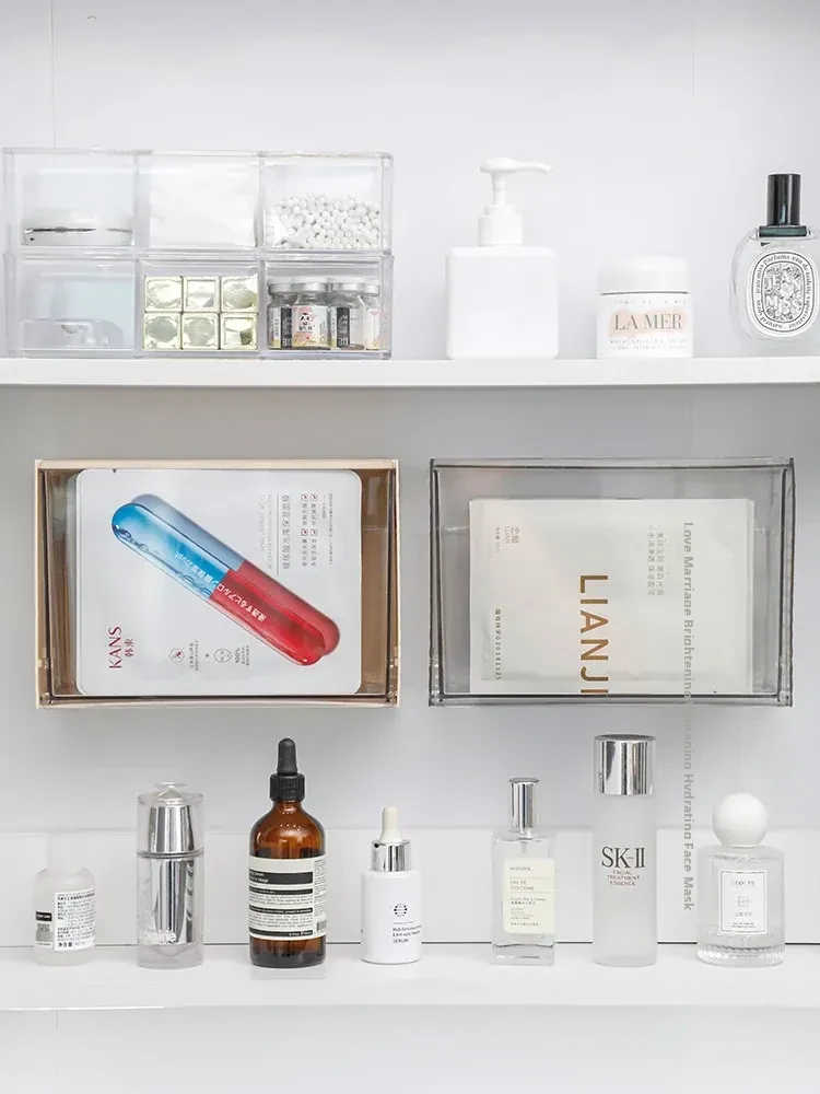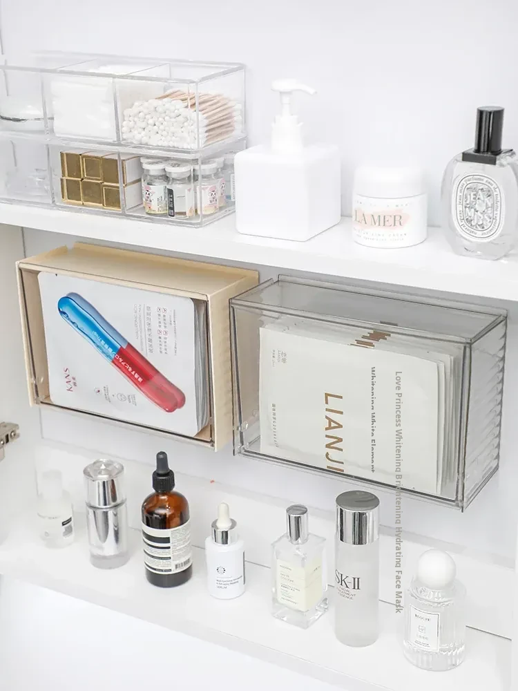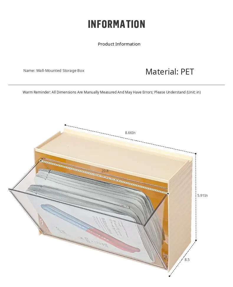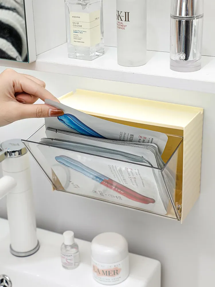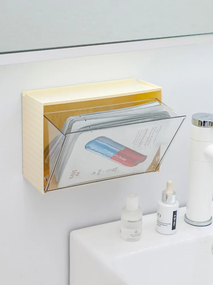 Wall-Mounted Face Mask Organizer Box - No Drill, Transparent Dustproof Skincare Storage for Bathroom - Stylish Cosmetic Holder with Easy Access
