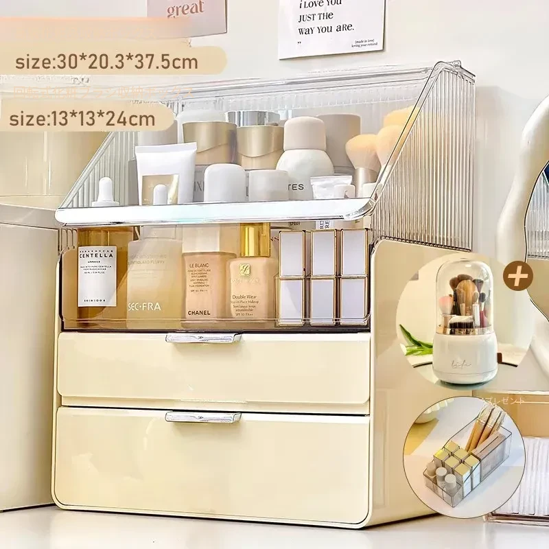 クリーム色セット【アップグレード超大容量♥リップケース付き】化粧ボックス+回転ブラシ筒
