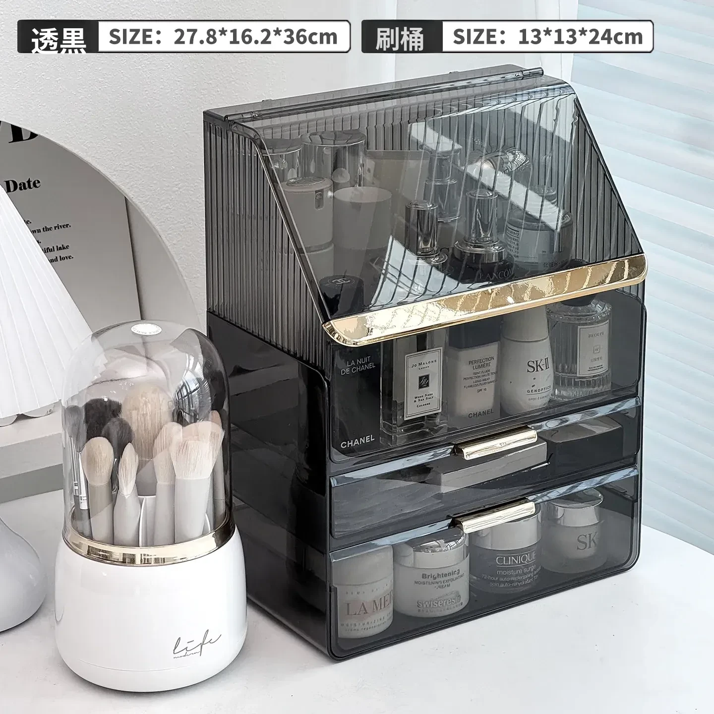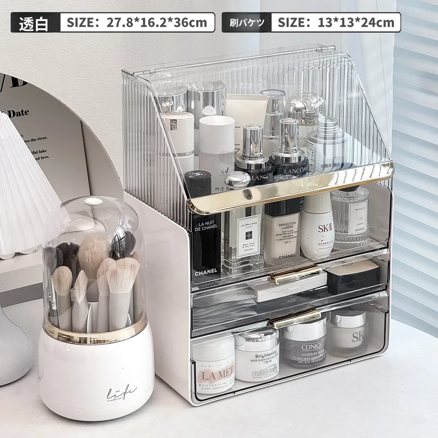 【高見えセット-大】高級ホワイトトランスペアレント化粧ボックス+シンプルホワイト回転ブラシ筒
