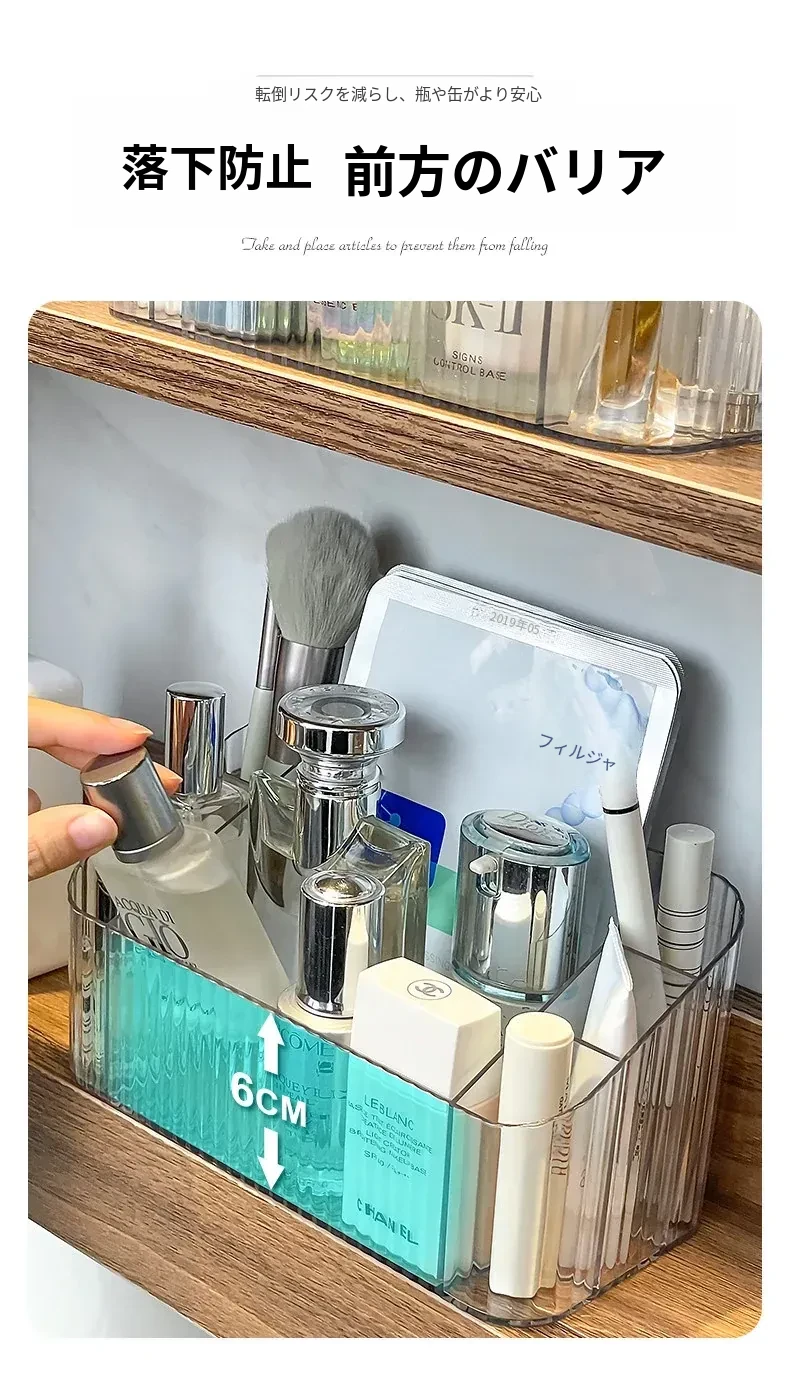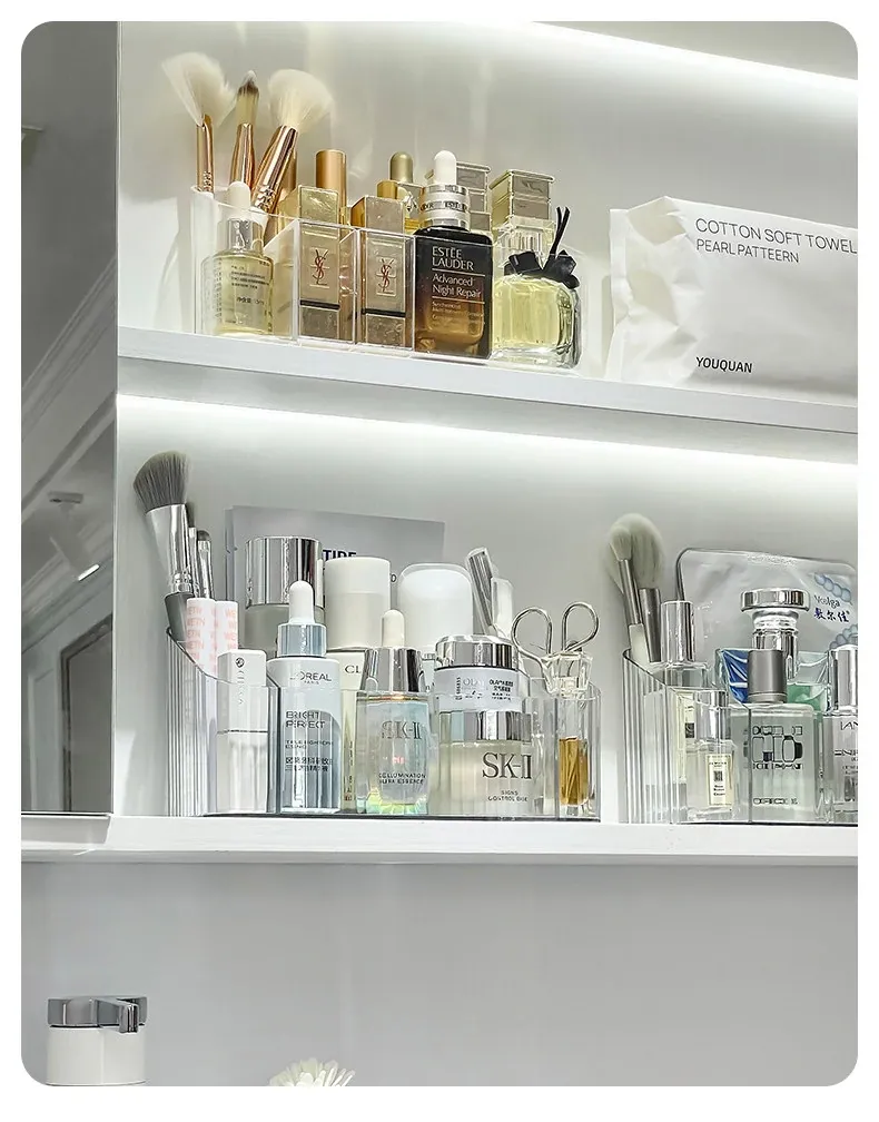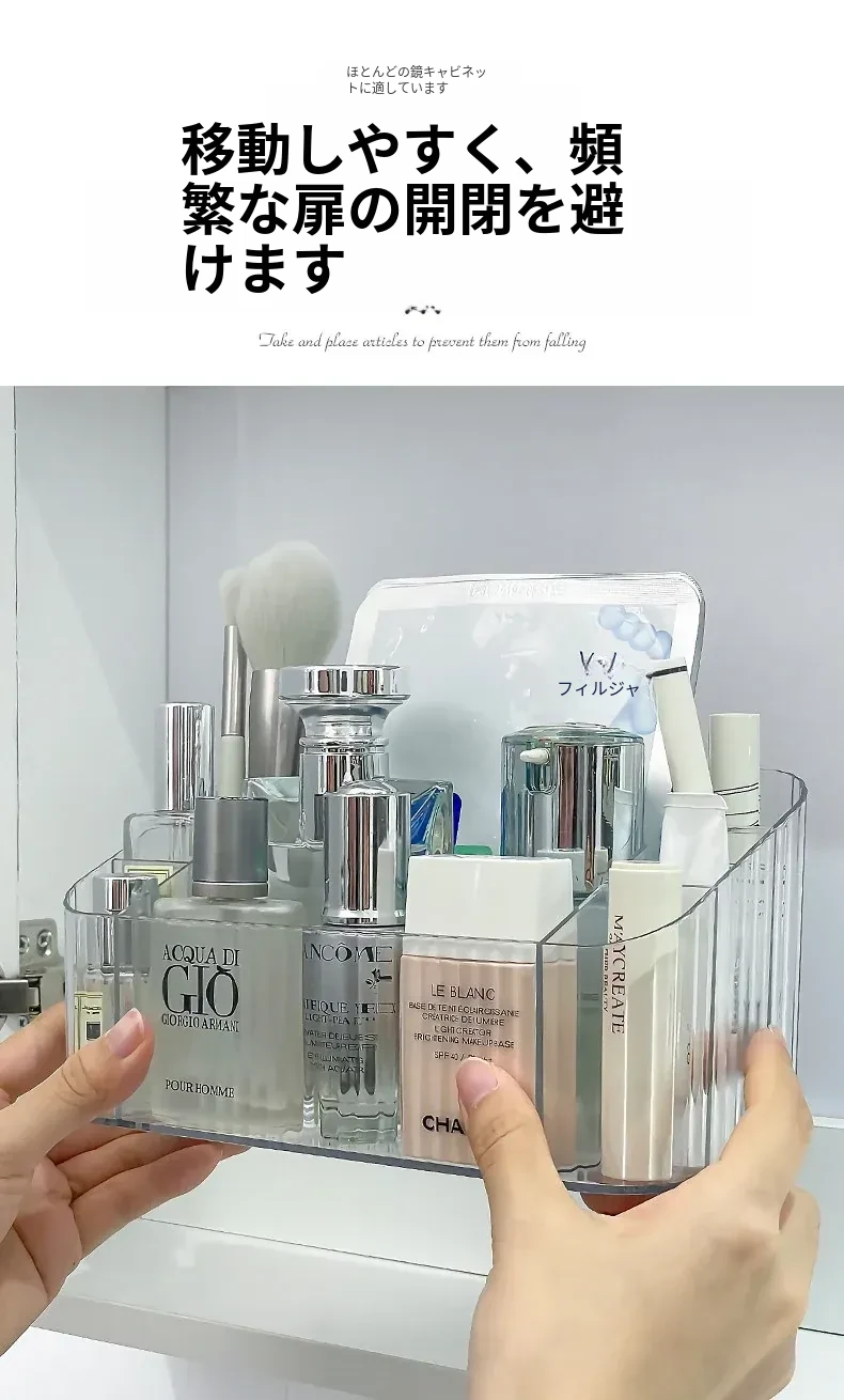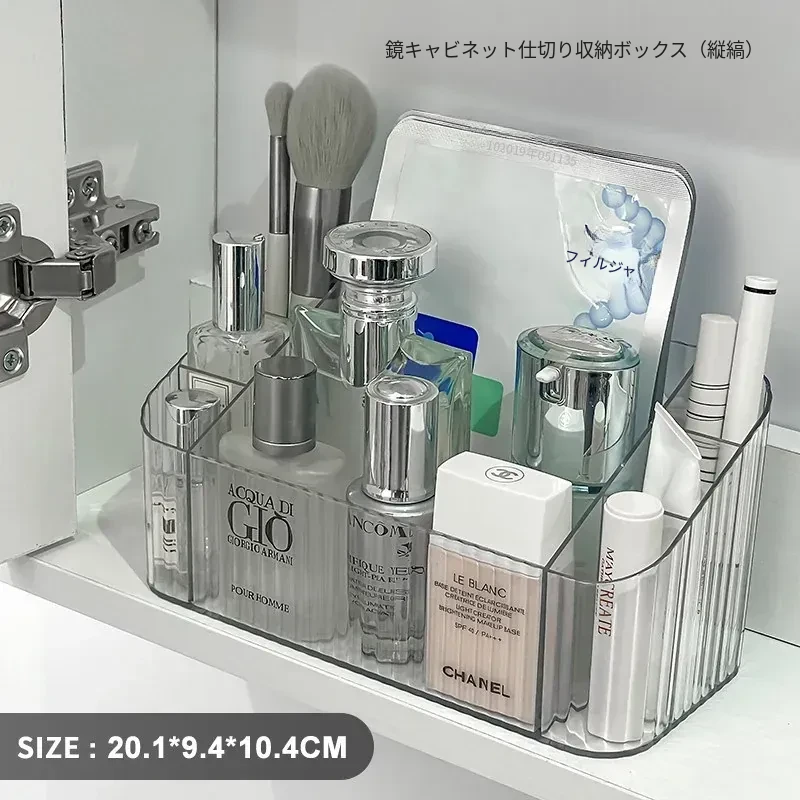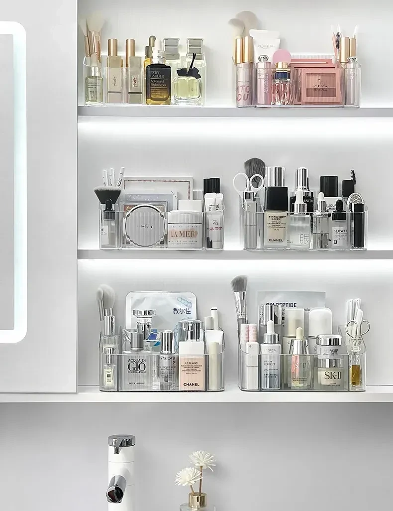 透明アクリル製化粧品収納ボックス - バスルームミラーキャビネット用分割整理トレー。メイクブラシやリップスティックを美しく整理し、スタイリッシュな空間を演出!