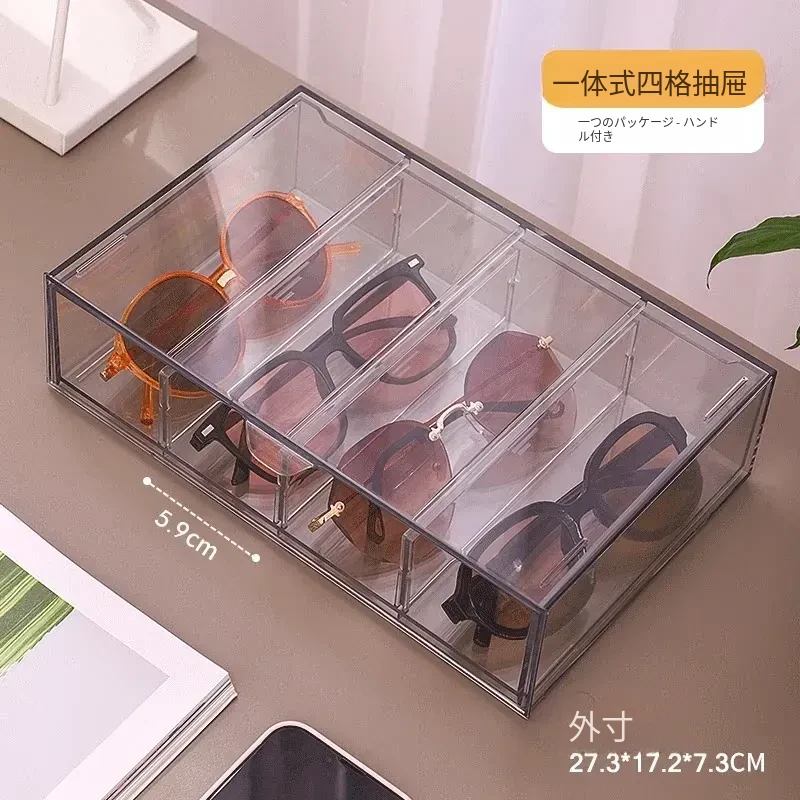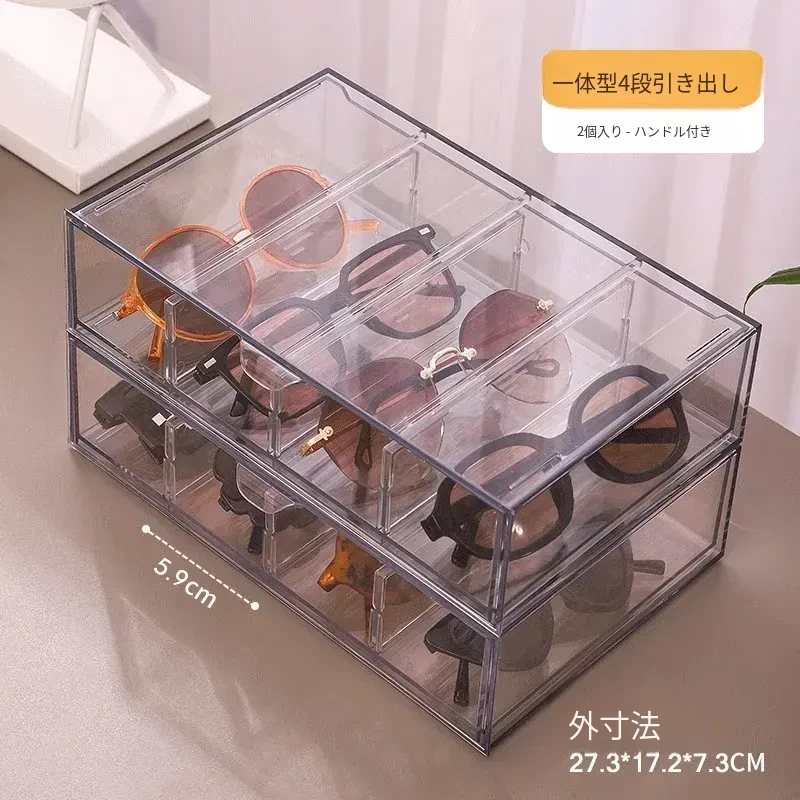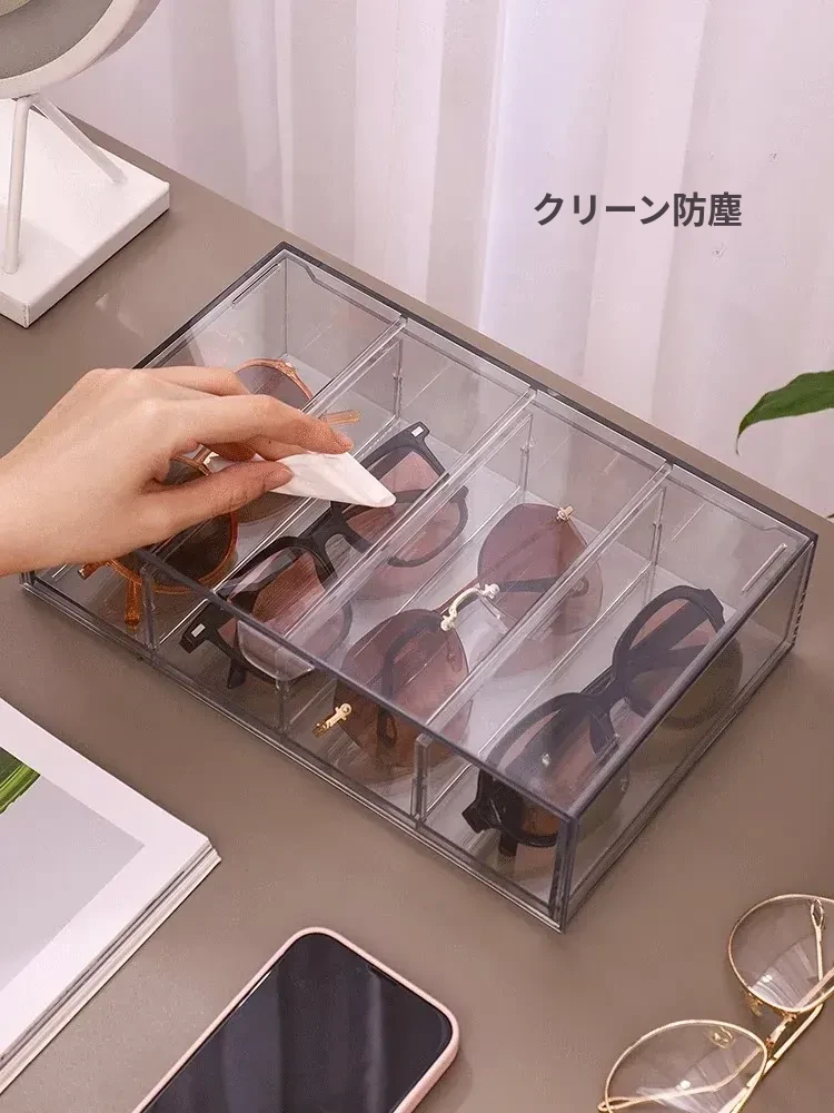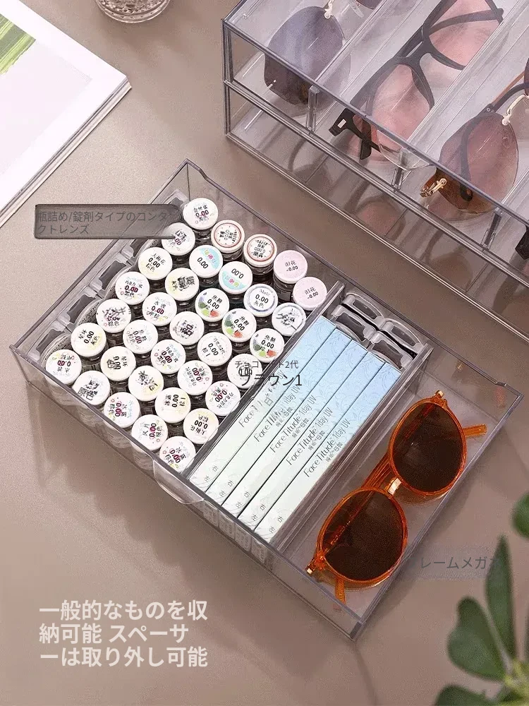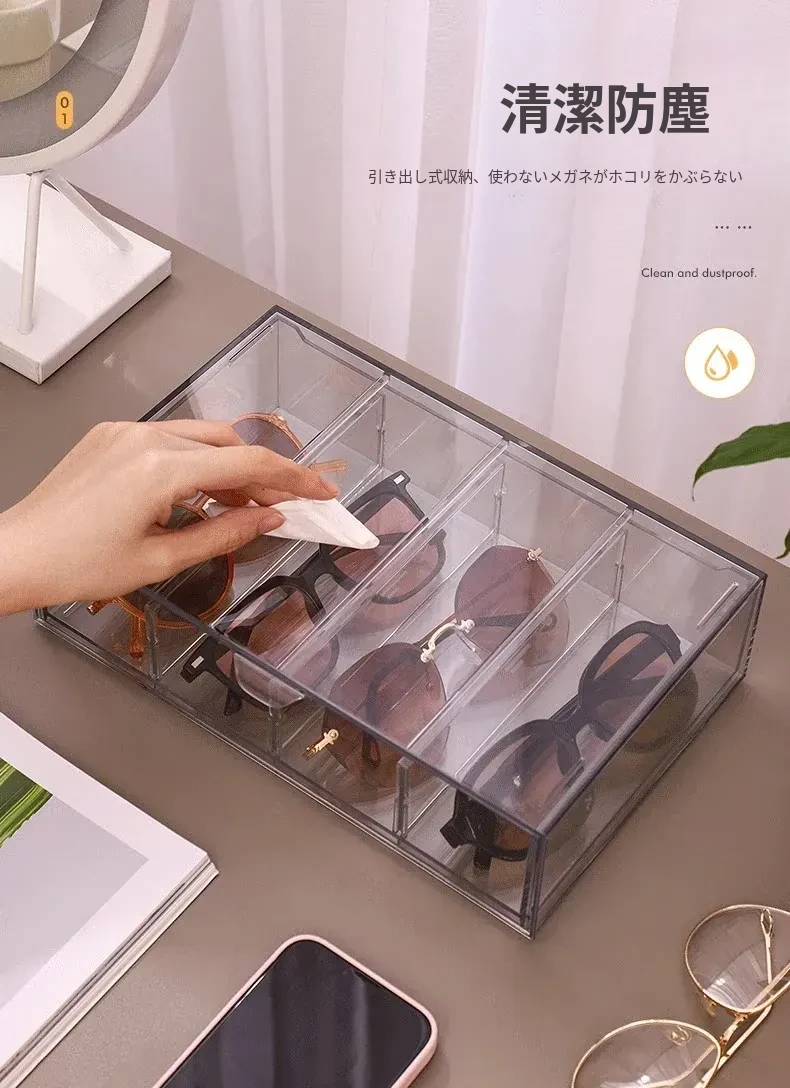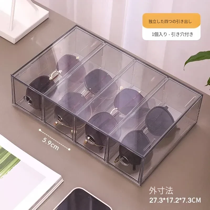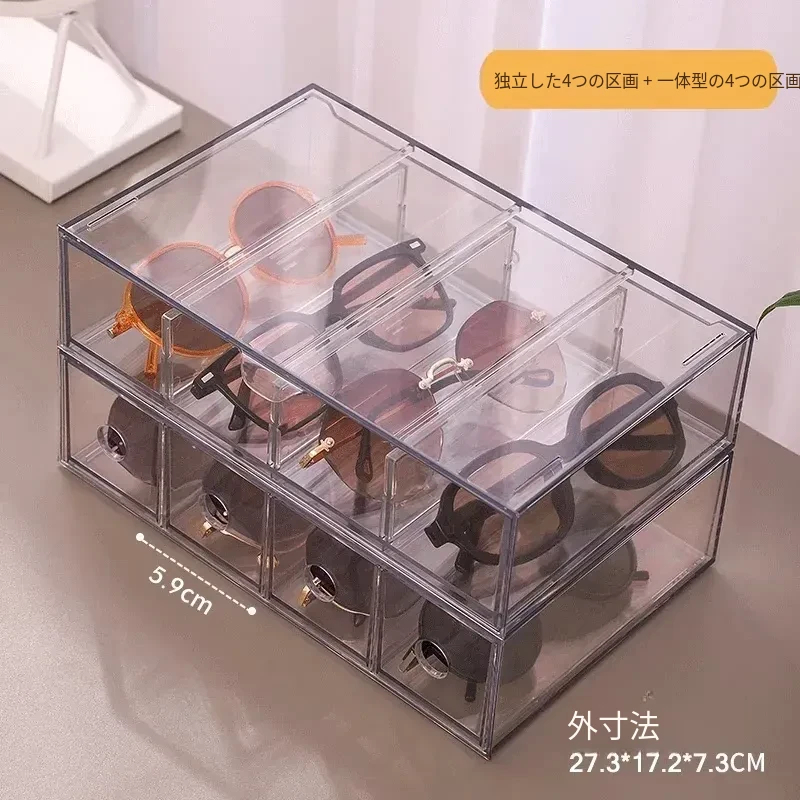 アクリル製デスク用メガネ・サングラス収納ボックス 抽屉仕切り付き 透明防塵 重ねて使える化粧品・リップ収納ラック!おしゃれで実用的な整理整頓アイテム!