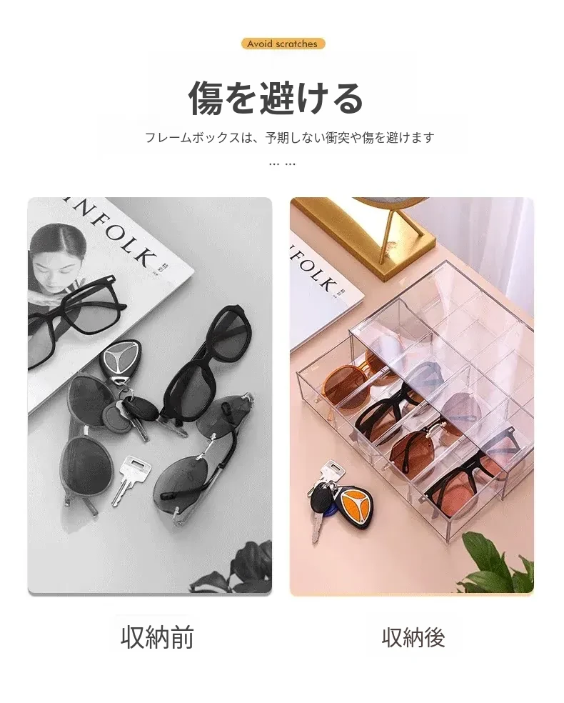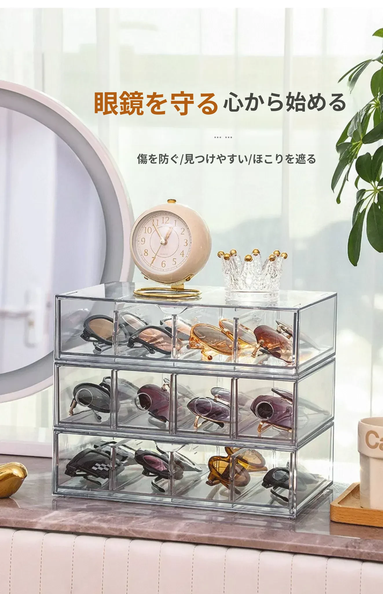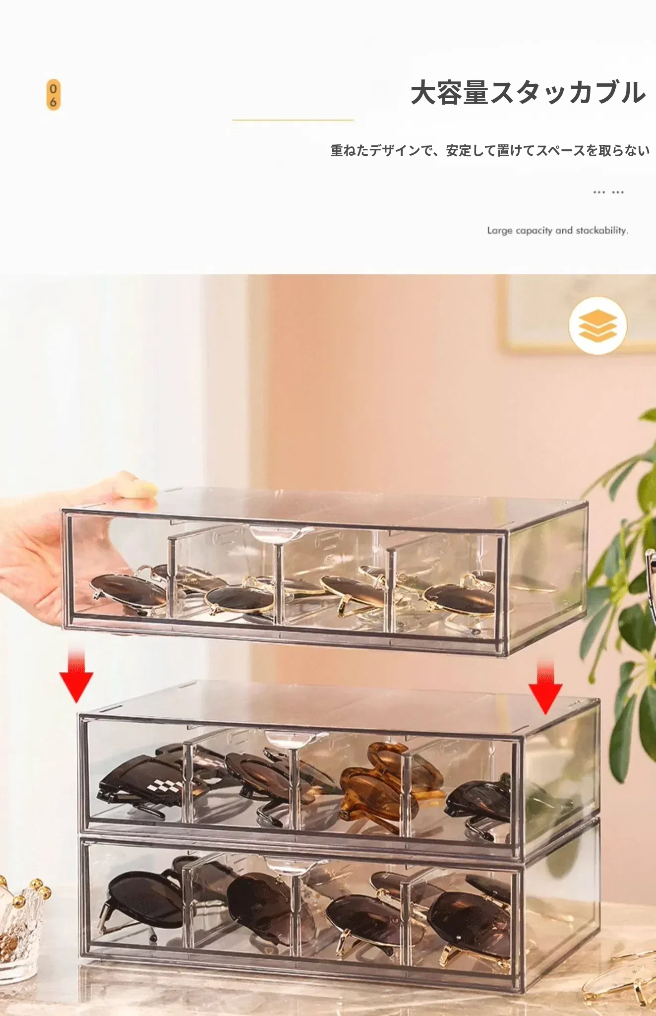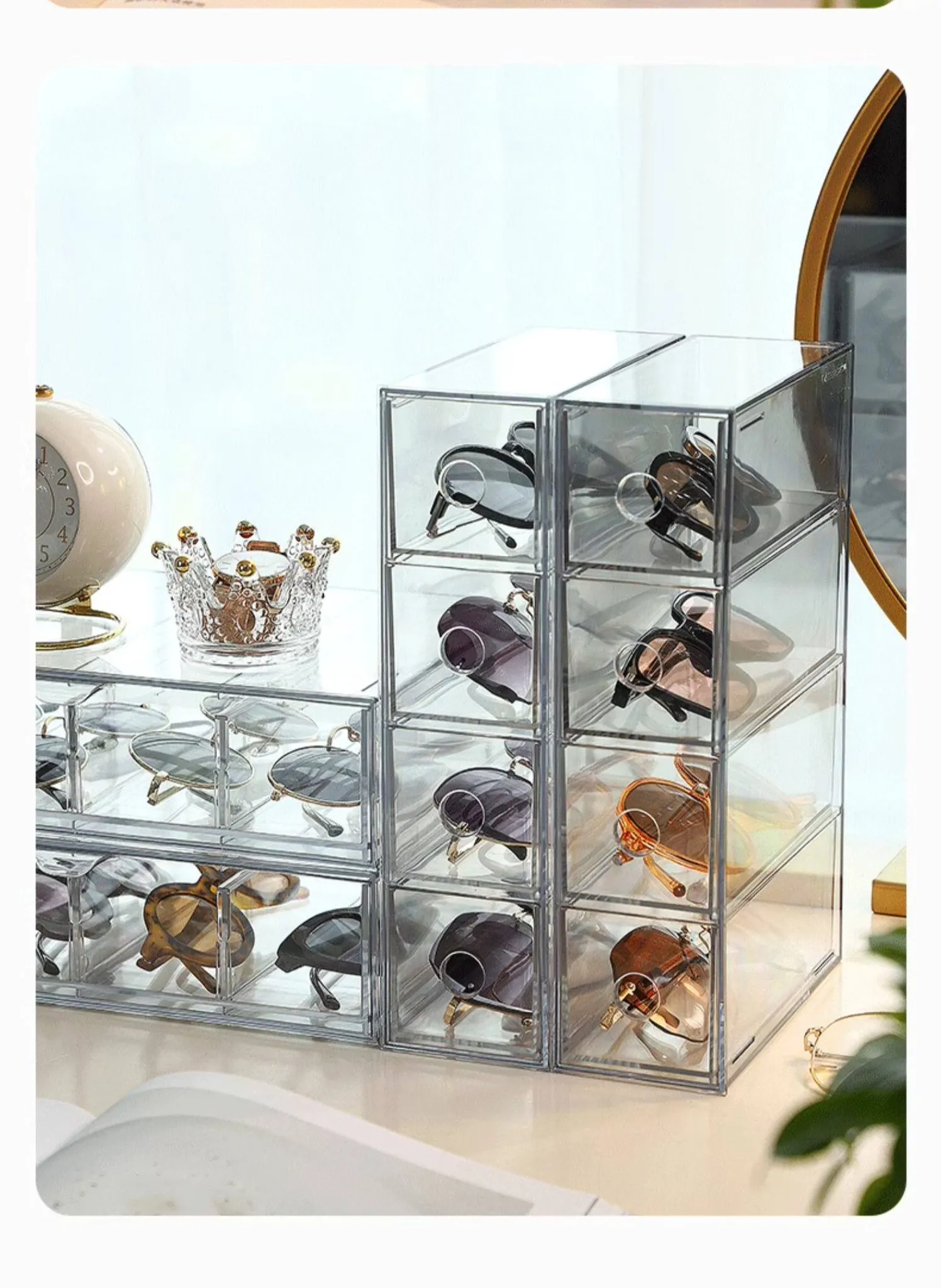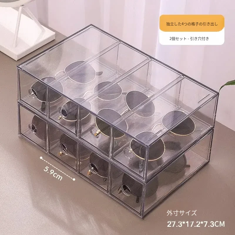 アクリル製デスク用メガネ・サングラス収納ボックス 抽屉仕切り付き 透明防塵 重ねて使える化粧品・リップ収納ラック!おしゃれで実用的な整理整頓アイテム!