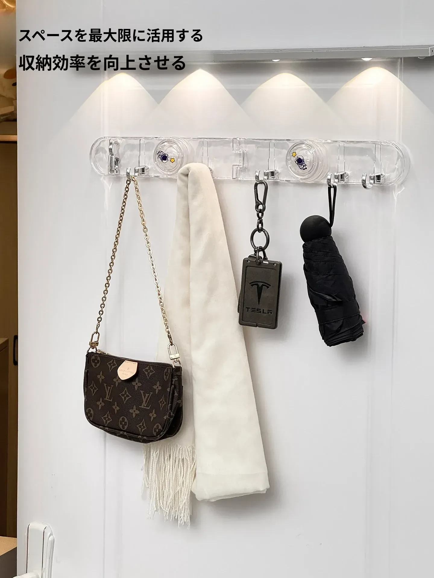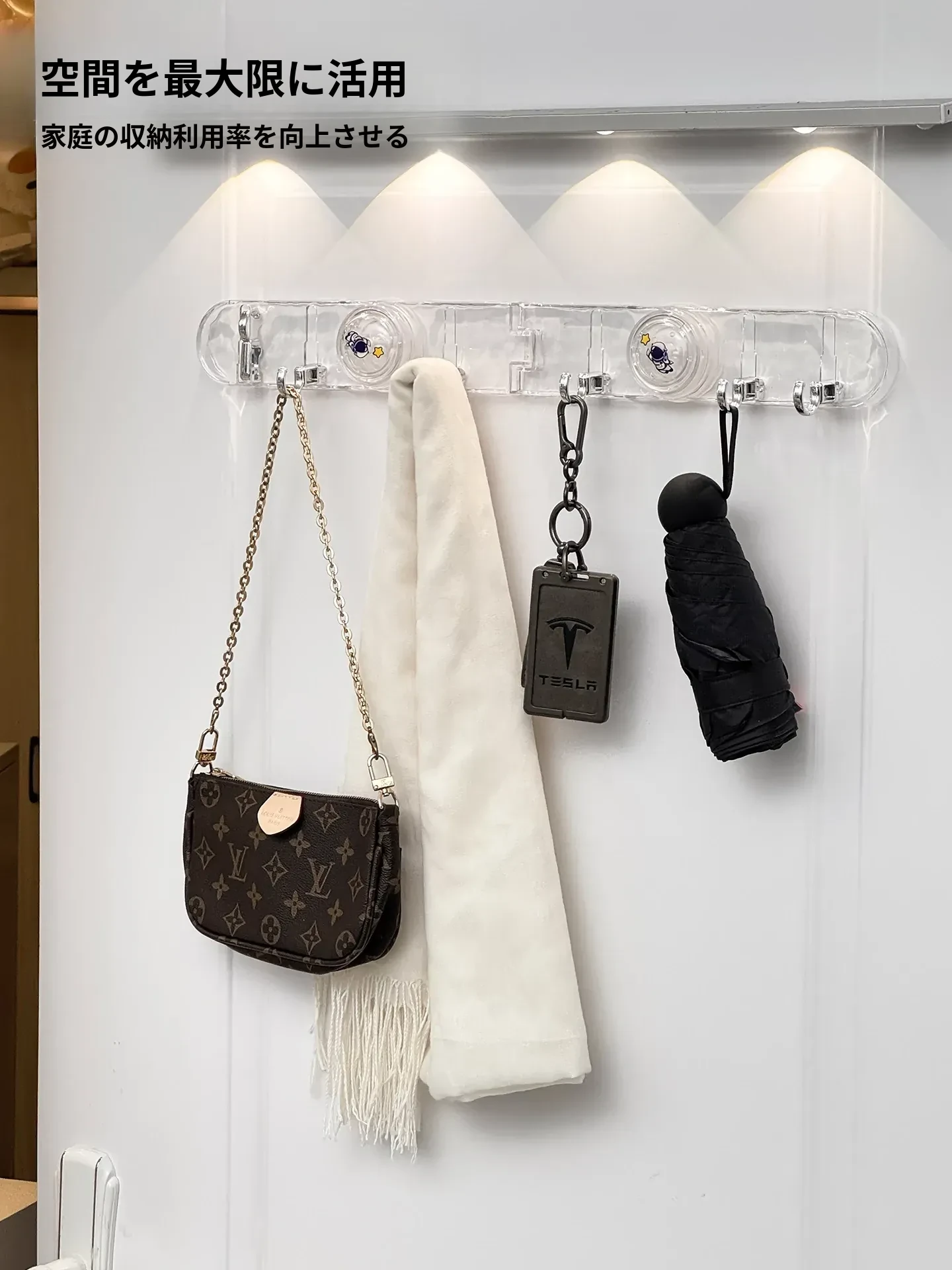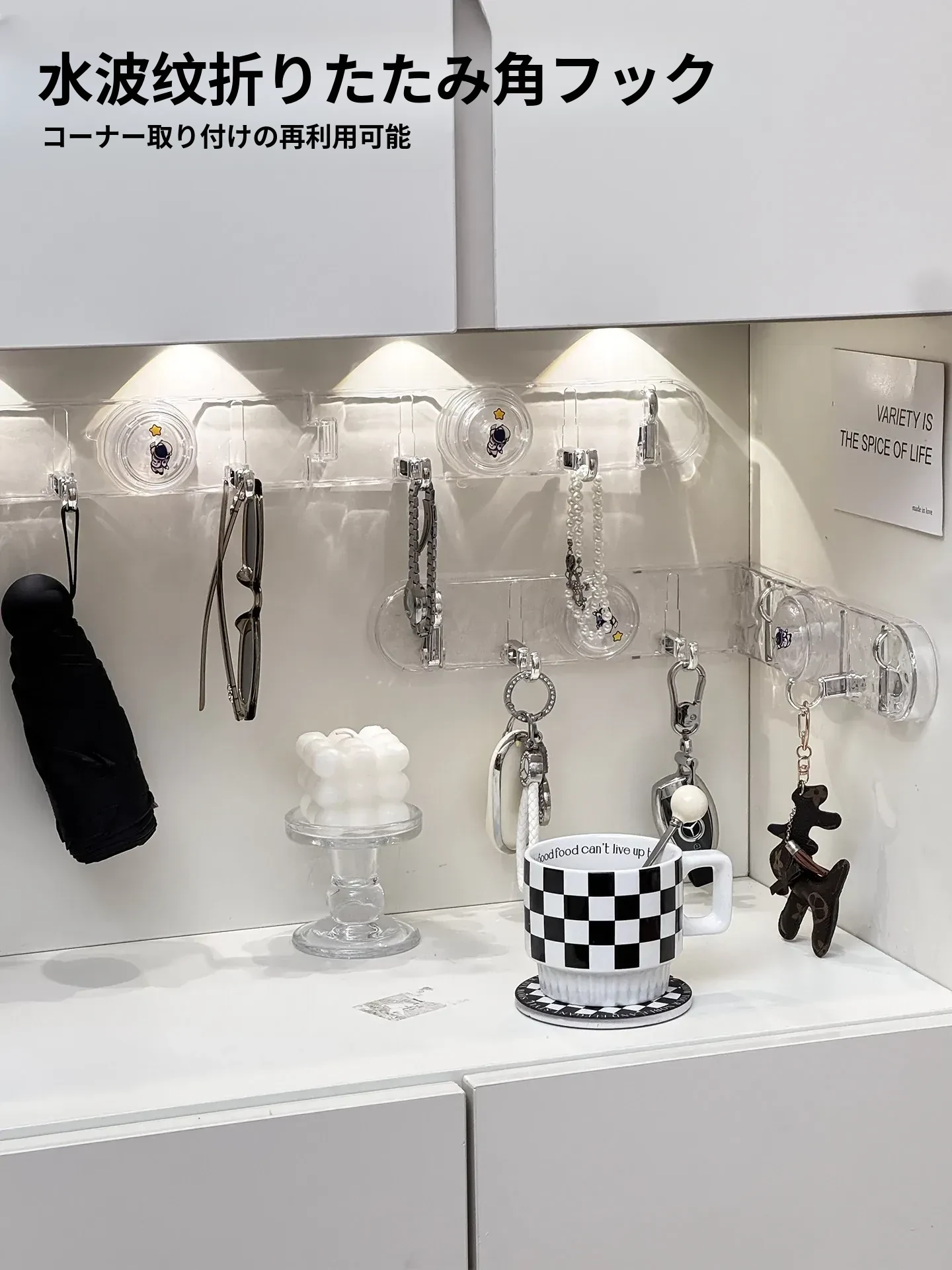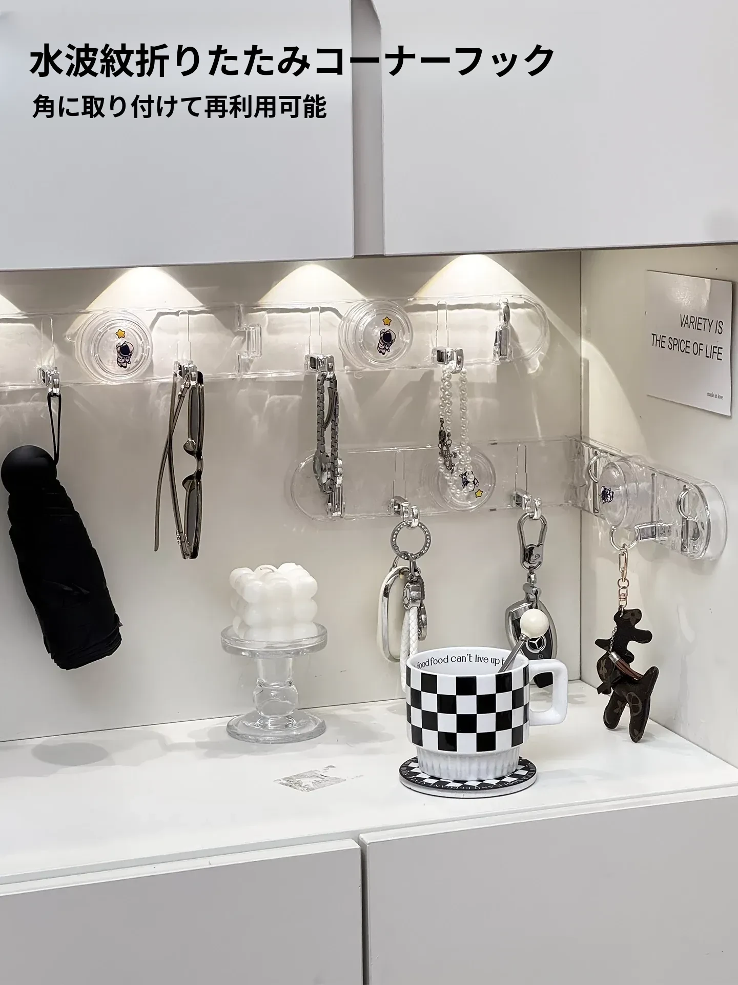 玄関用吸盤型コーナー連結フック!入室ドアの裏に隠せる折りたたみ式収納ラックで、鍵や帽子をスッキリ整理。スペースを有効活用して、すっきりした玄関を実現!