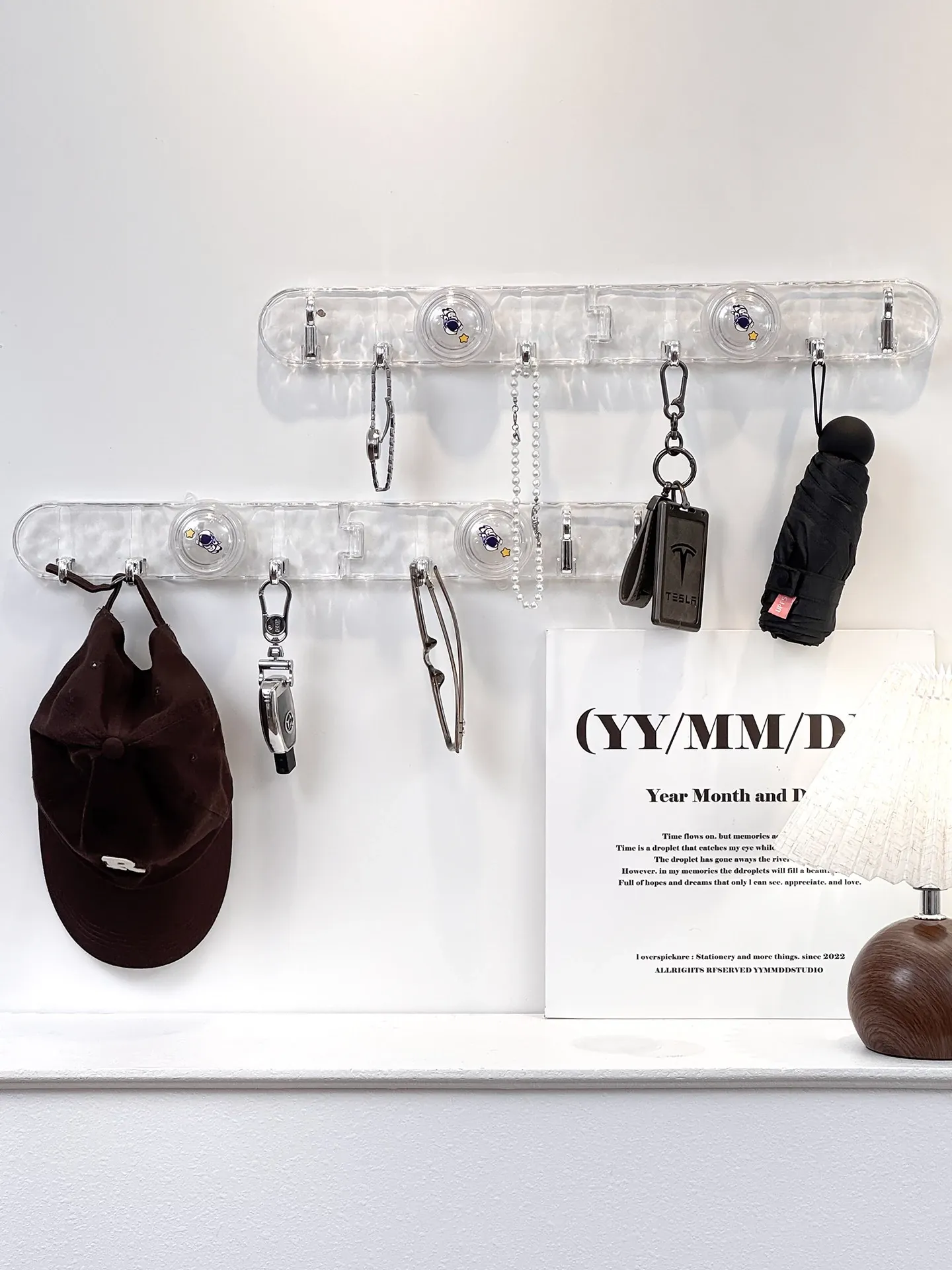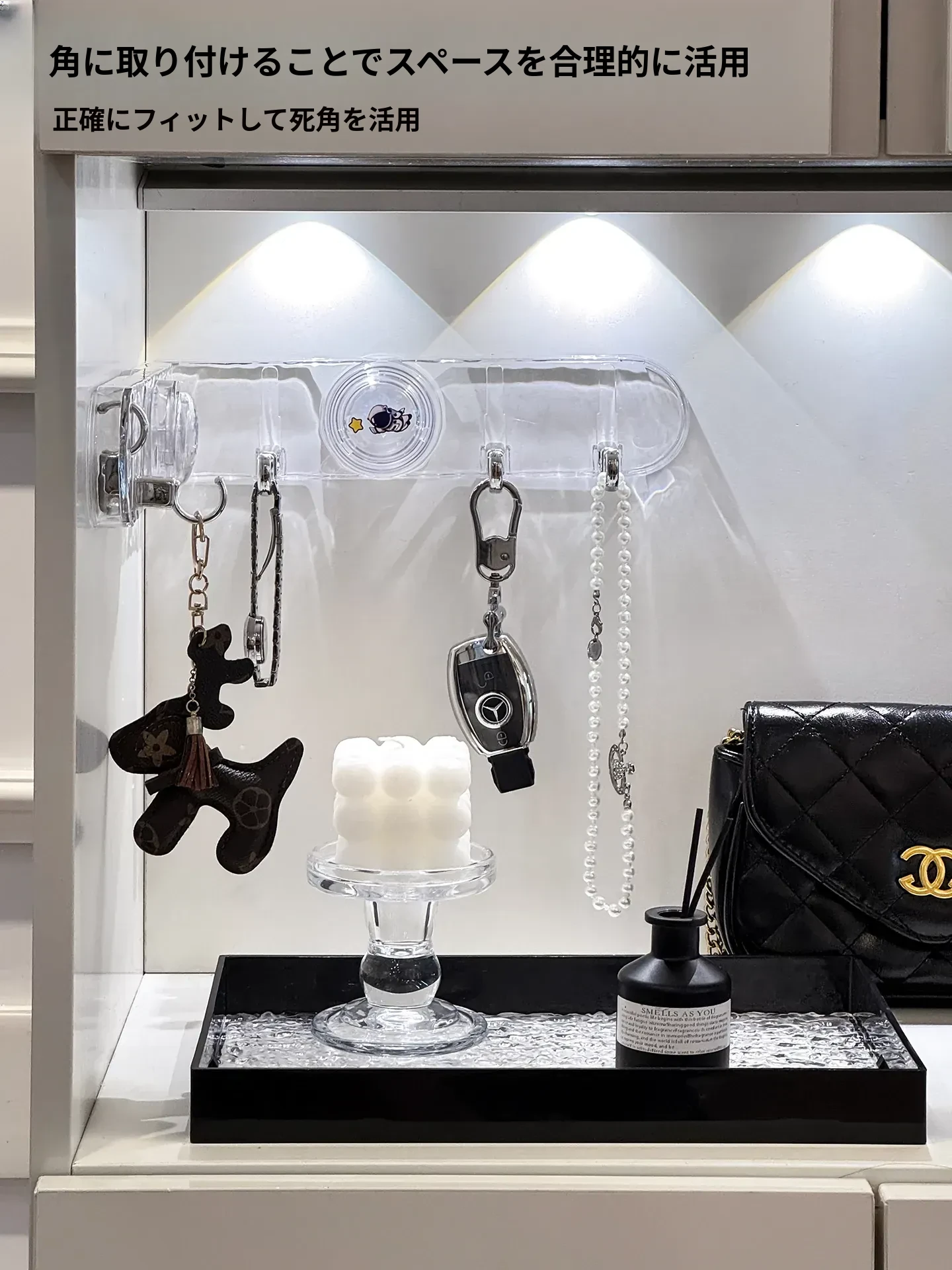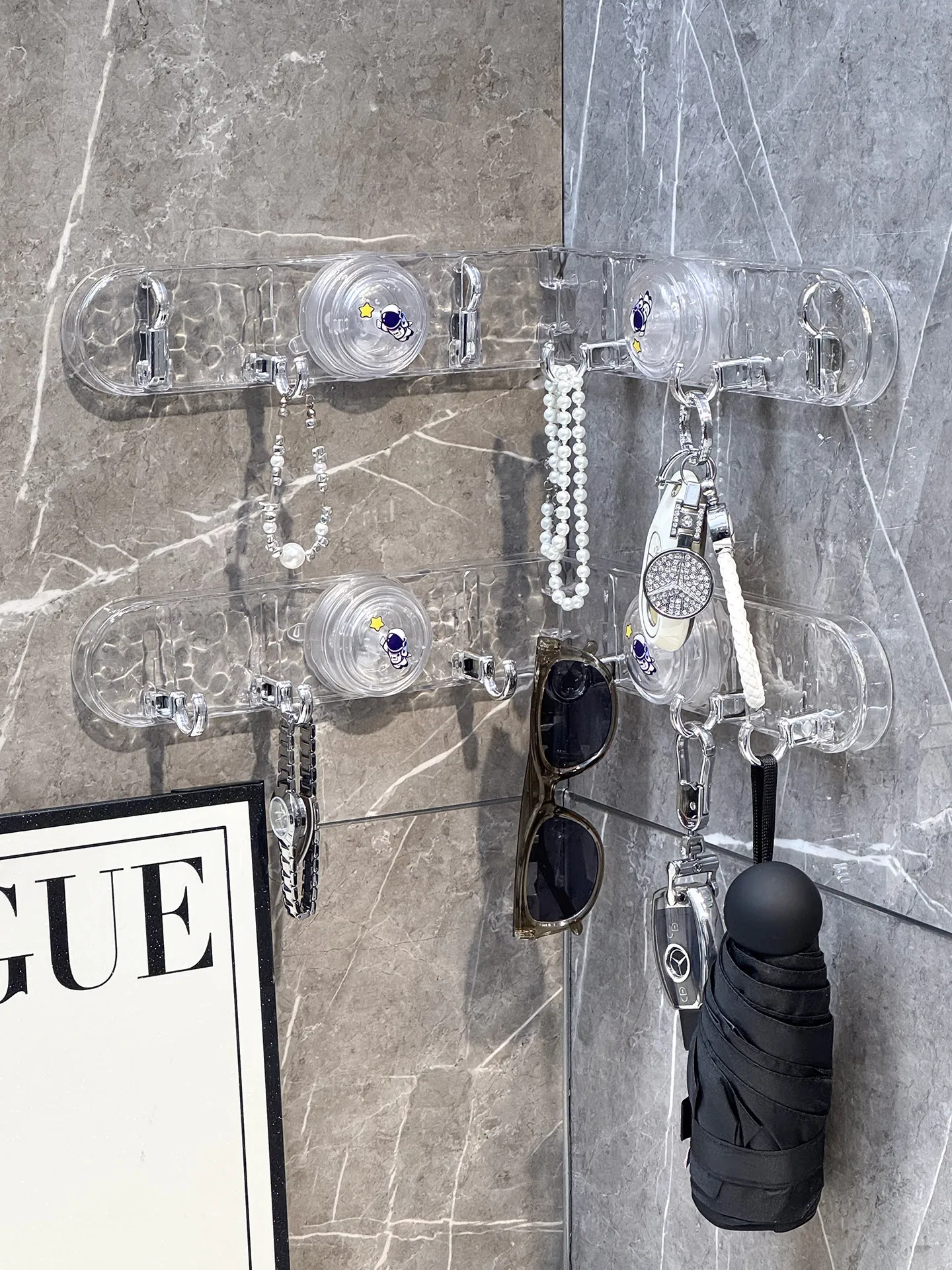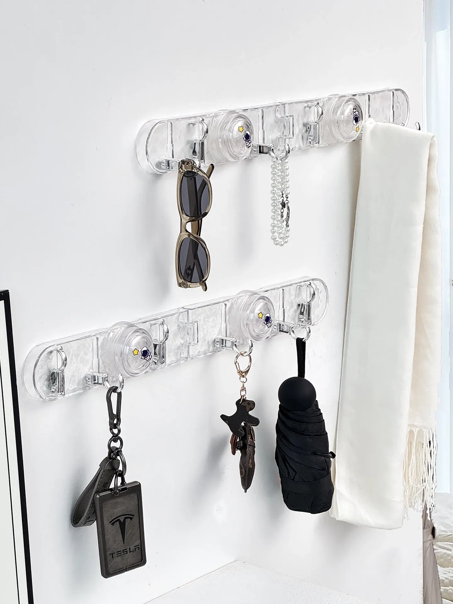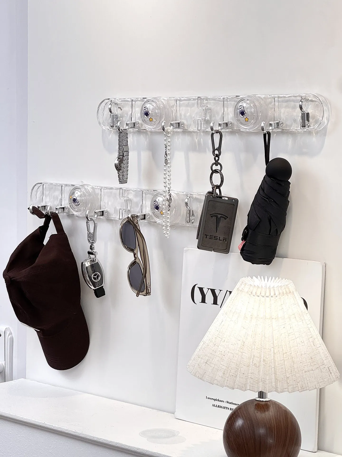 玄関用吸盤型コーナー連結フック!入室ドアの裏に隠せる折りたたみ式収納ラックで、鍵や帽子をスッキリ整理。スペースを有効活用して、すっきりした玄関を実現!