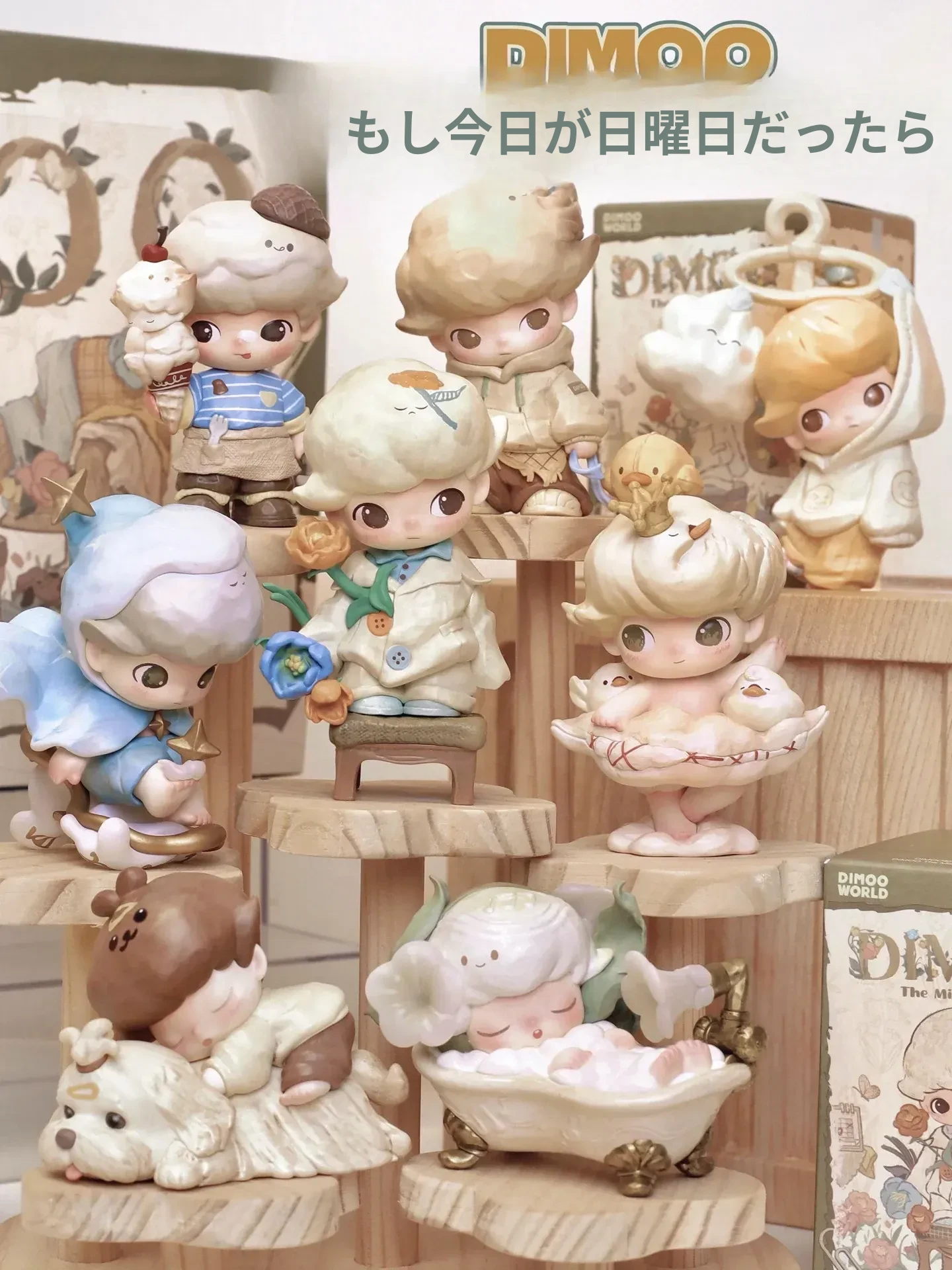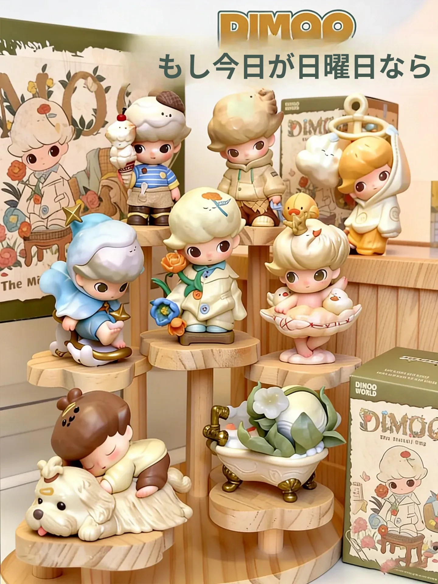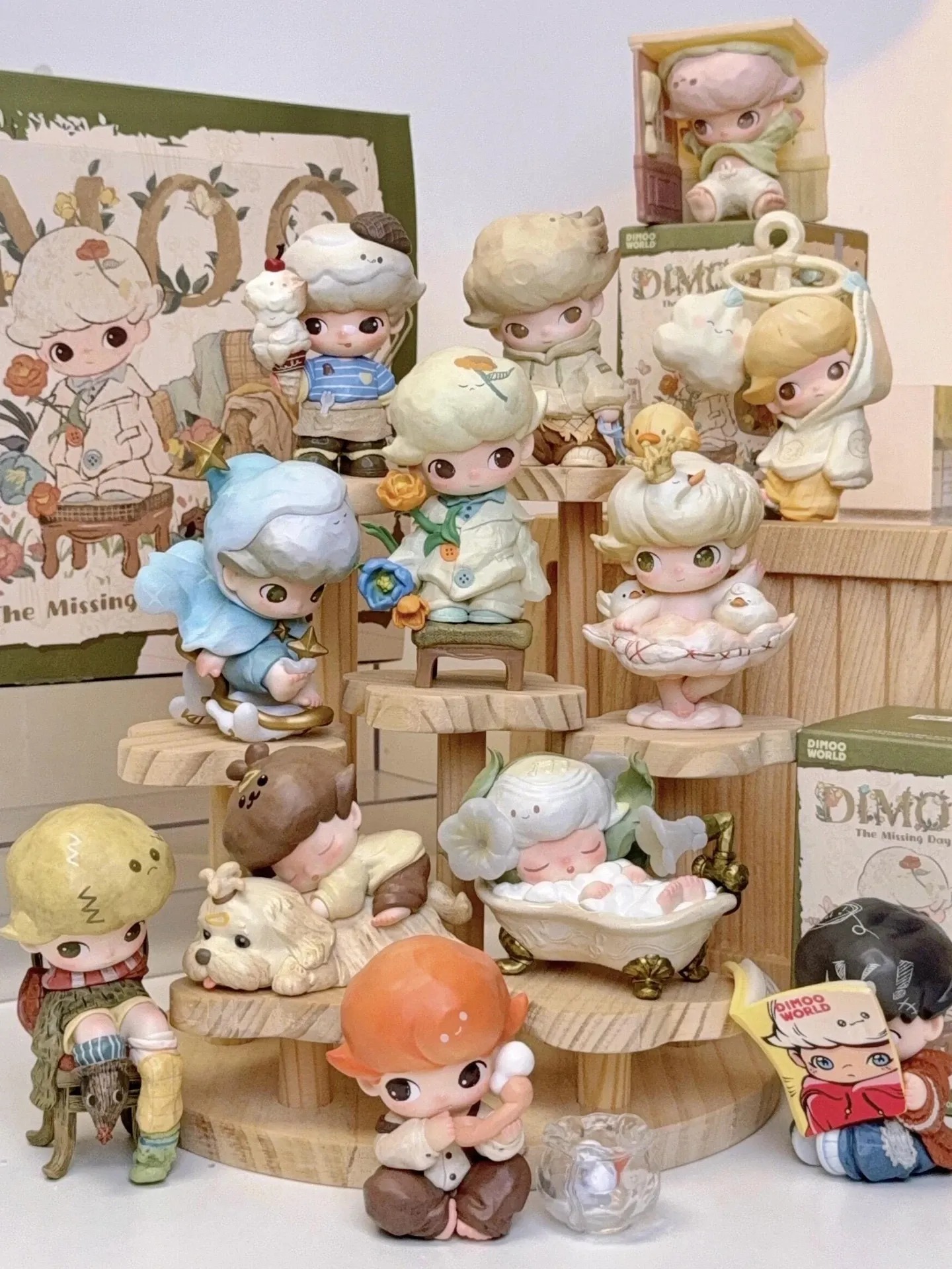 DIMOOコレクション用階段式ディスプレイラック - おしゃれな木製の盲箱収納で、あなたのフィギュアを魅力的に飾ろう!収納と展示を兼ね備えたアイテムで、部屋をスタイリッシュに演出します。