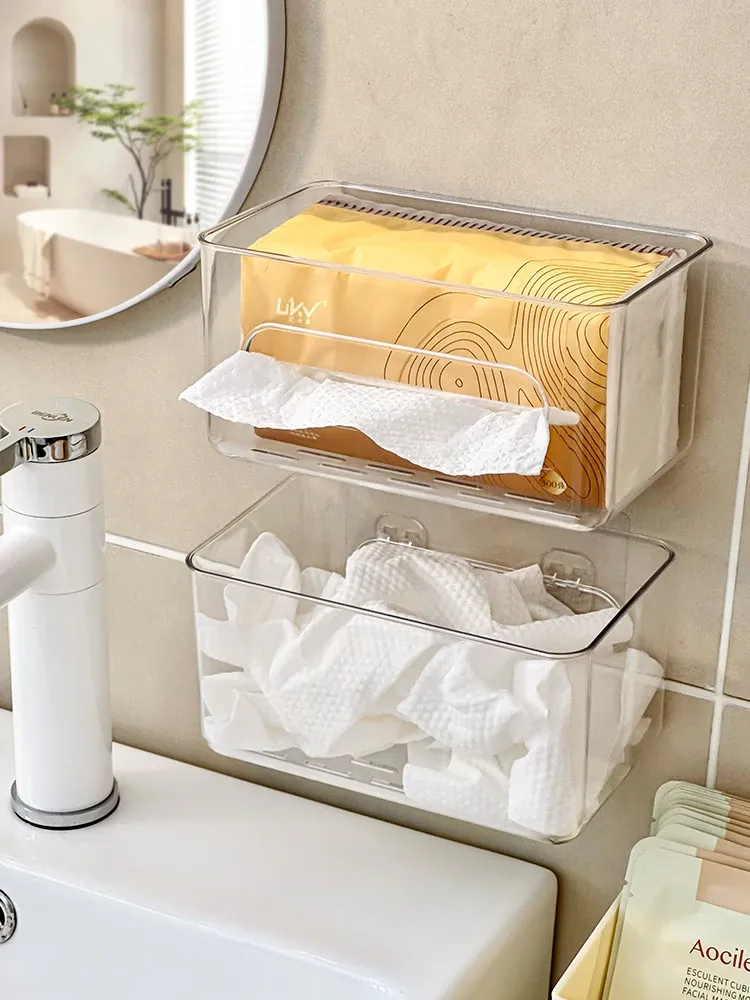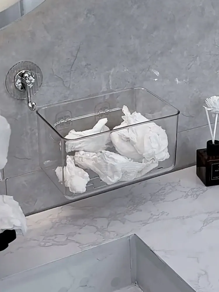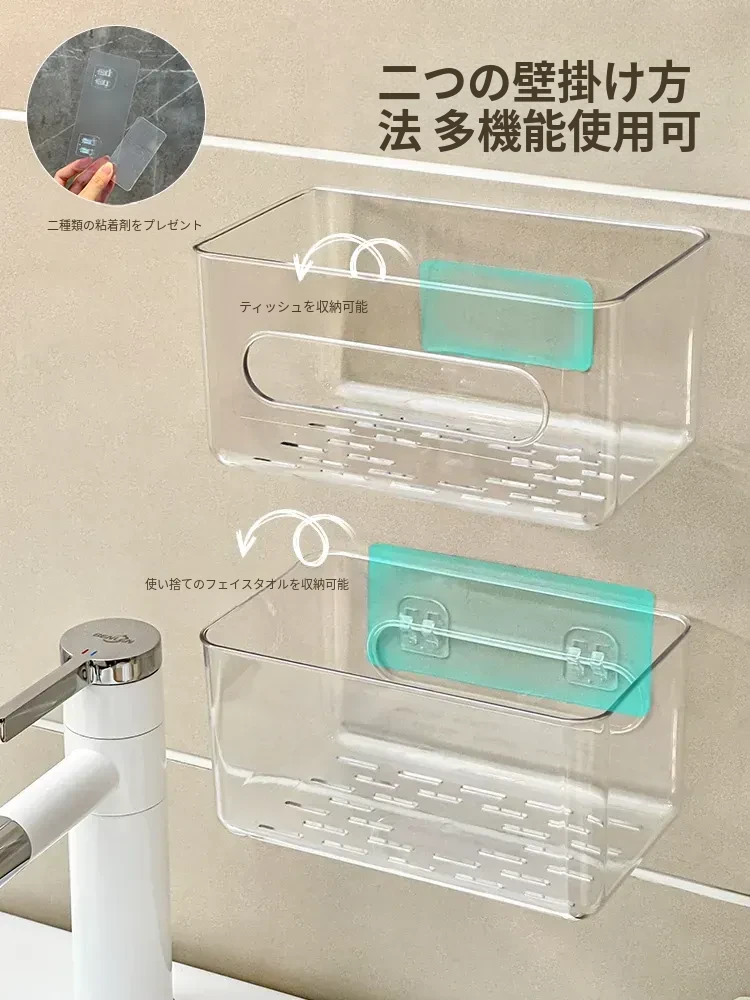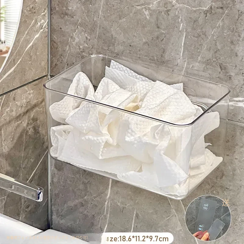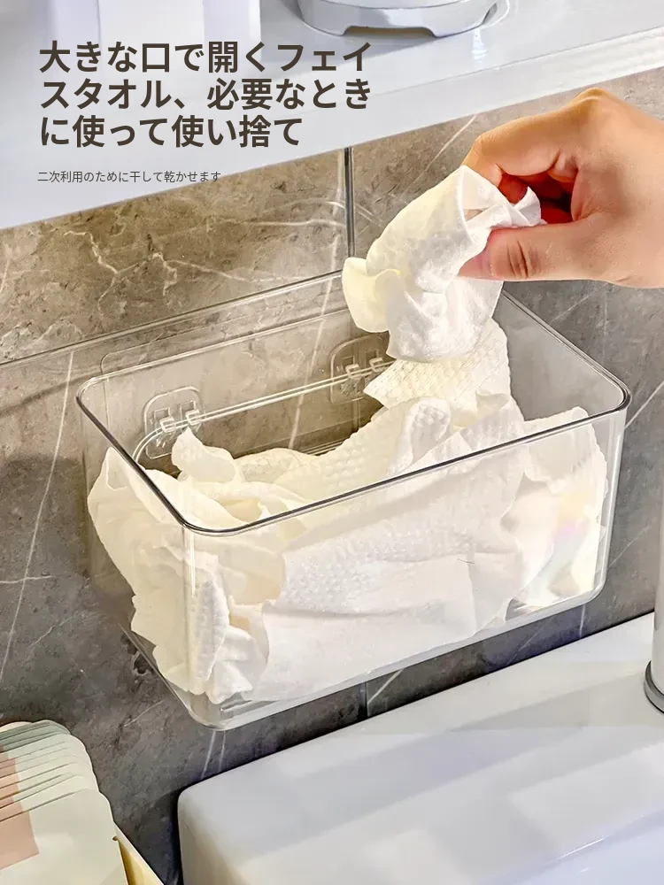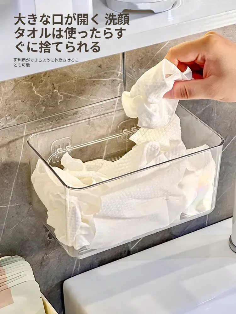 使い捨てフェイスタオル収納ボックス - 浴室壁掛けタイプ、柔らかい使い捨てペーパータオル、便利な水切りハンギングバスケット!清潔でスタイリッシュな収納で、毎日の洗顔がもっと快適に!