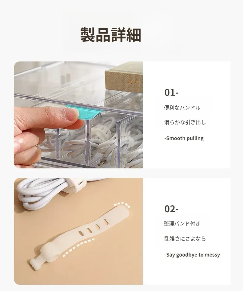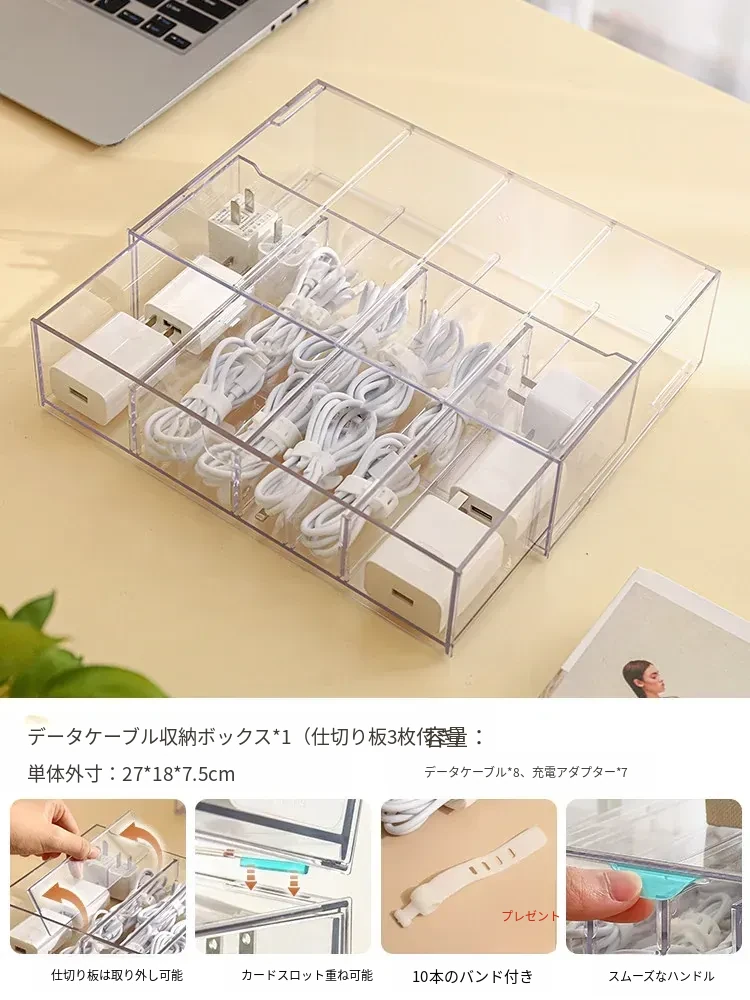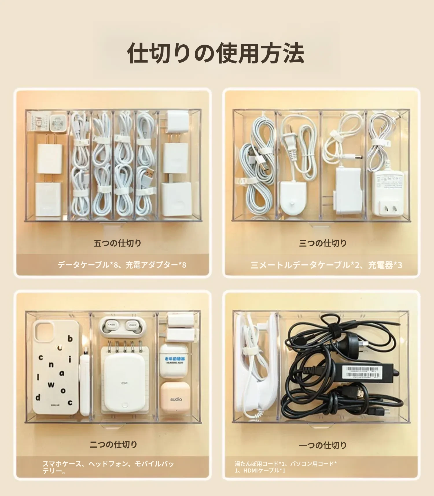 【2個セット-仕切り付き-20本のケーブルタイ付き】三口プラグ抽斗収納ボックス