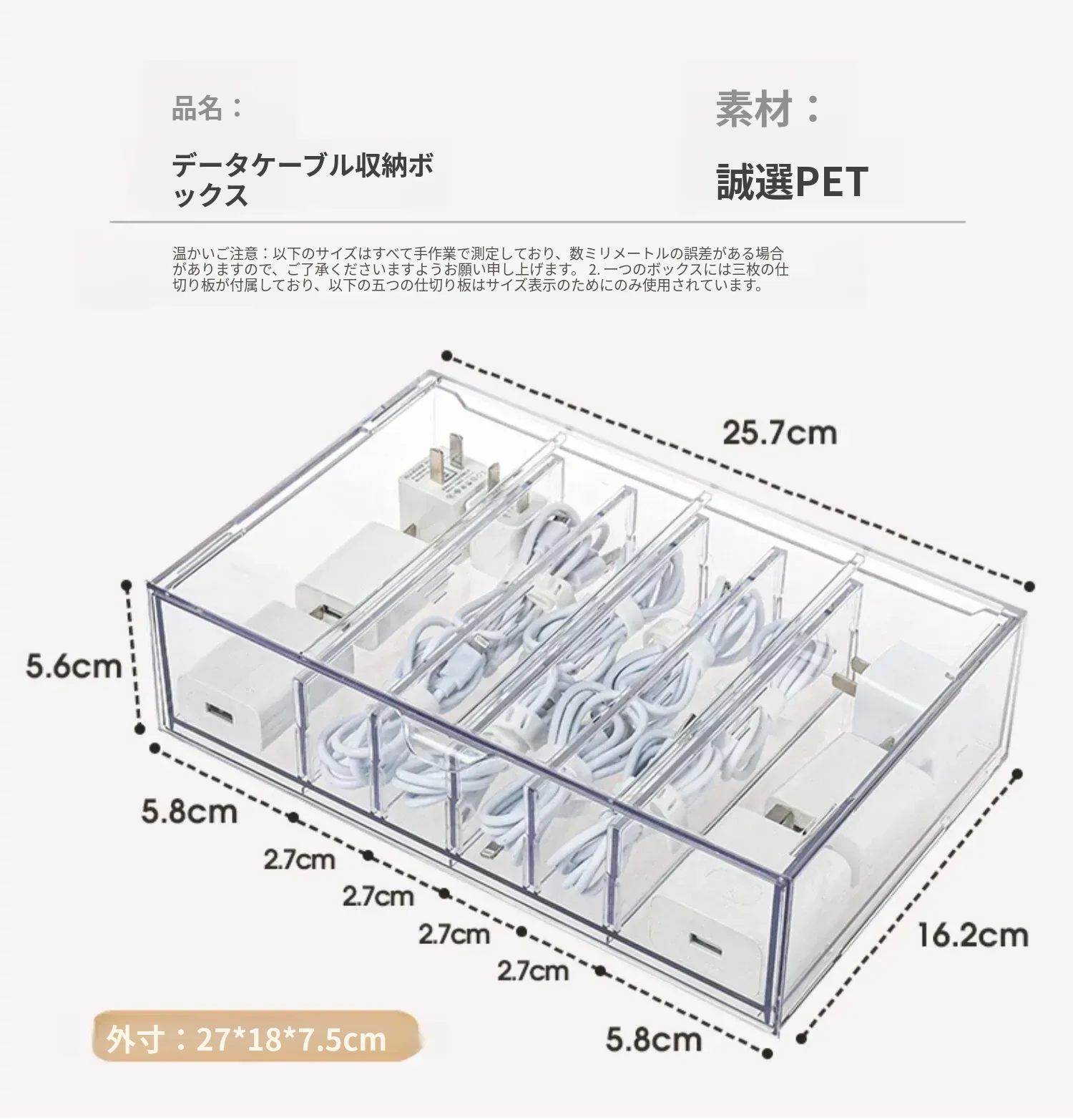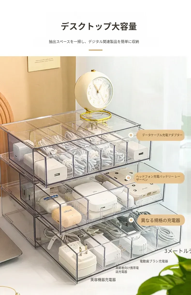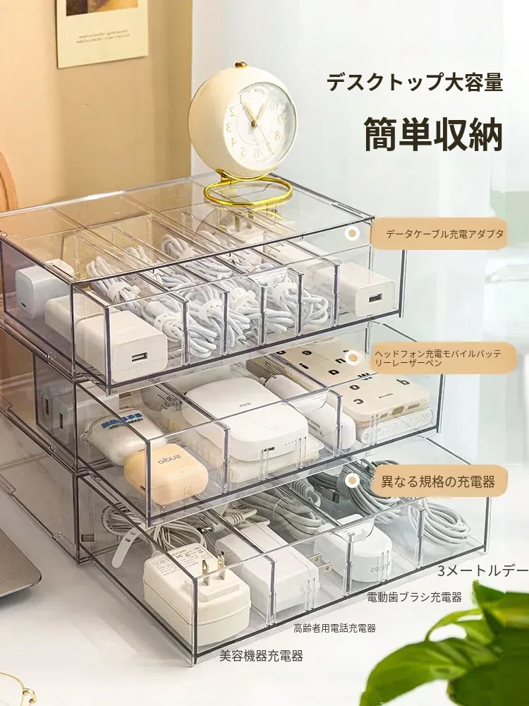 【3個セット-仕切り付き-30本のケーブルタイ付き】三口プラグ抽斗収納ボックス