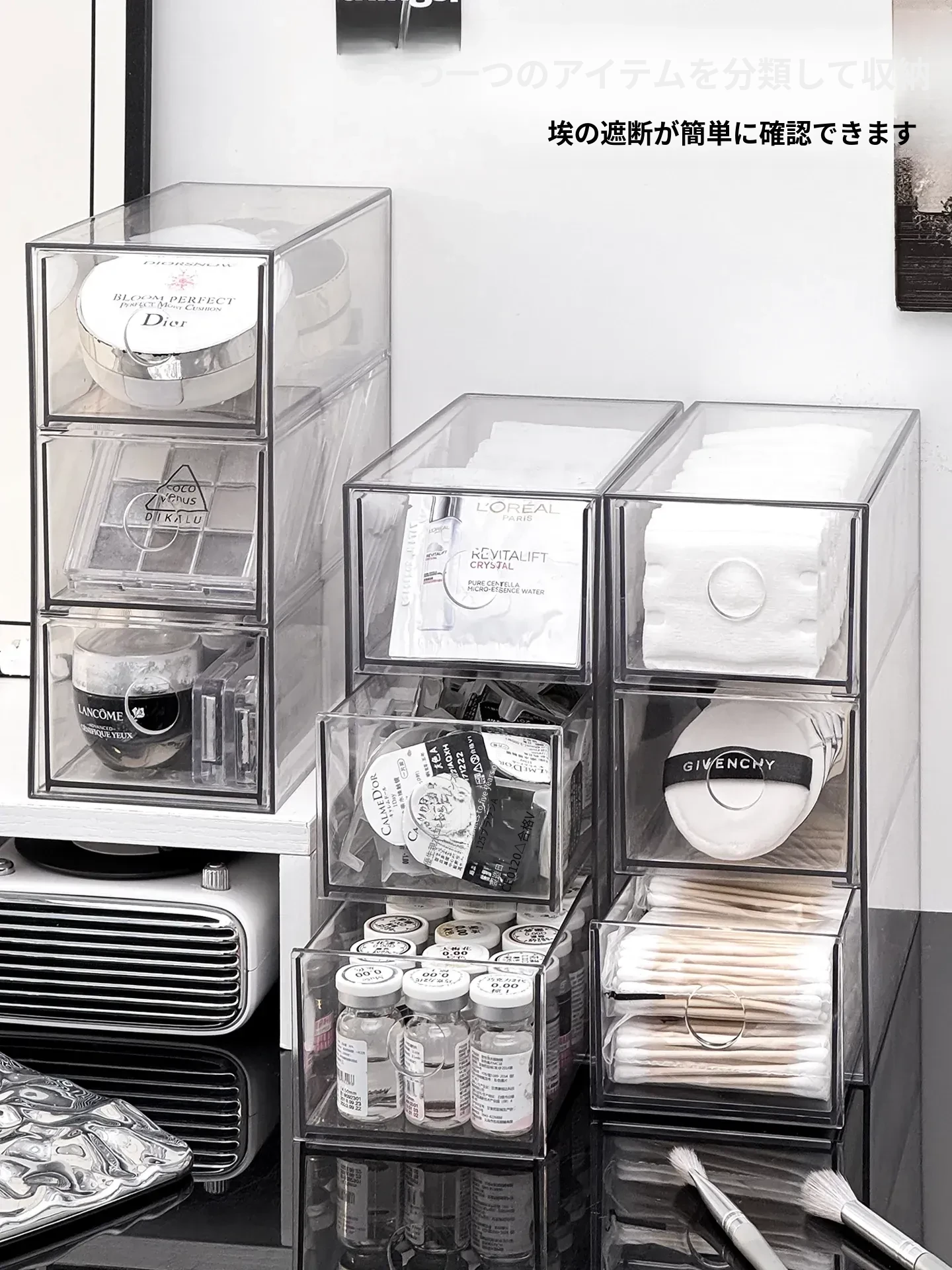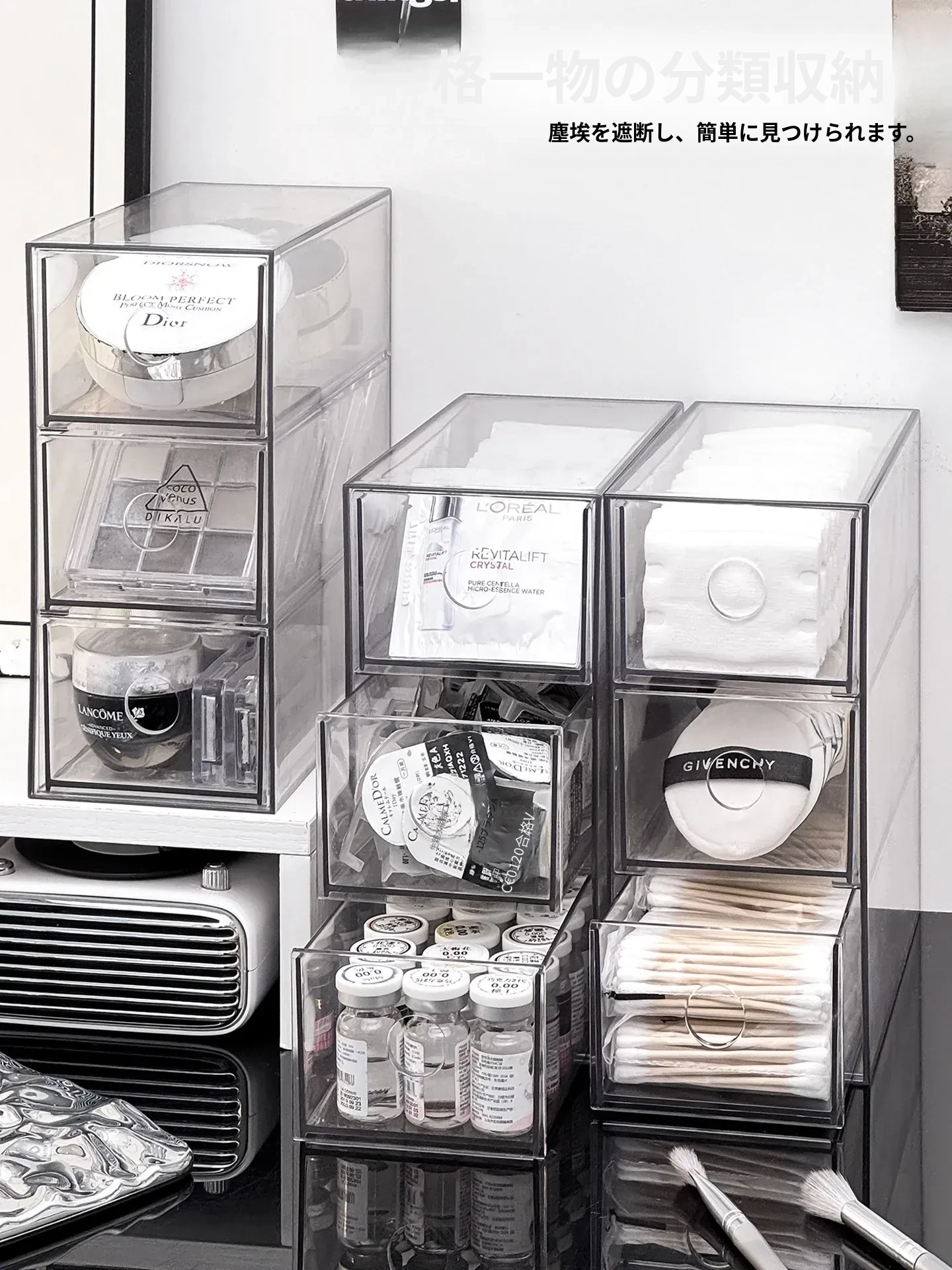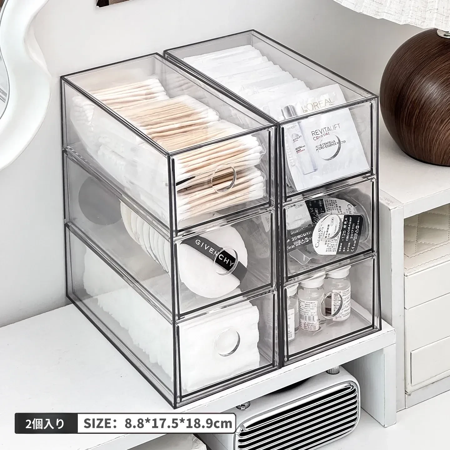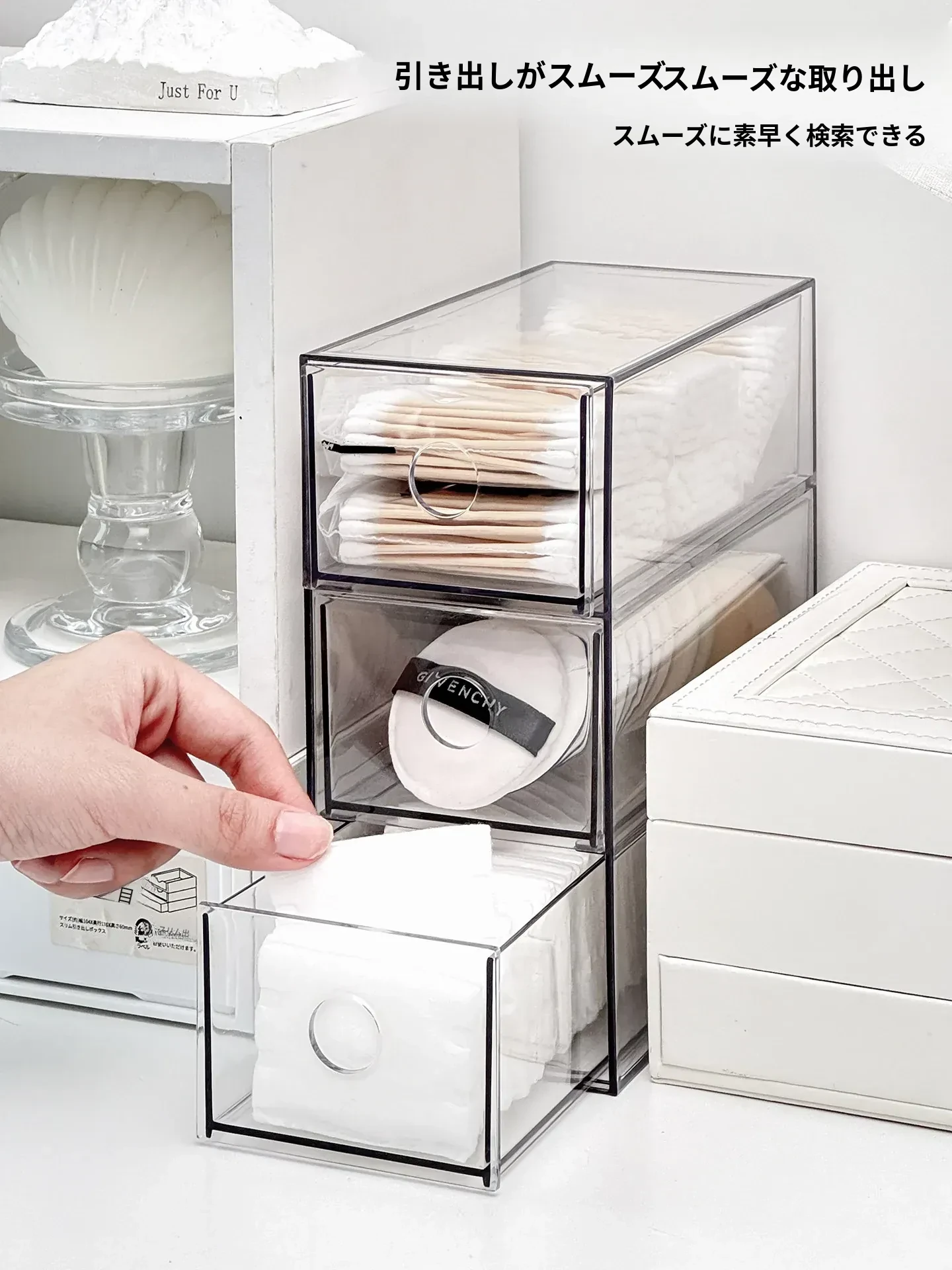 引き出し式メイクアップコットン&綿棒整理ツール!デスク上の化粧品サンプル収納ボックス、ファンデーションパフ&ビューティーエッグ用スタンド。あなたのメイクアップスペースをスッキリ整頓!
