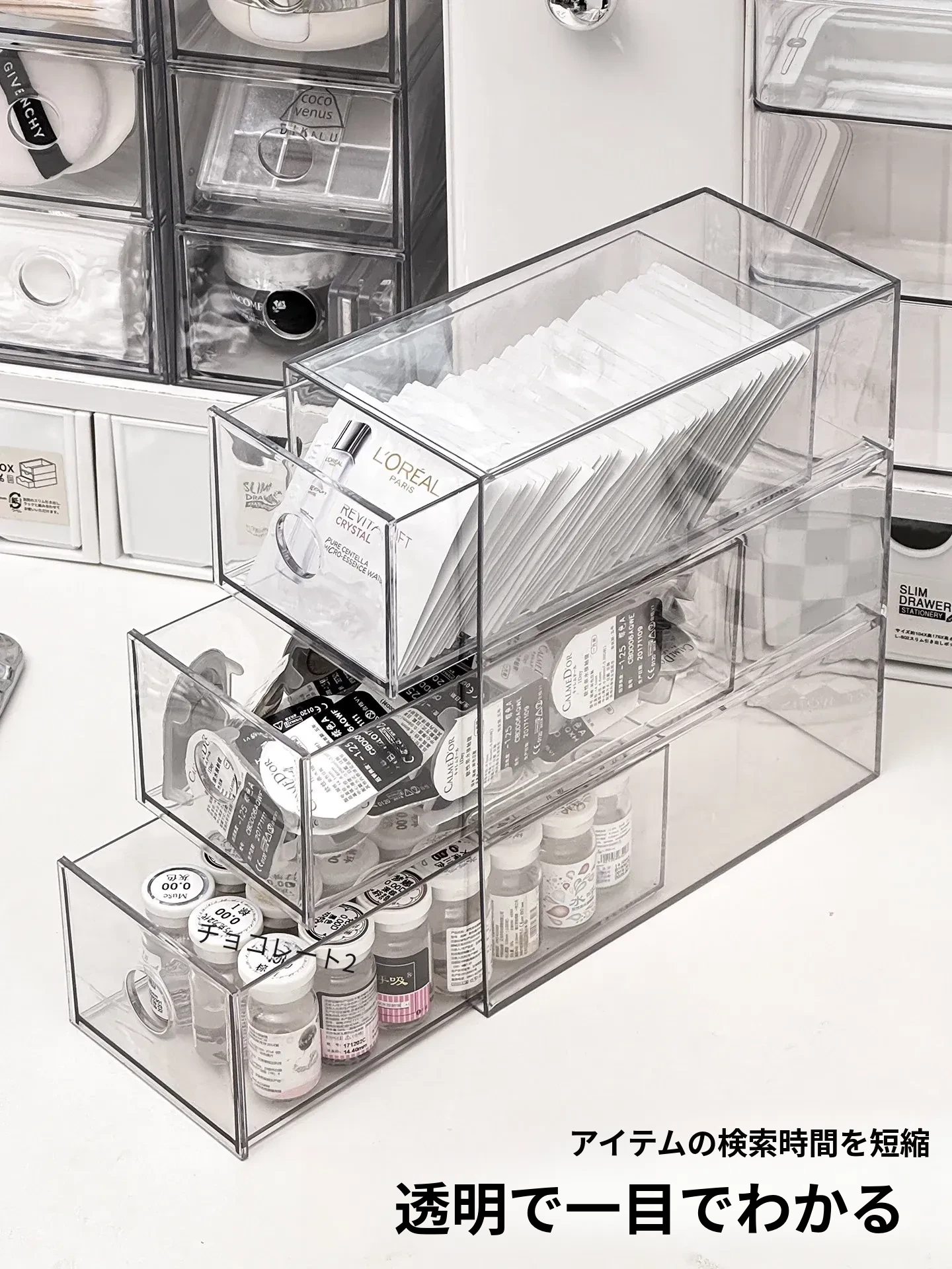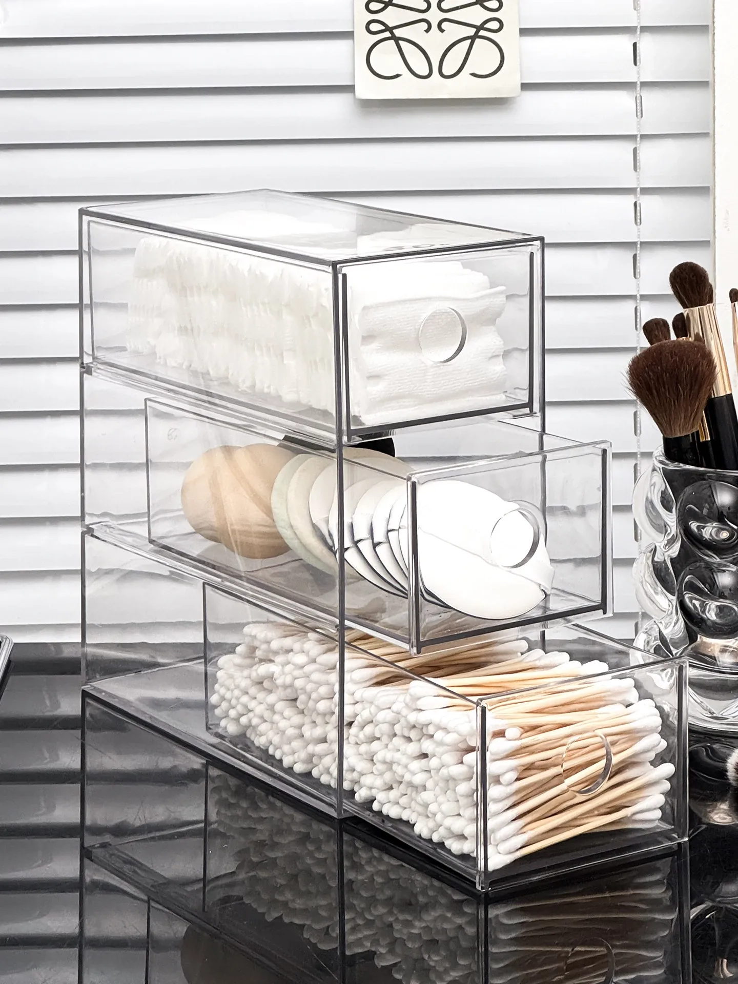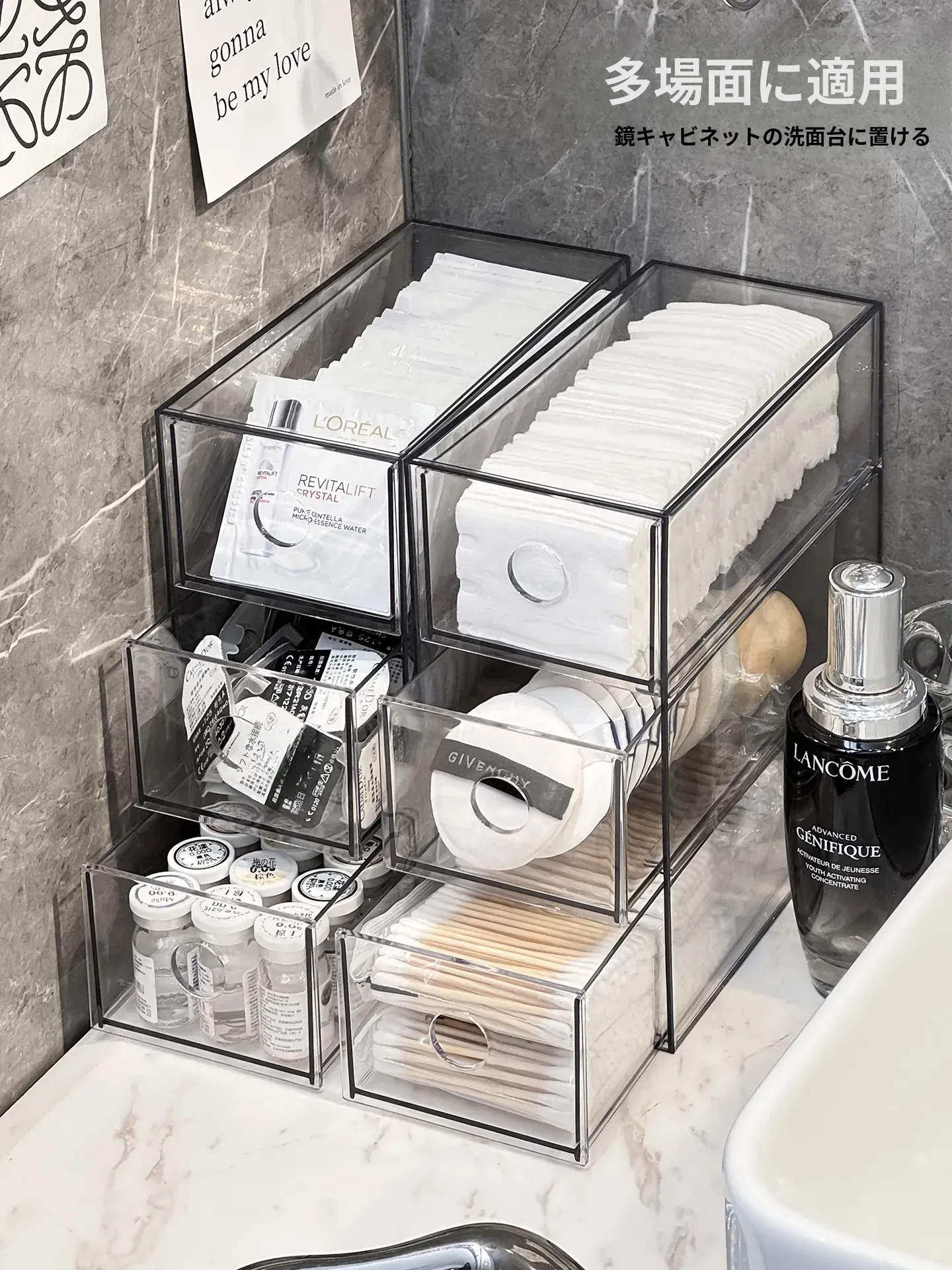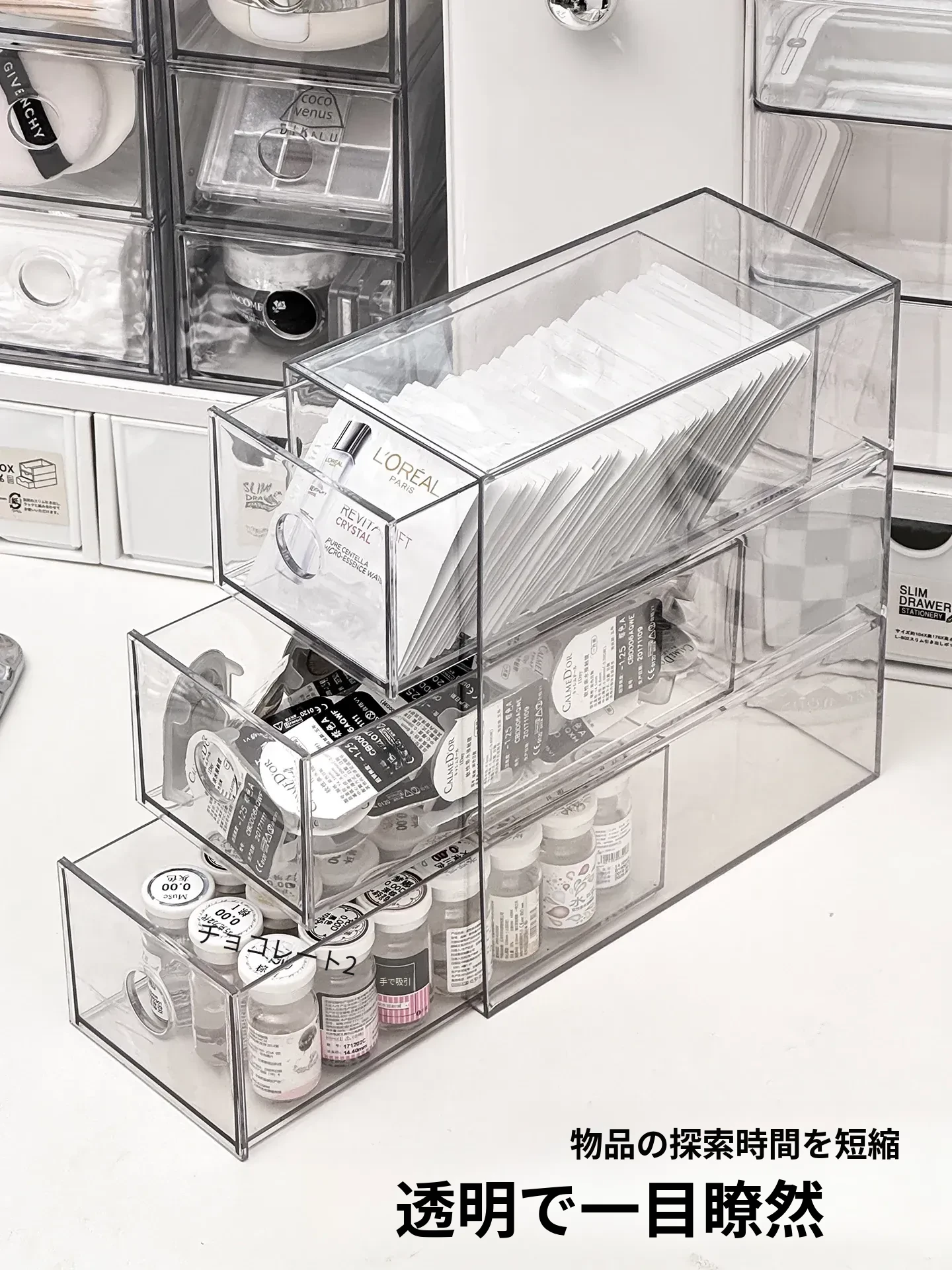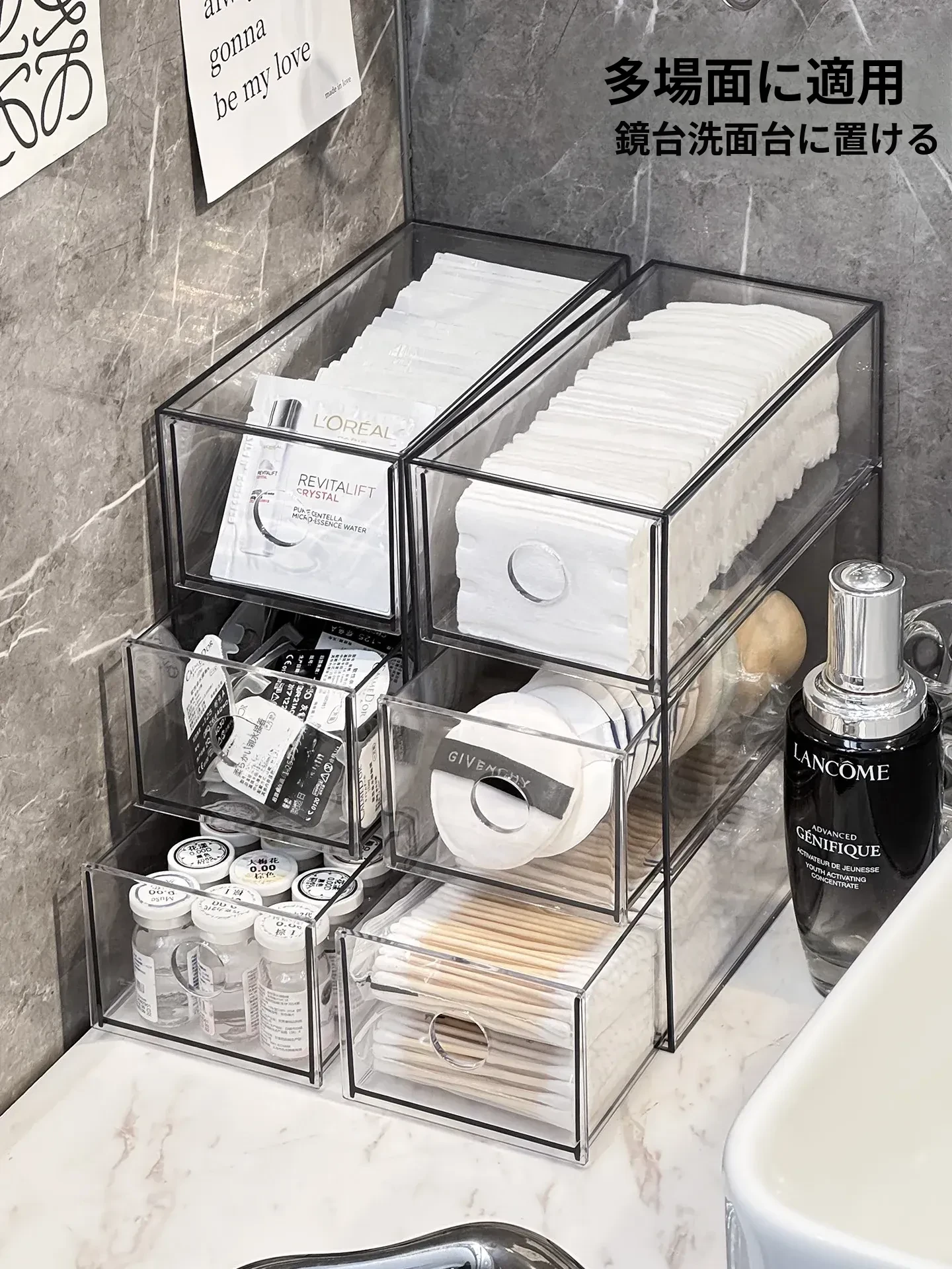 引き出し式メイクアップコットン&綿棒整理ツール!デスク上の化粧品サンプル収納ボックス、ファンデーションパフ&ビューティーエッグ用スタンド。あなたのメイクアップスペースをスッキリ整頓!