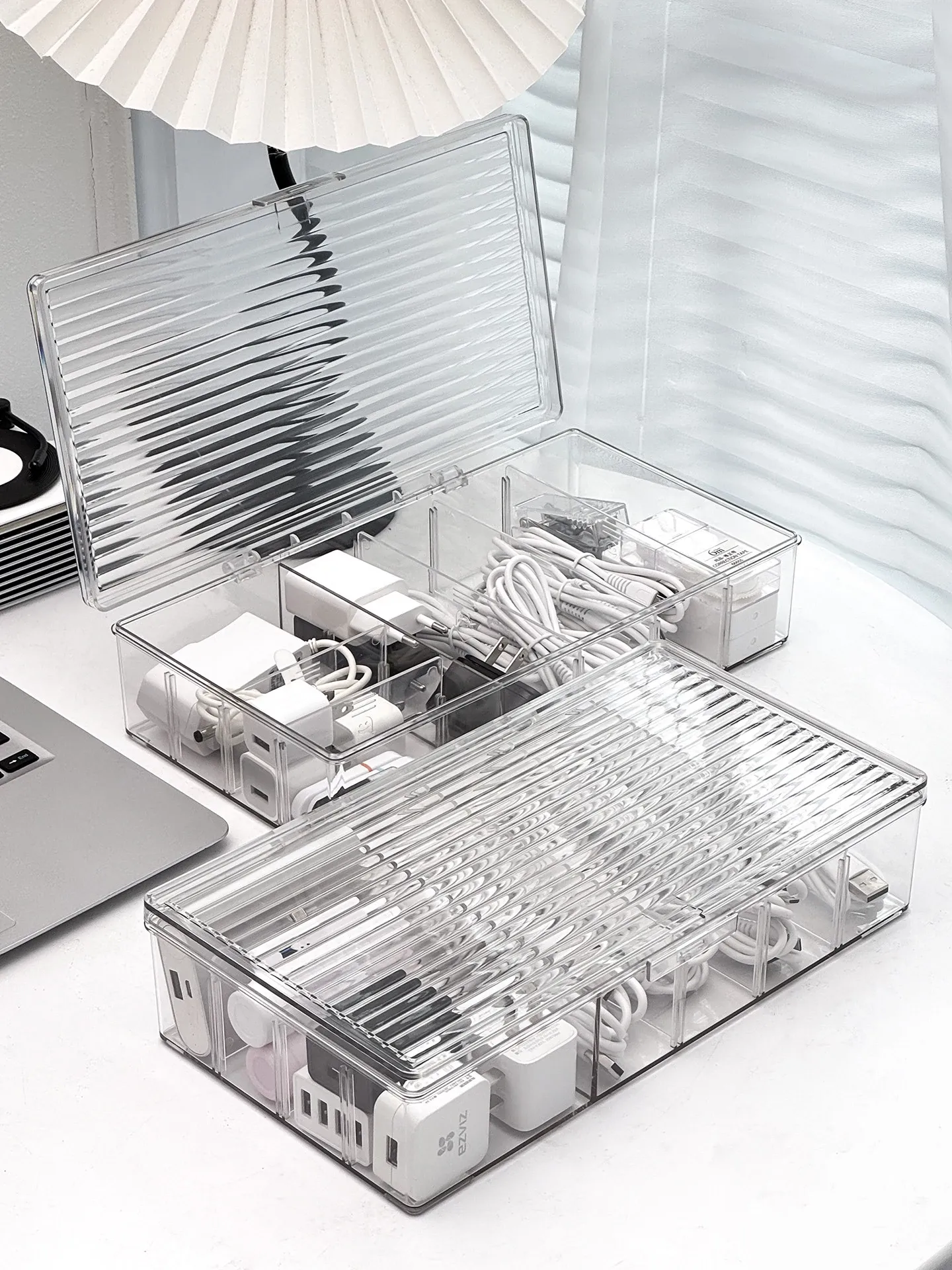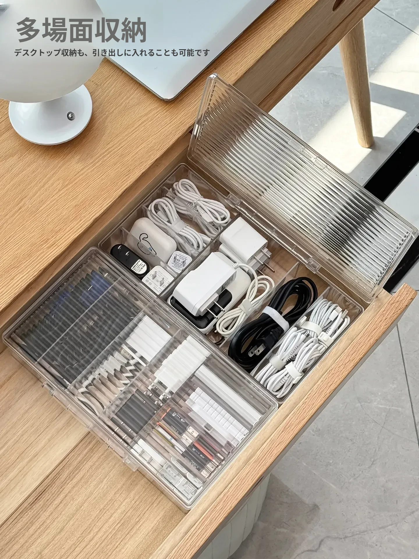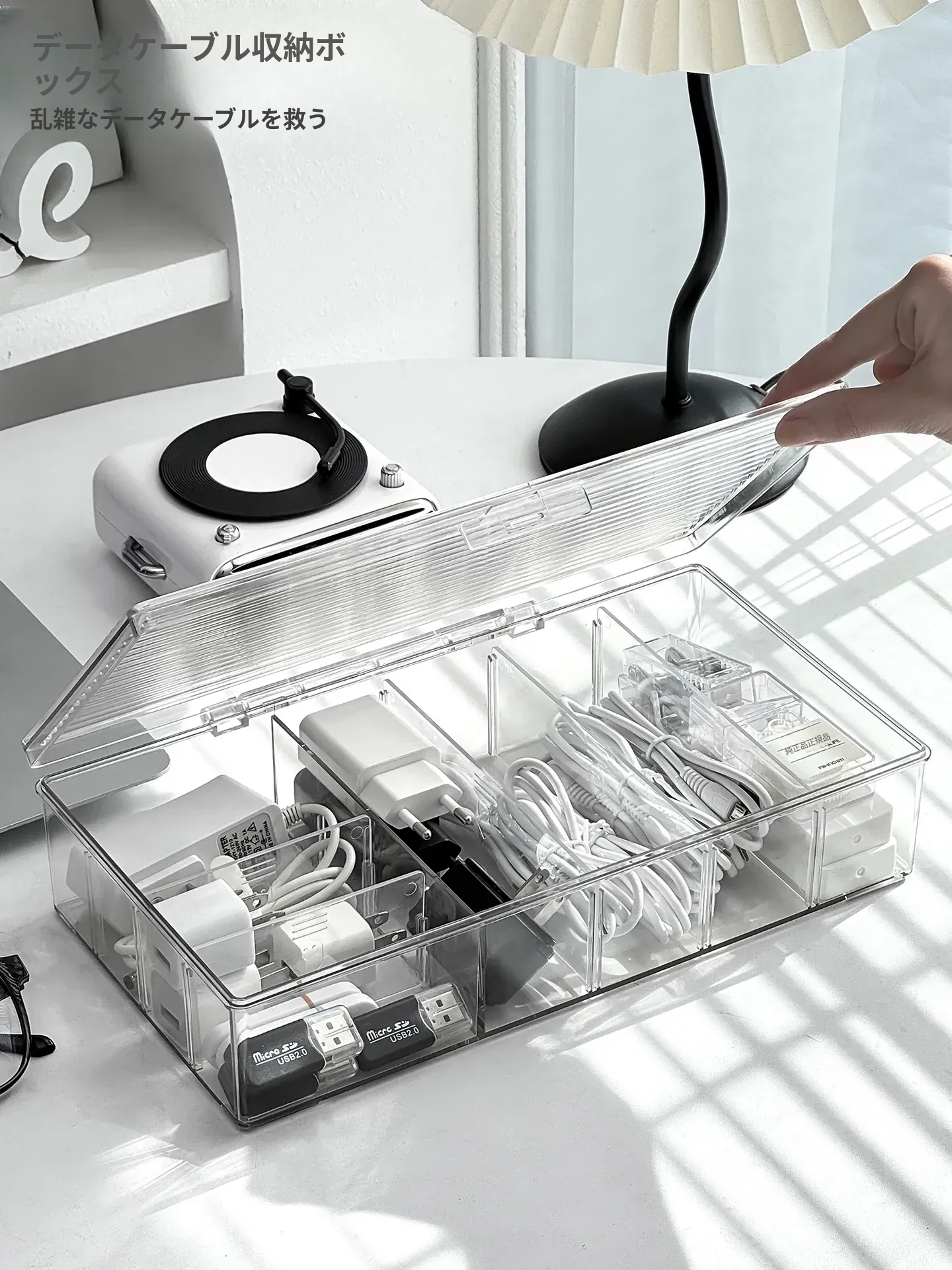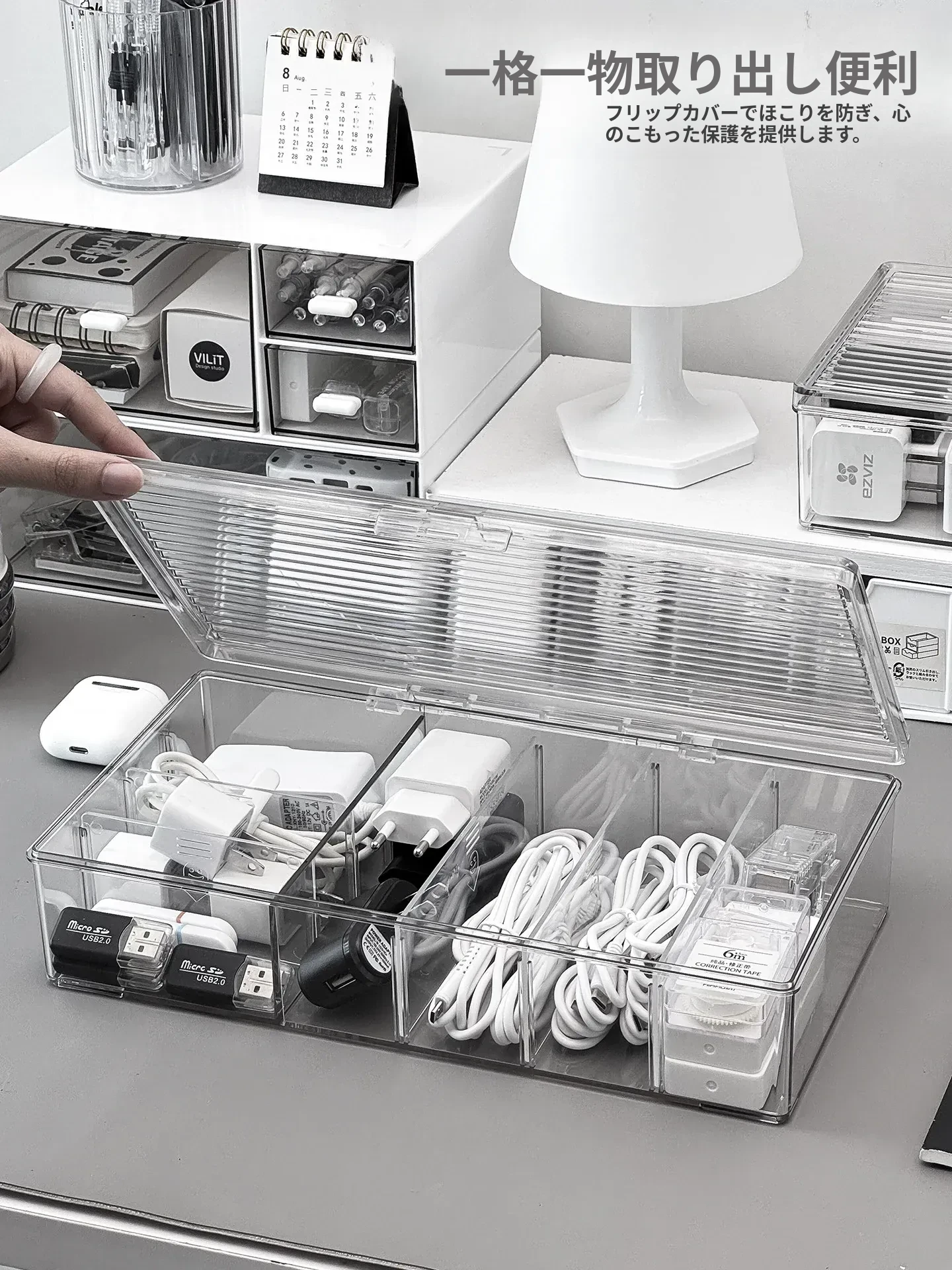 ホコリ防止データケーブル収納ボックス デスクトップ仕切り付き スマホ充電器・電源ケーブル整理グッズ 蓋付きでスッキリ整頓!あなたのデスクを美しく保つ必需品!