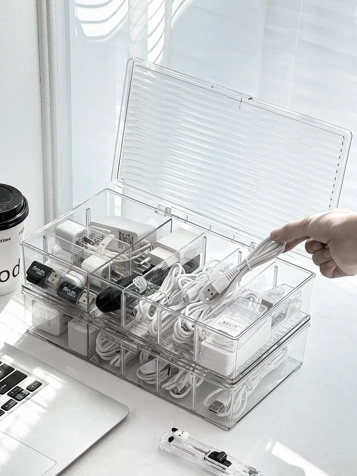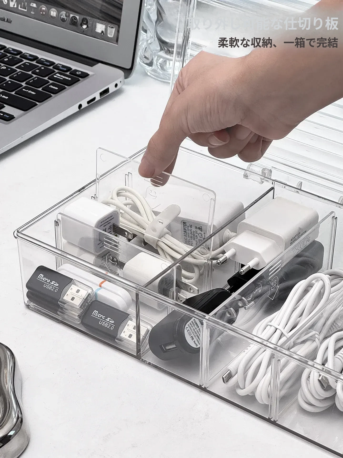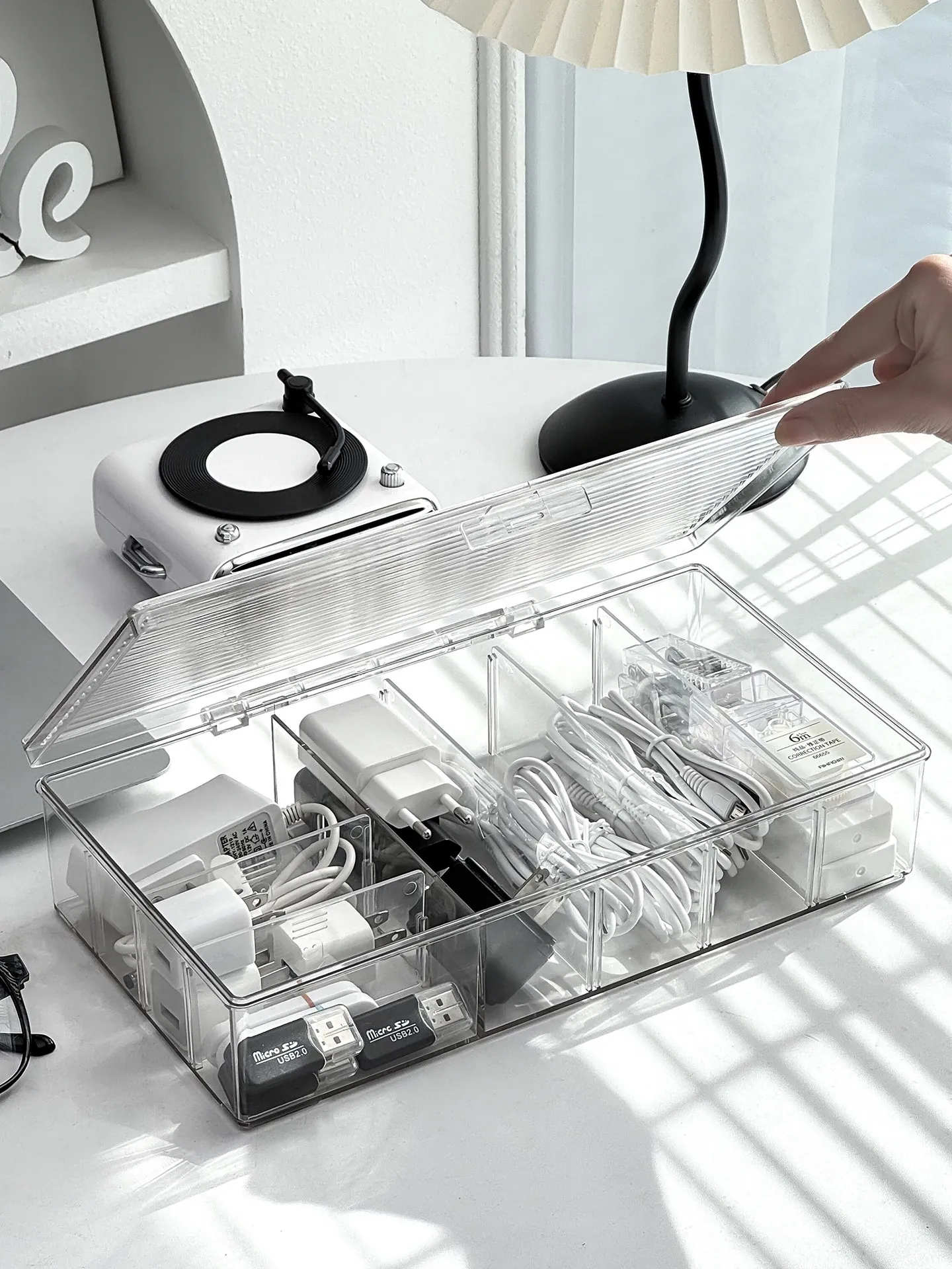 ホコリ防止データケーブル収納ボックス デスクトップ仕切り付き スマホ充電器・電源ケーブル整理グッズ 蓋付きでスッキリ整頓!あなたのデスクを美しく保つ必需品!