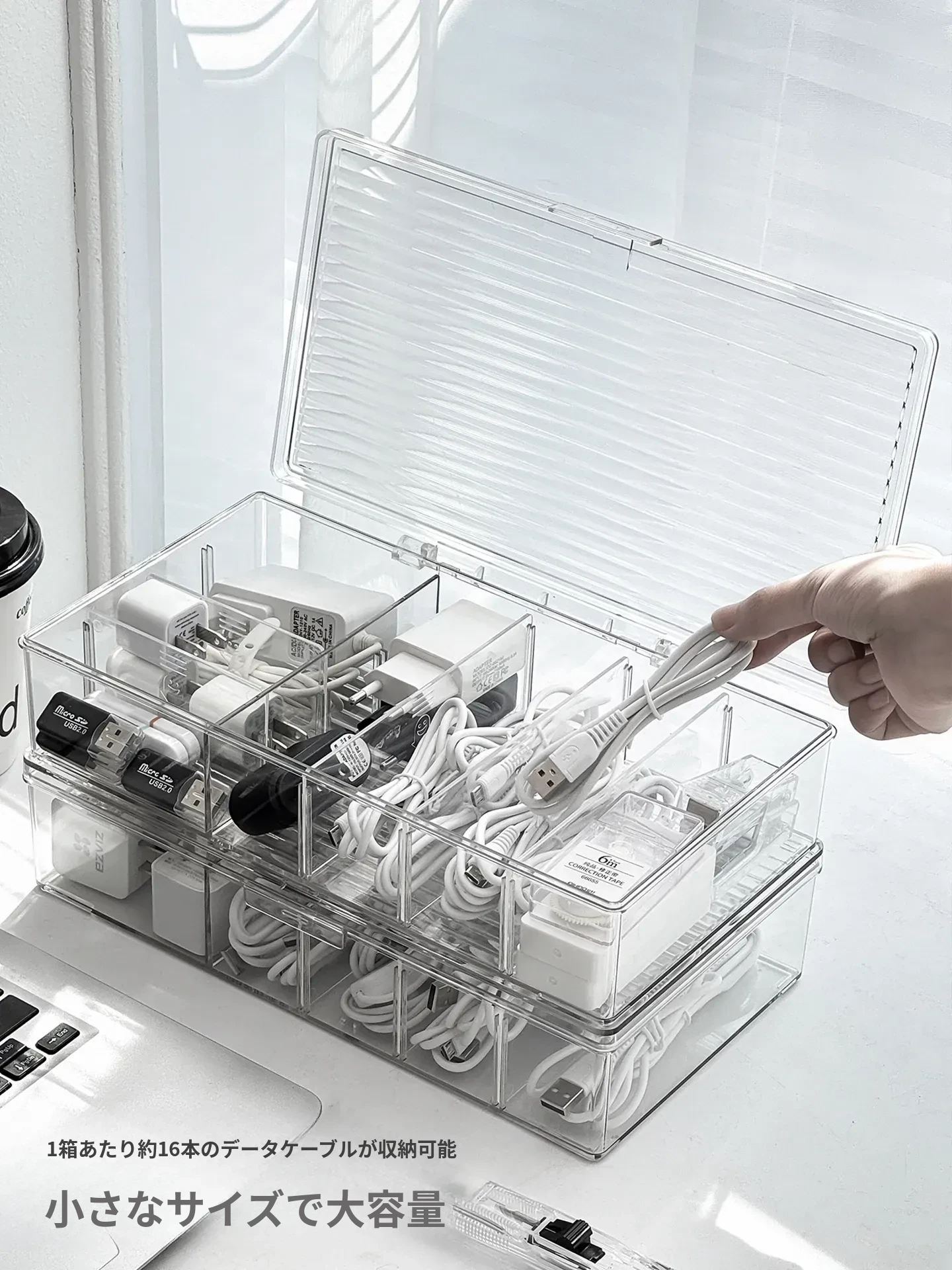 【2個セット-大サイズ-仕切り取り外し可能】防塵データケーブル収納ボックス