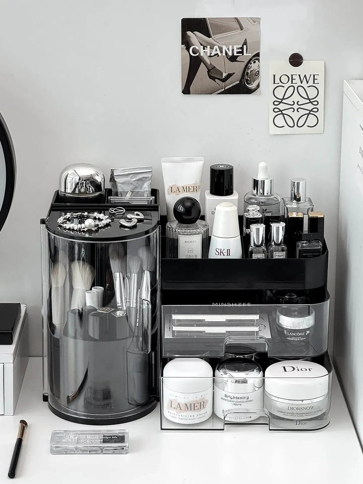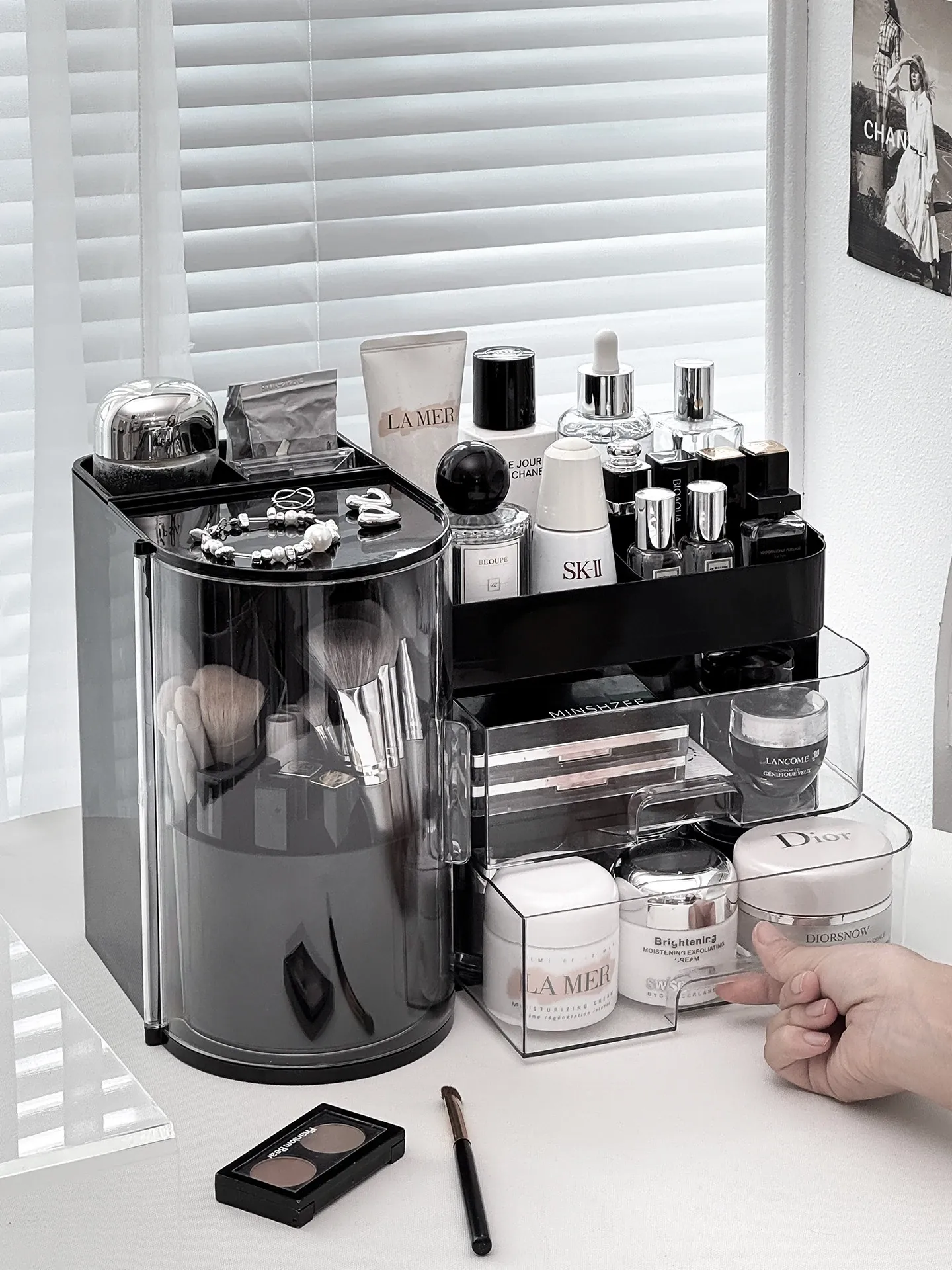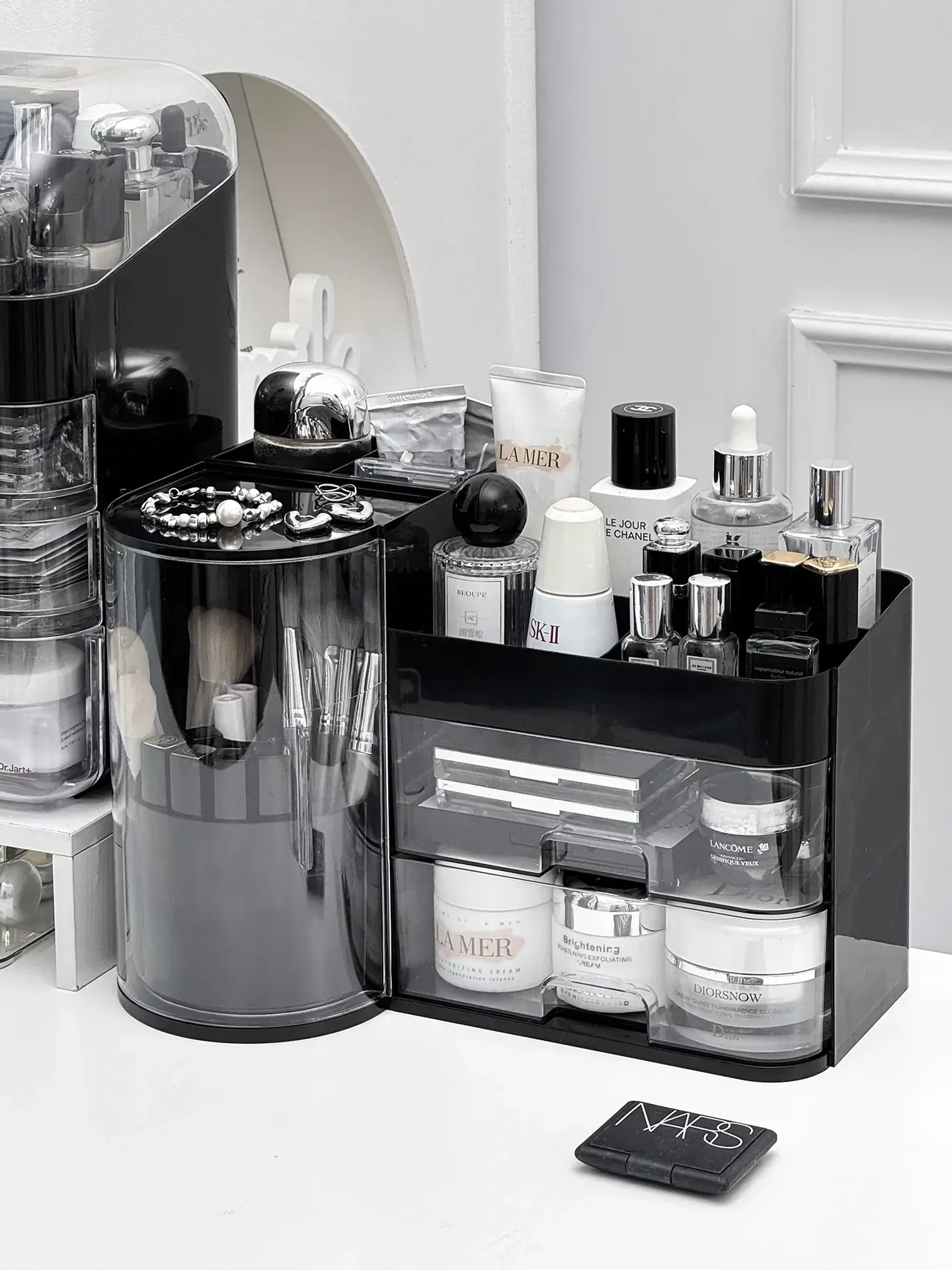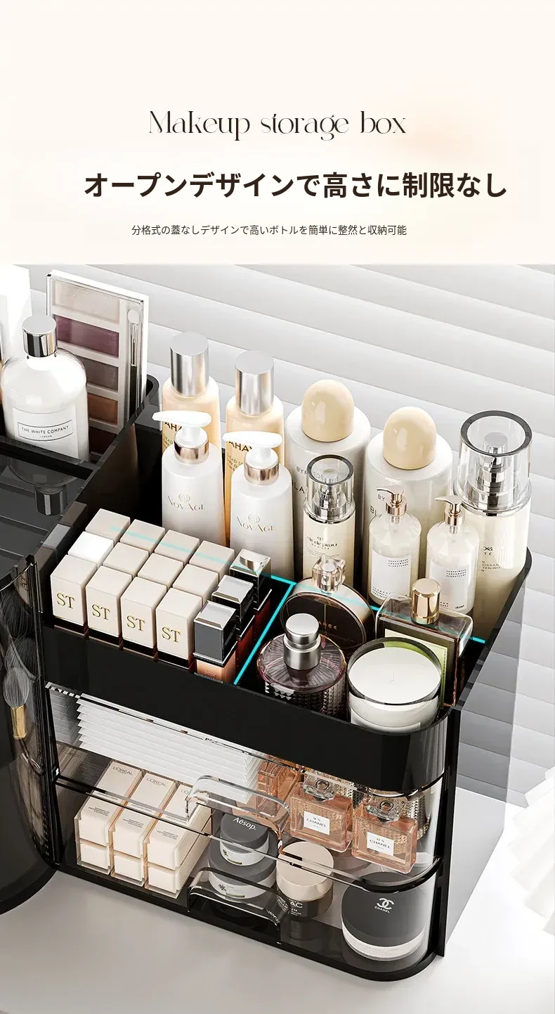 高級感あふれるメイク用品収納ボックス!360度回転するメイクブラシホルダーと多機能な香水・リップ整理器。美しいデスク周りを実現し、すべてをスッキリ整理します!