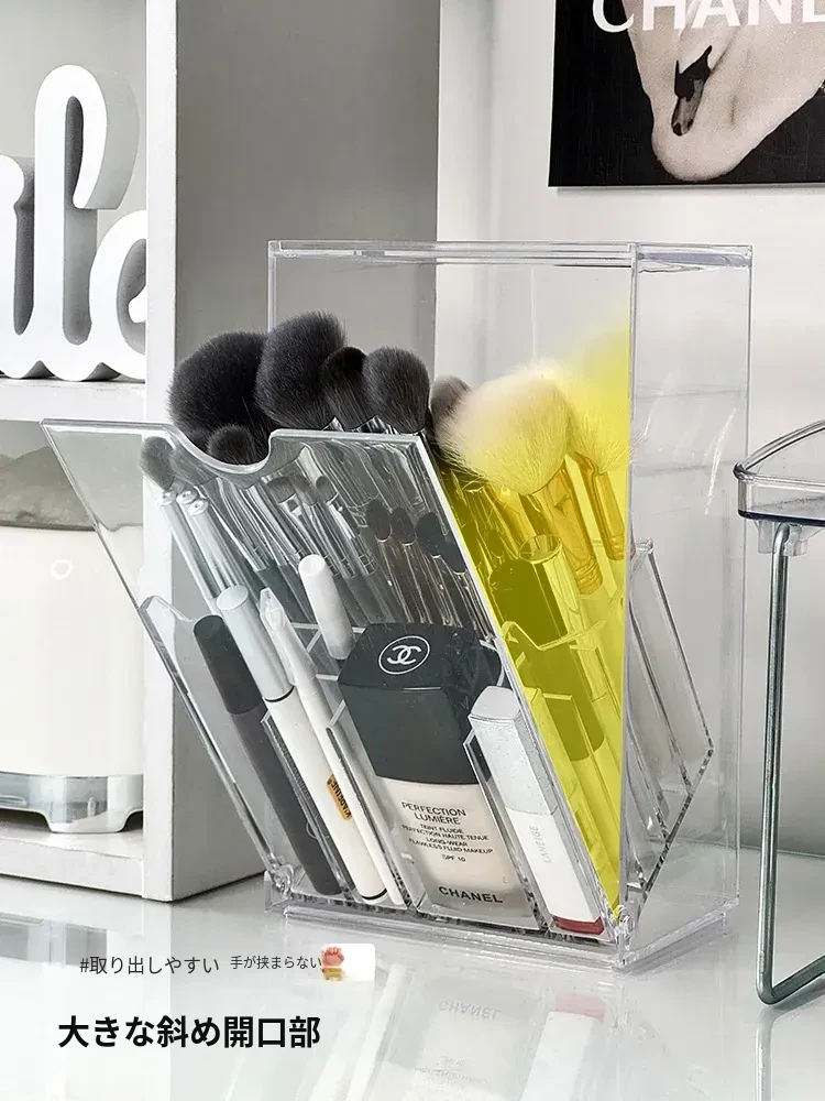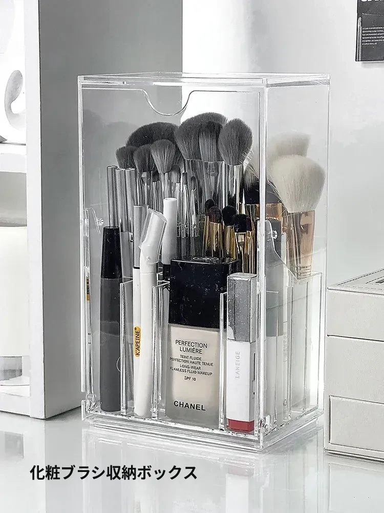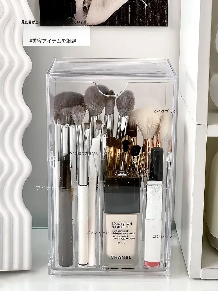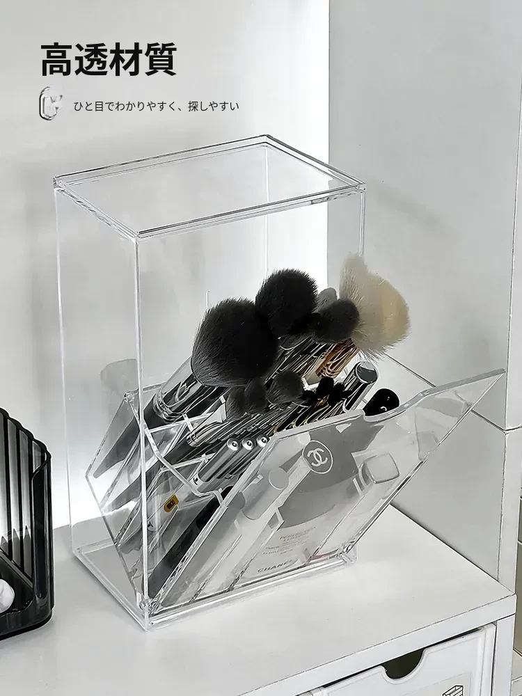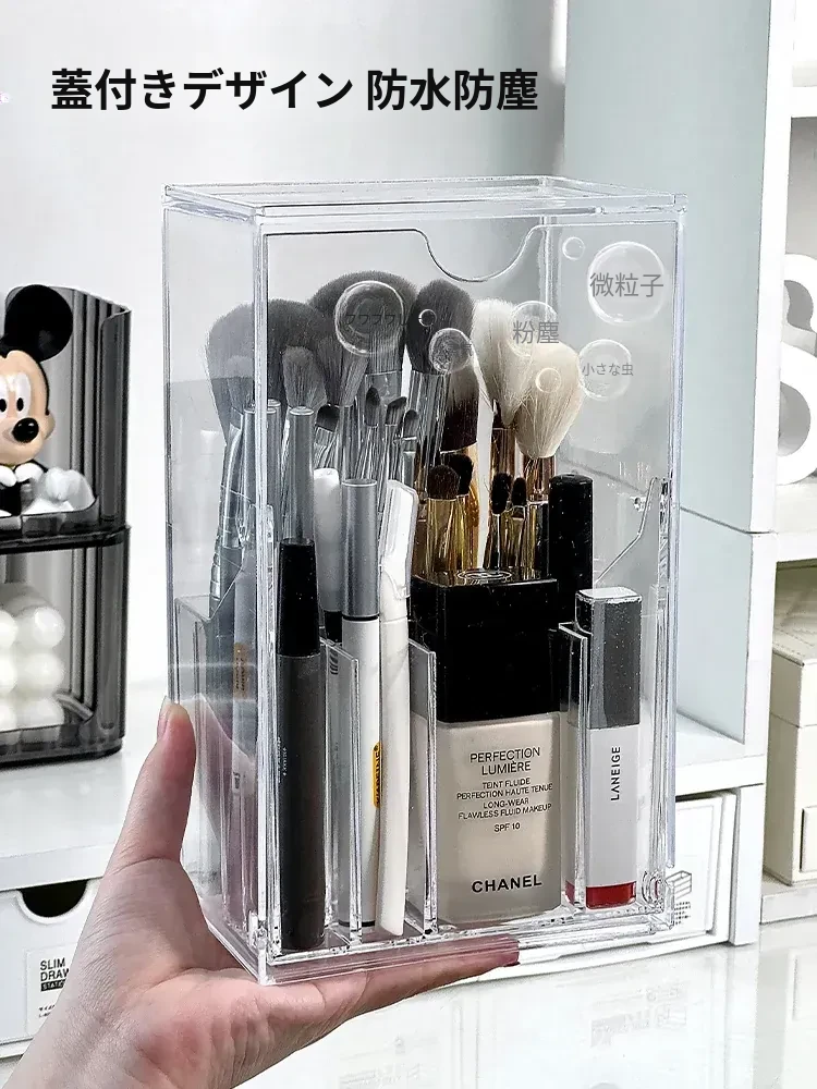 高級感溢れるデスク用メイクブラシ収納筒 - 防塵設計で美しさを保つ!化粧品整理ボックス、分格で口紅や眉ペンもすっきり収納。あなたの化粧台をスタイリッシュに演出します!