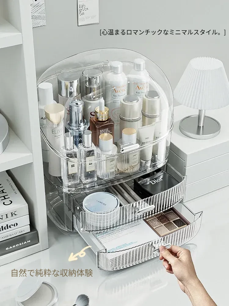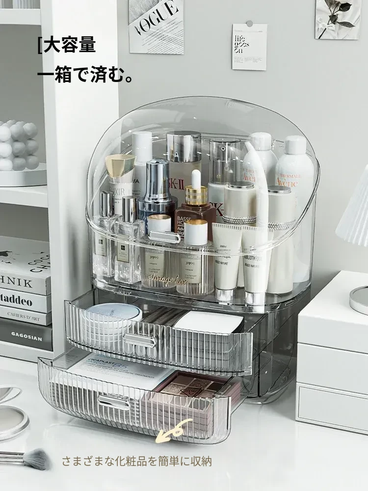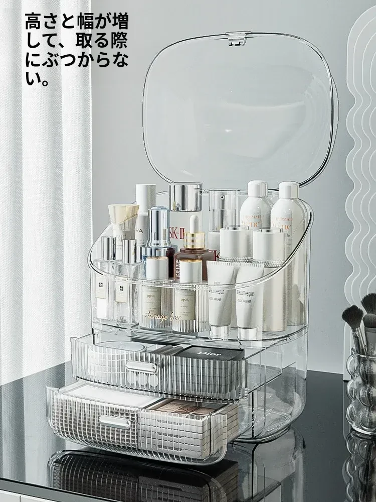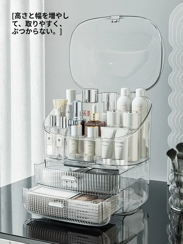 高級感漂うデスクトップメイクボックス!化粧台やスキンケア用品に最適な防塵アクリル収納ケース。口紅やフェイスマスクもすっきり整理できる便利な置物ラックです。あなたの美しさを引き立てるアイテム!