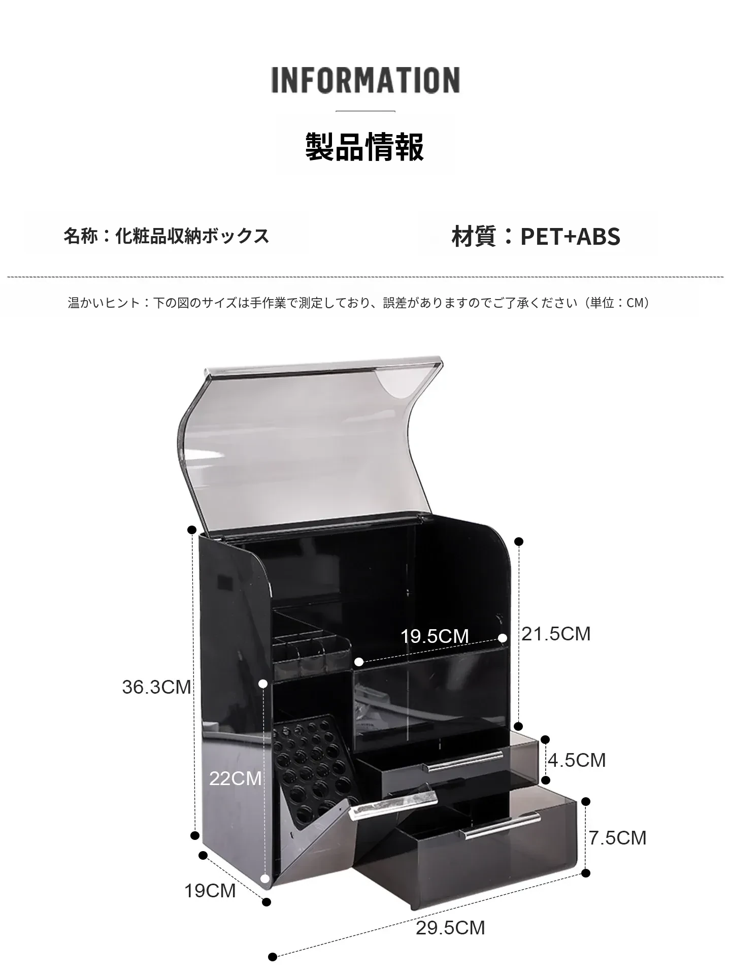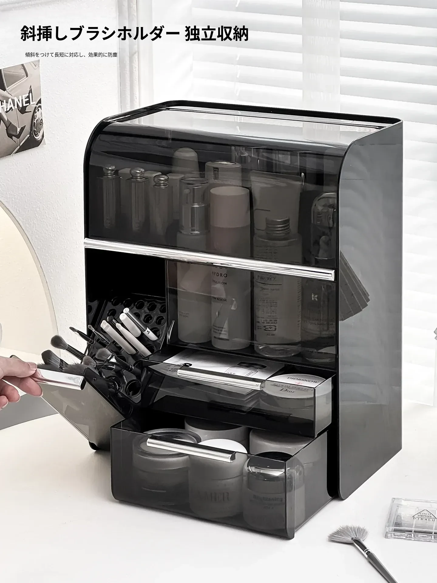 【ブラシホルダー付き+リップ収納】シルバー&ブラック多機能メイクボックス-WG-2771