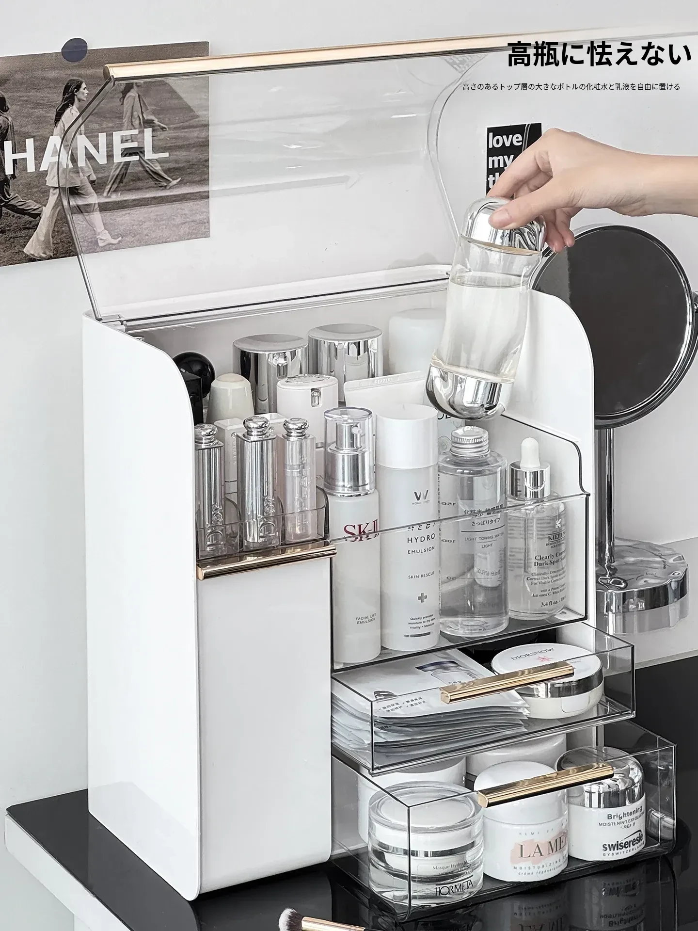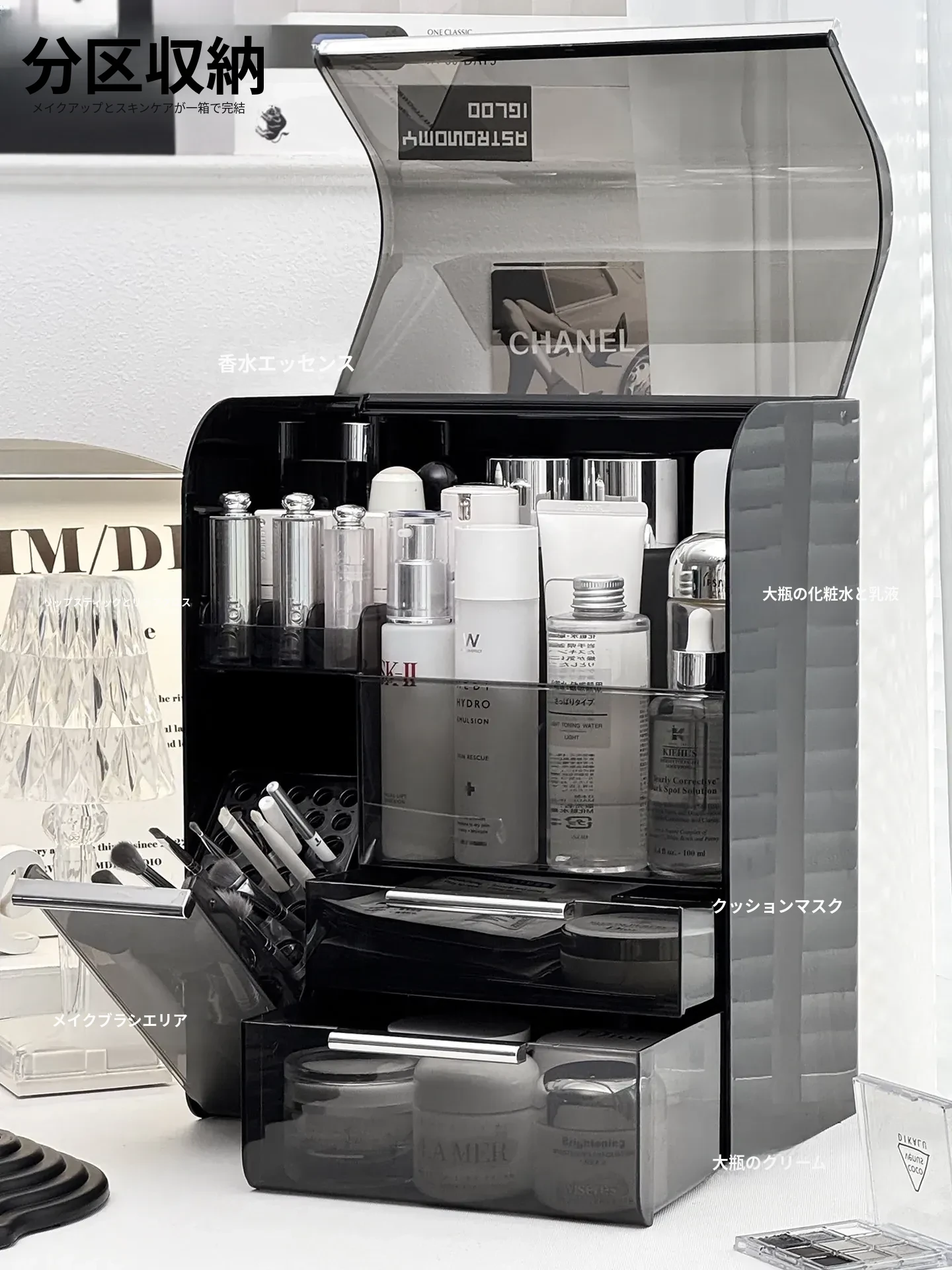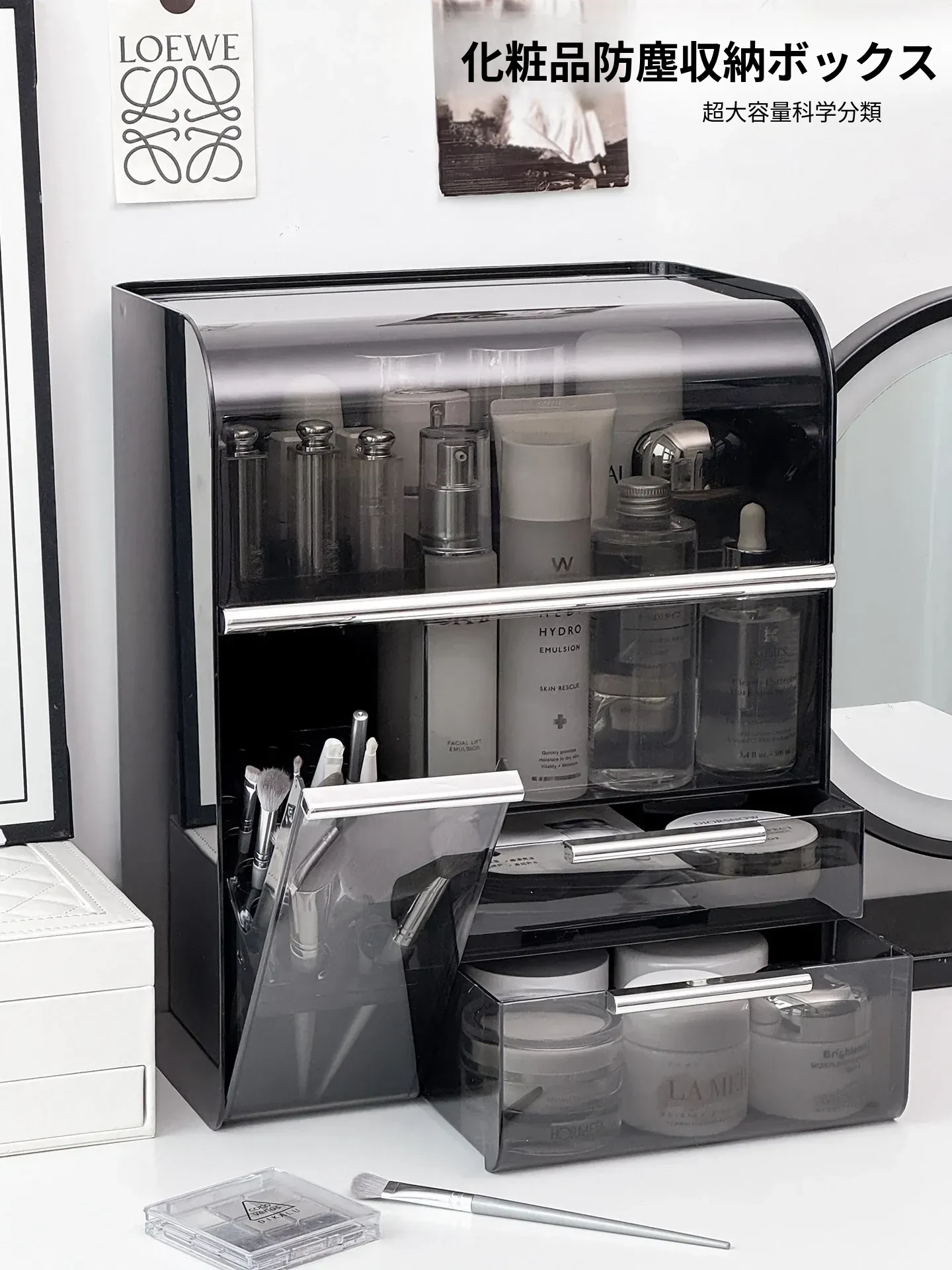 デスクトップ化粧品収納ボックス 高級感あふれるリッチなコスメ整理棚 メイクアップ台に最適なスキンケア収納ラック 口紅整理ボックス&ブラシスタンド