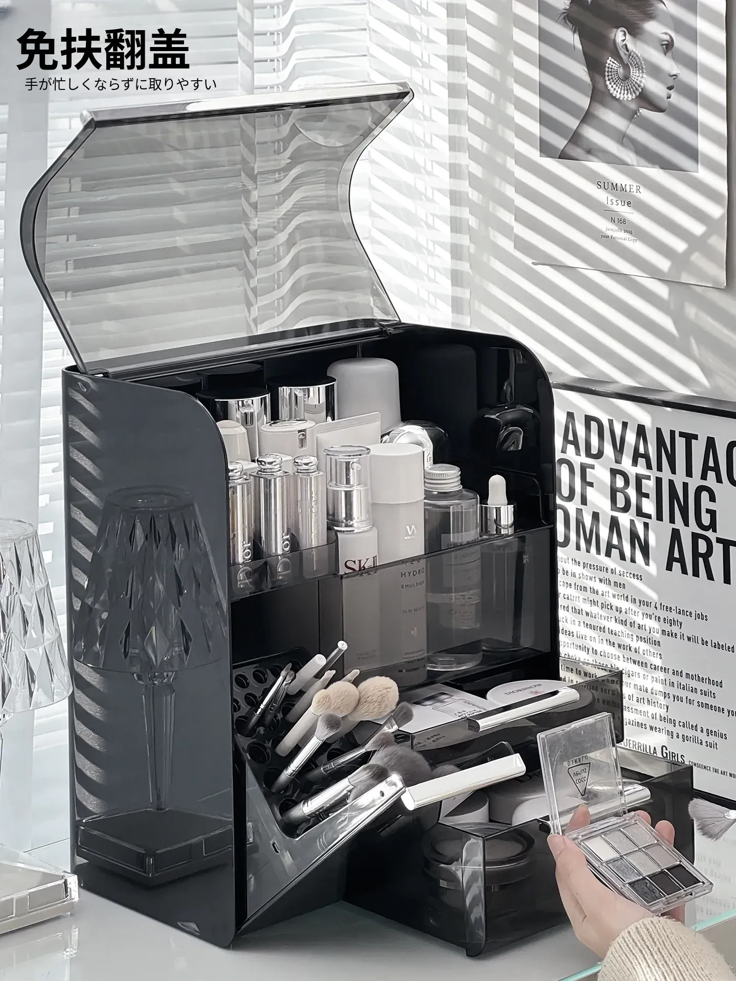【ブラシホルダー付き+リップ収納】プラチナ多機能メイクボックス-WG-2770