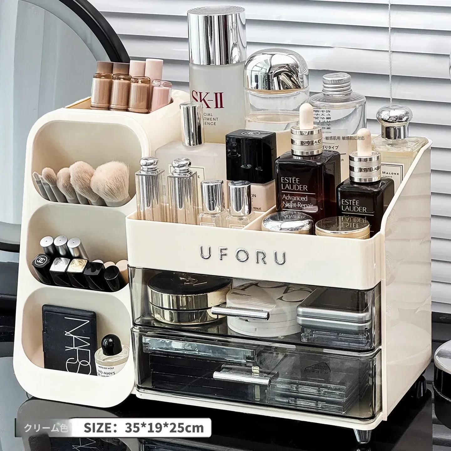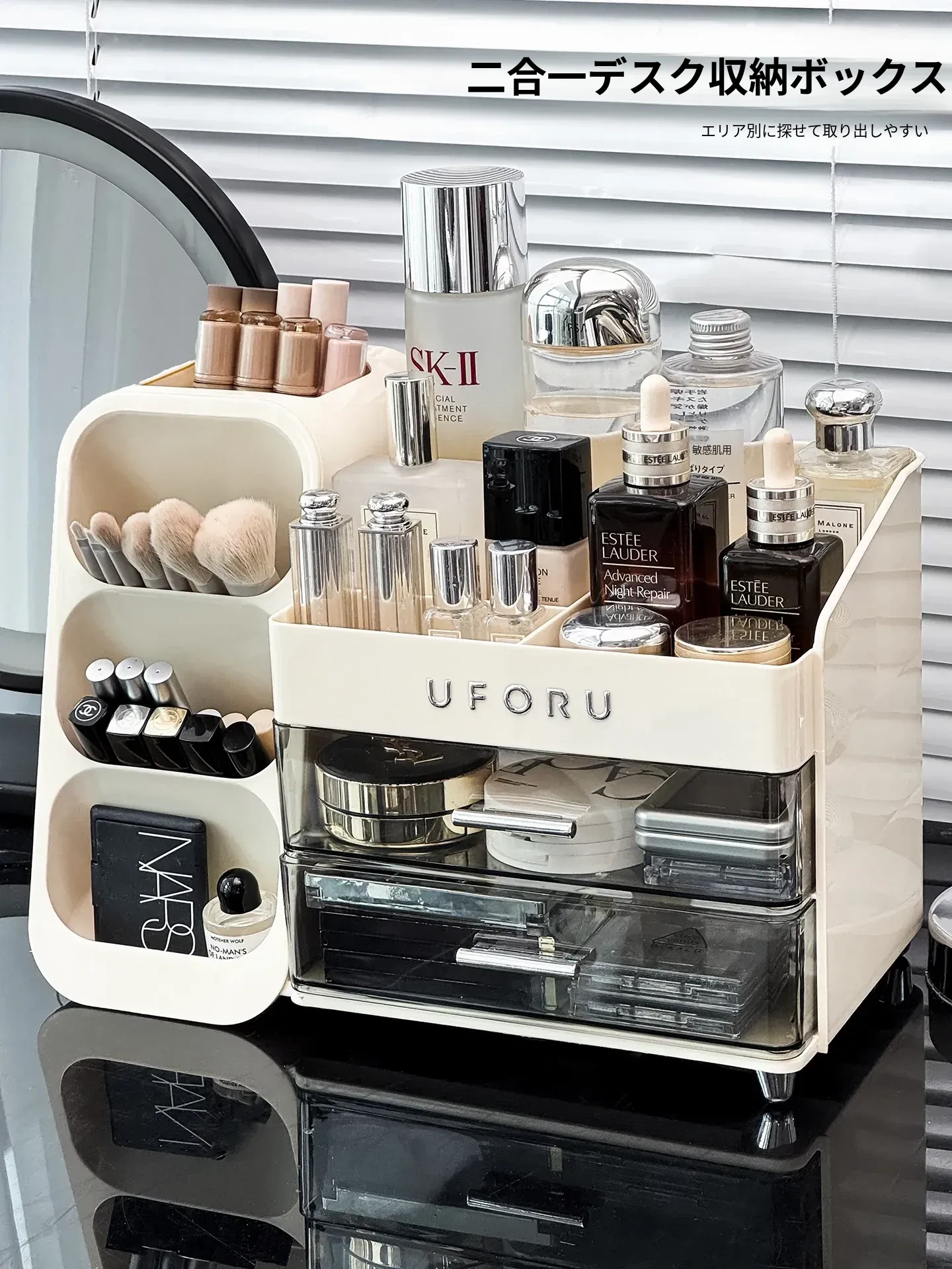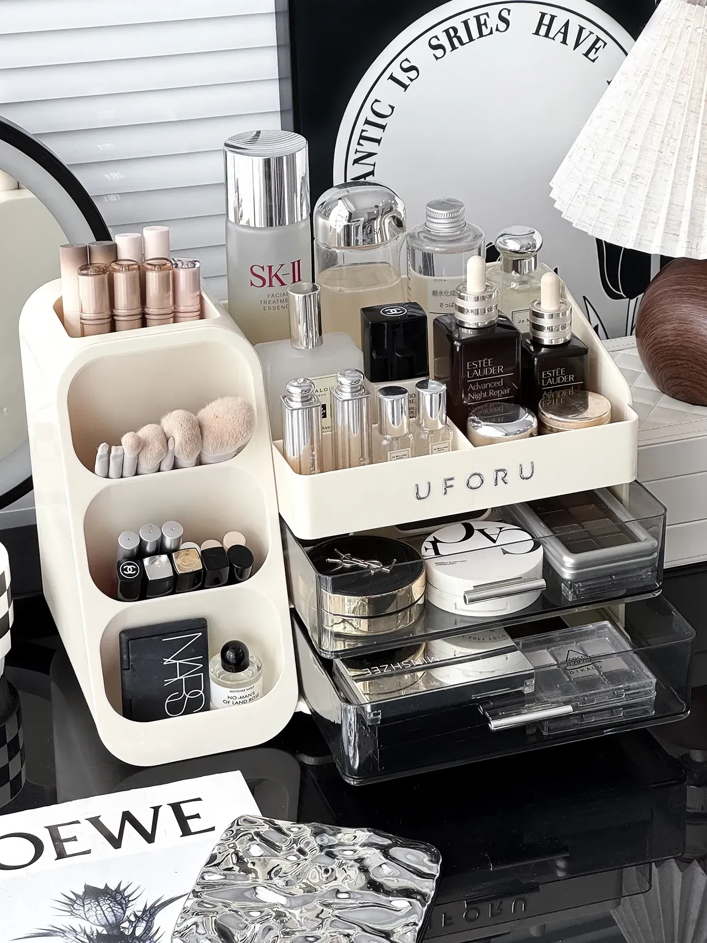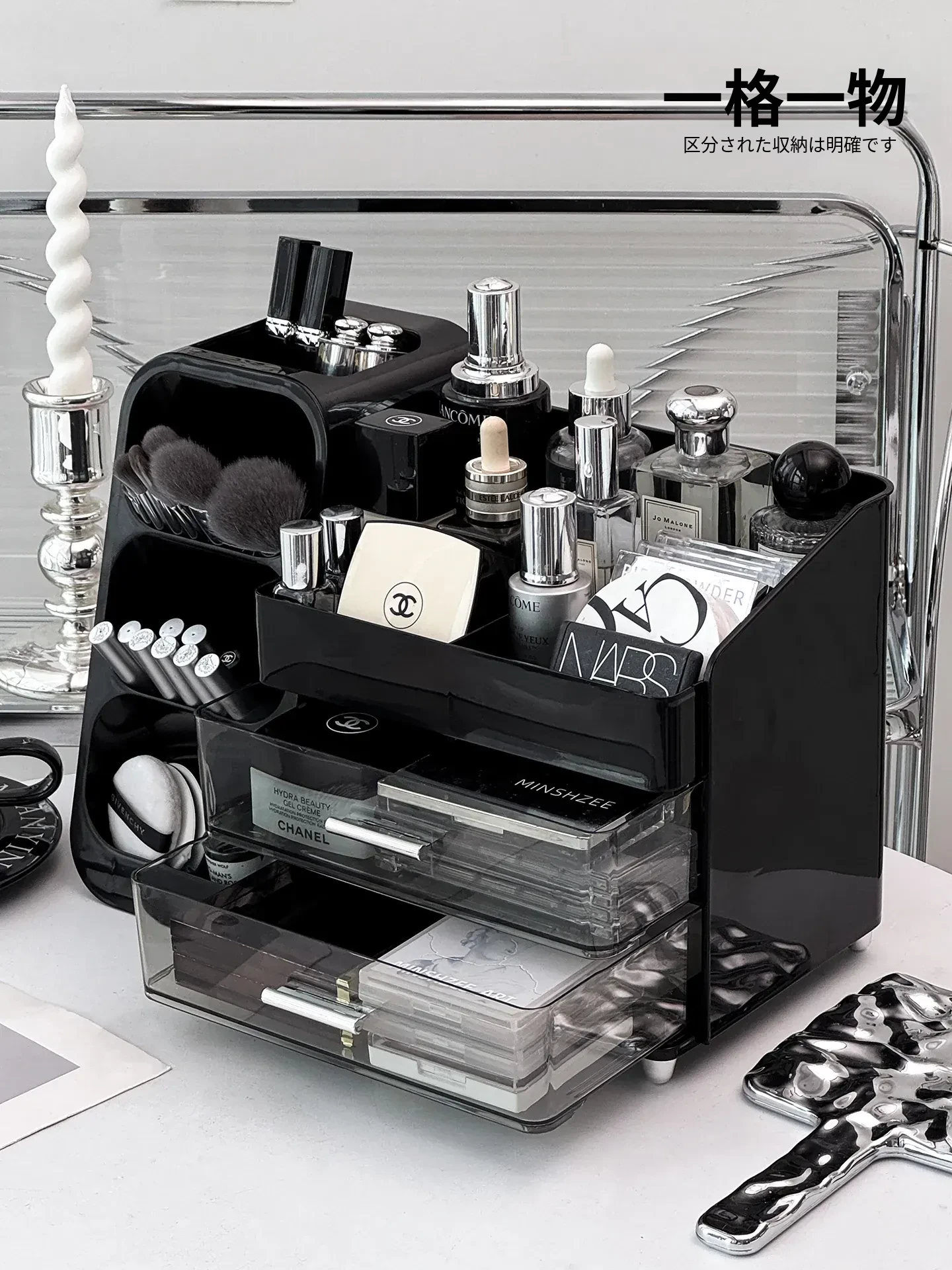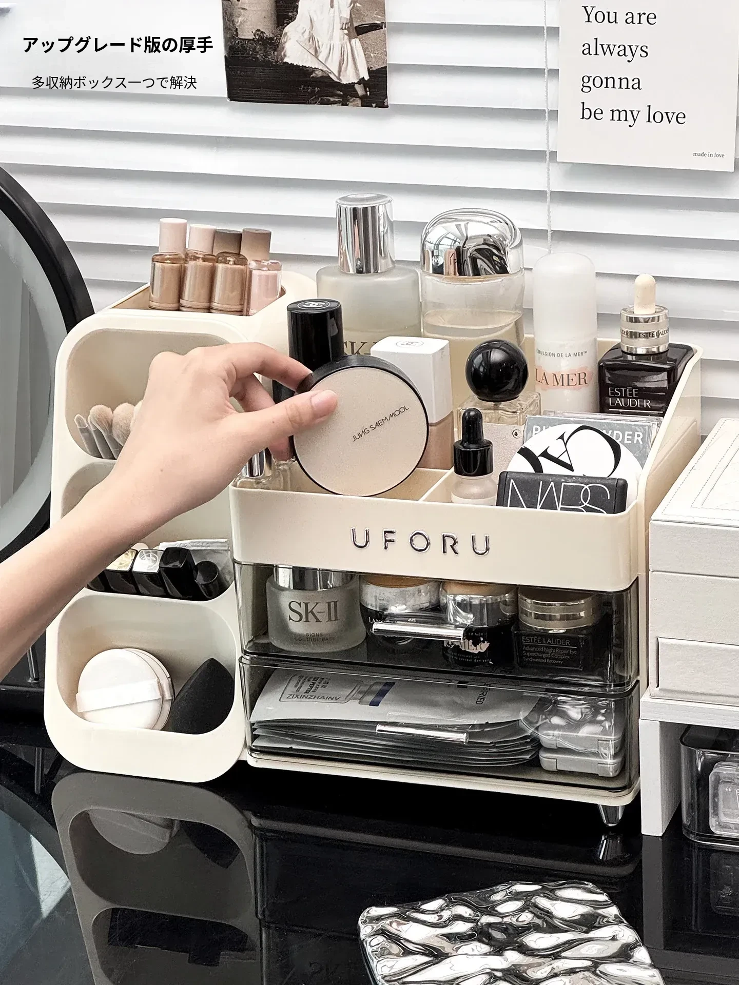 デスク上の高級感あふれる化粧品収納ボックス!大容量のコスメティックオーガナイザーで、メイク台をすっきり整頓。引き出し式で口紅やスキンケア製品を整理整頓。あなたのビューティーライフをもっと快適に!