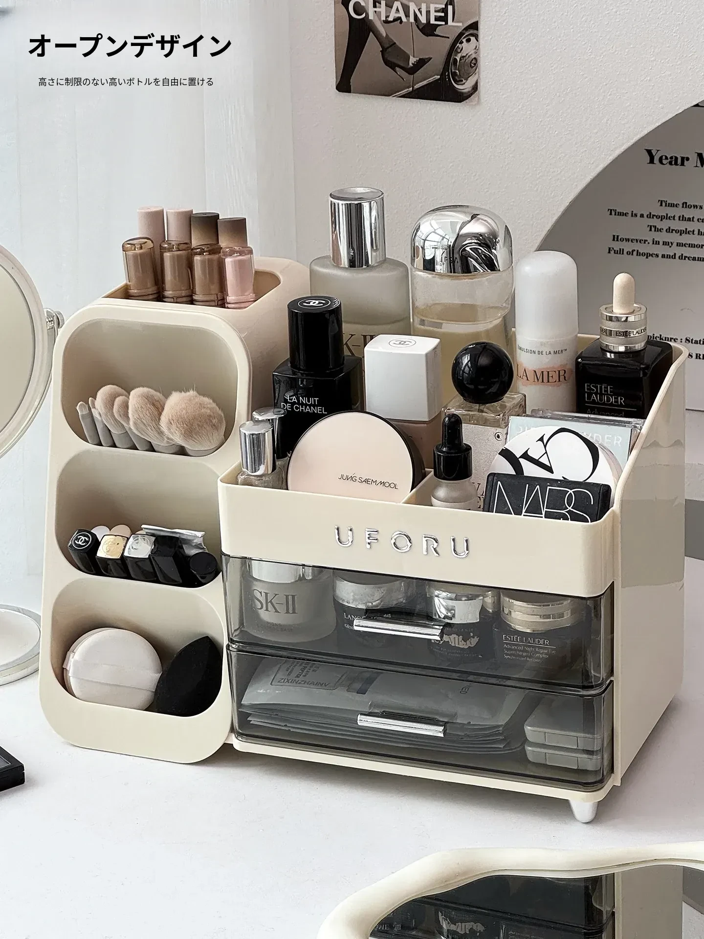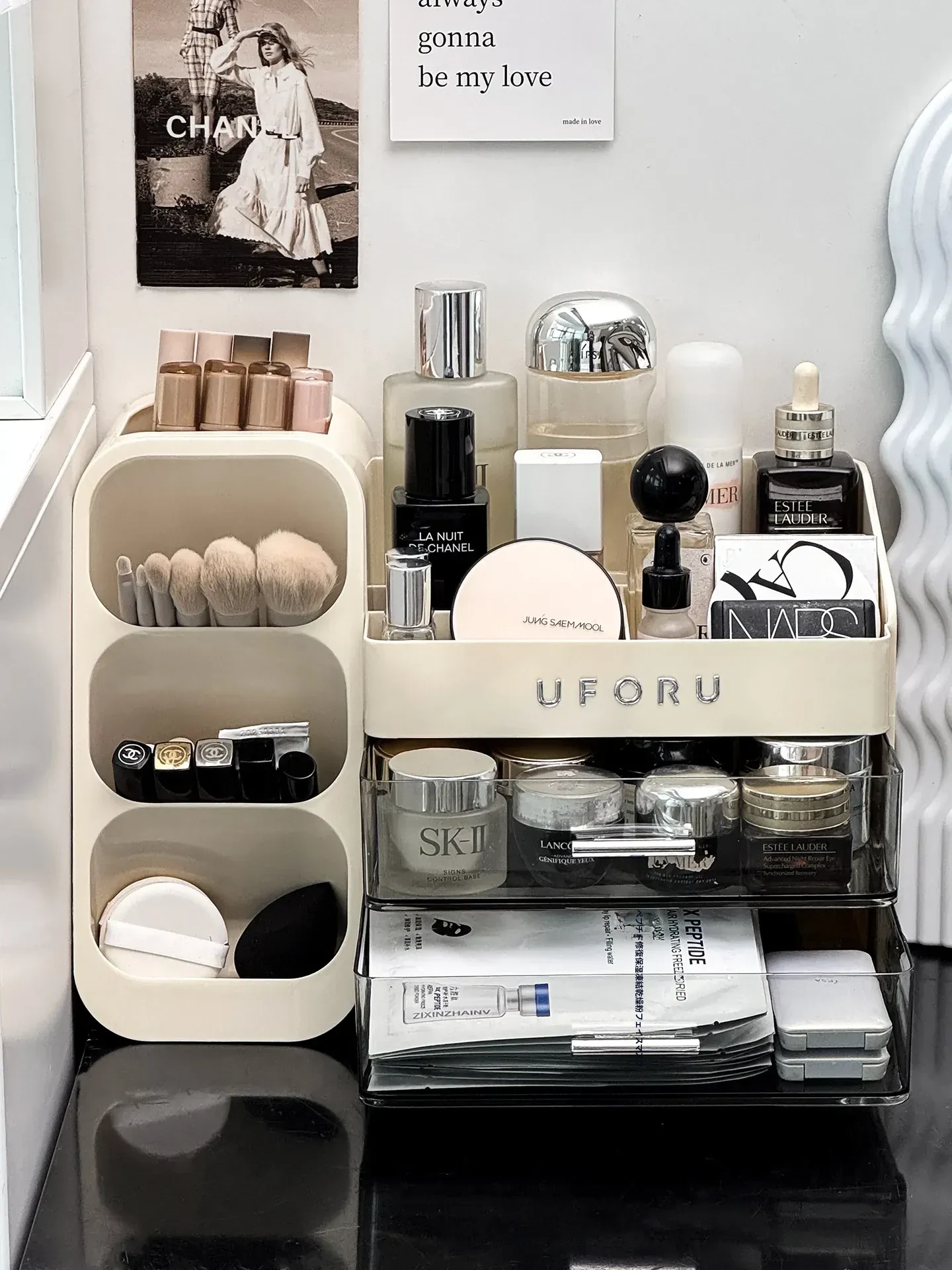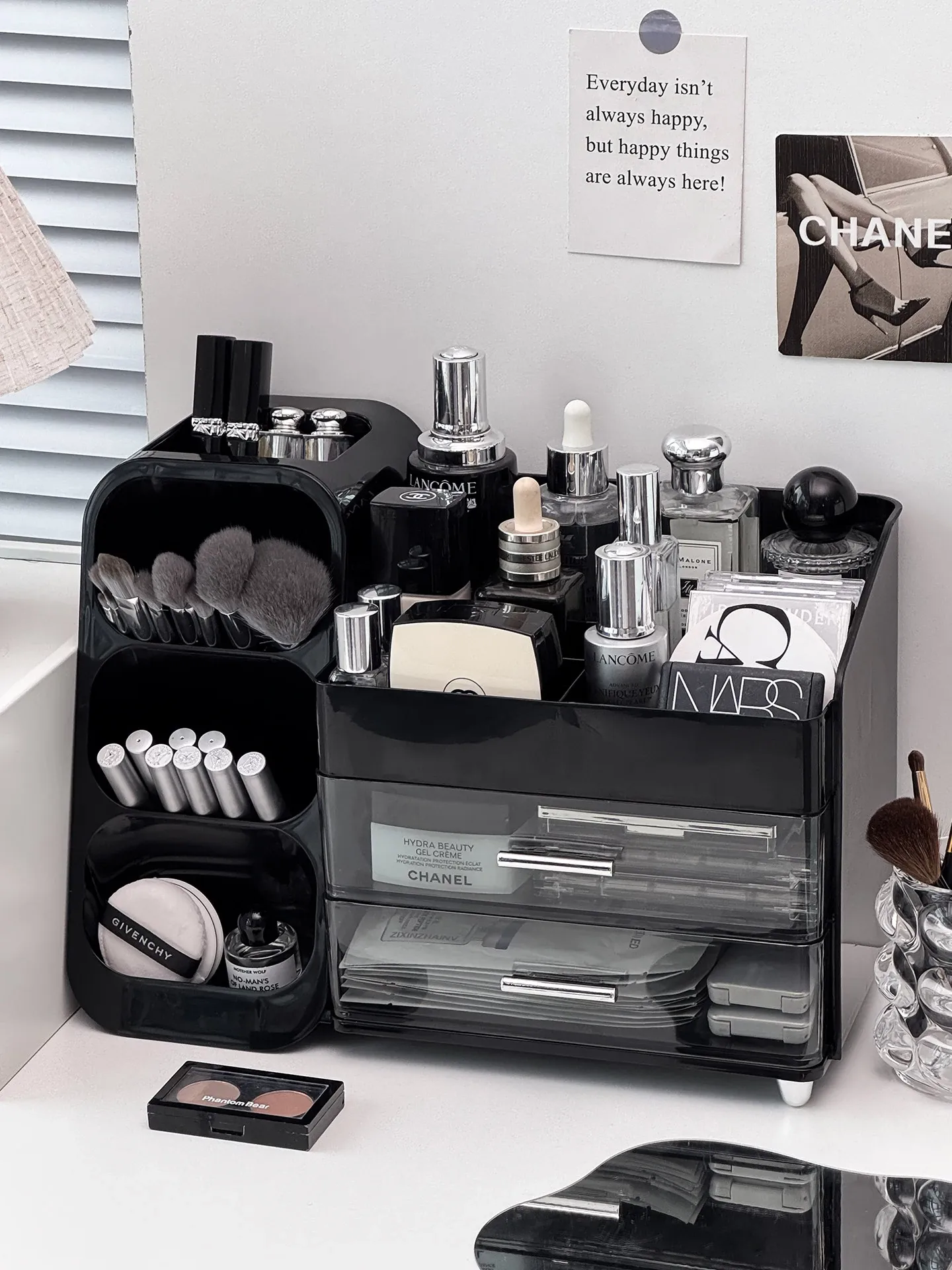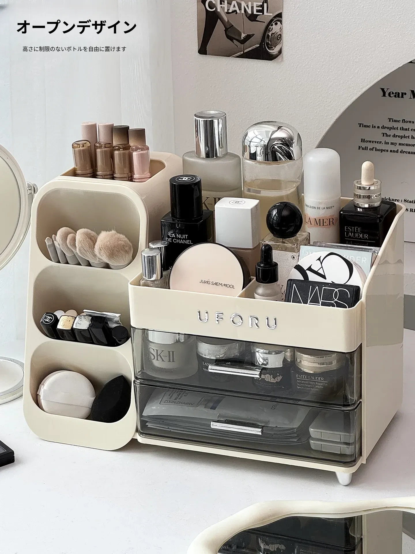 デスク上の高級感あふれる化粧品収納ボックス!大容量のコスメティックオーガナイザーで、メイク台をすっきり整頓。引き出し式で口紅やスキンケア製品を整理整頓。あなたのビューティーライフをもっと快適に!