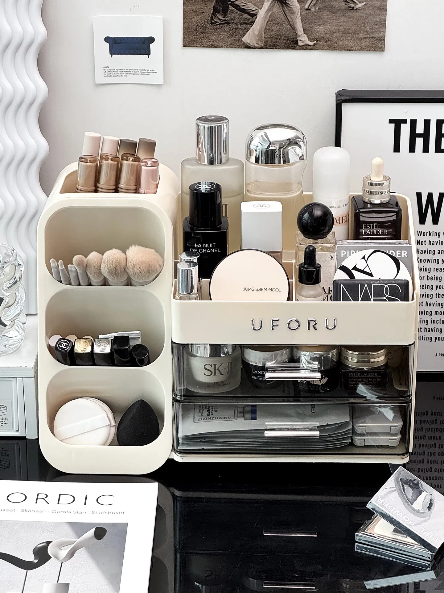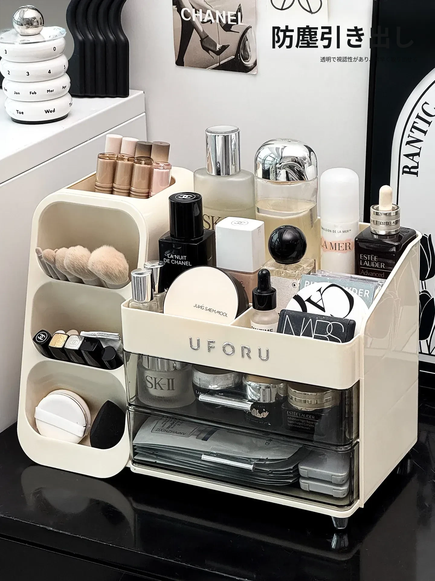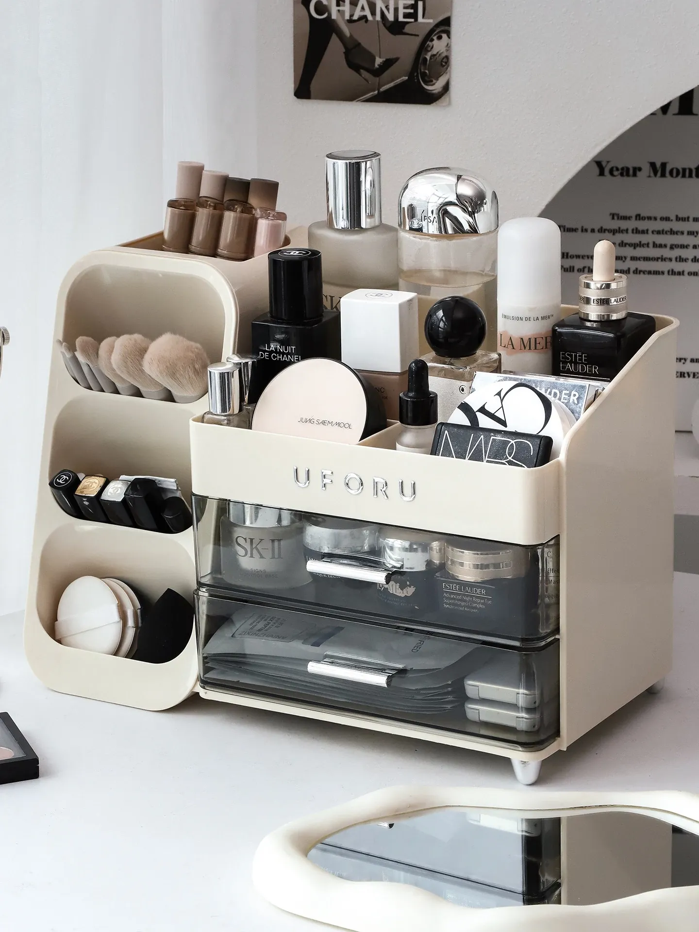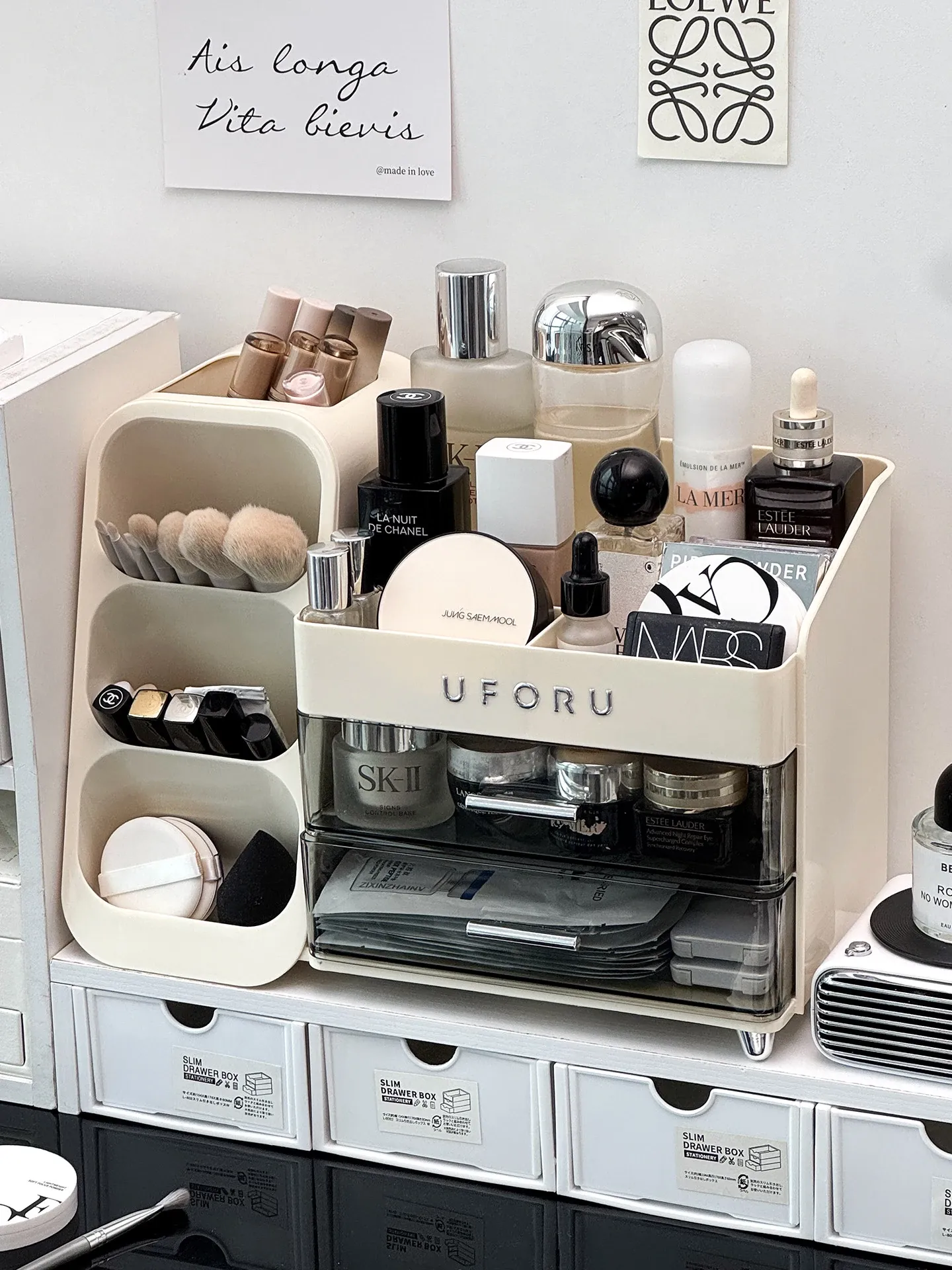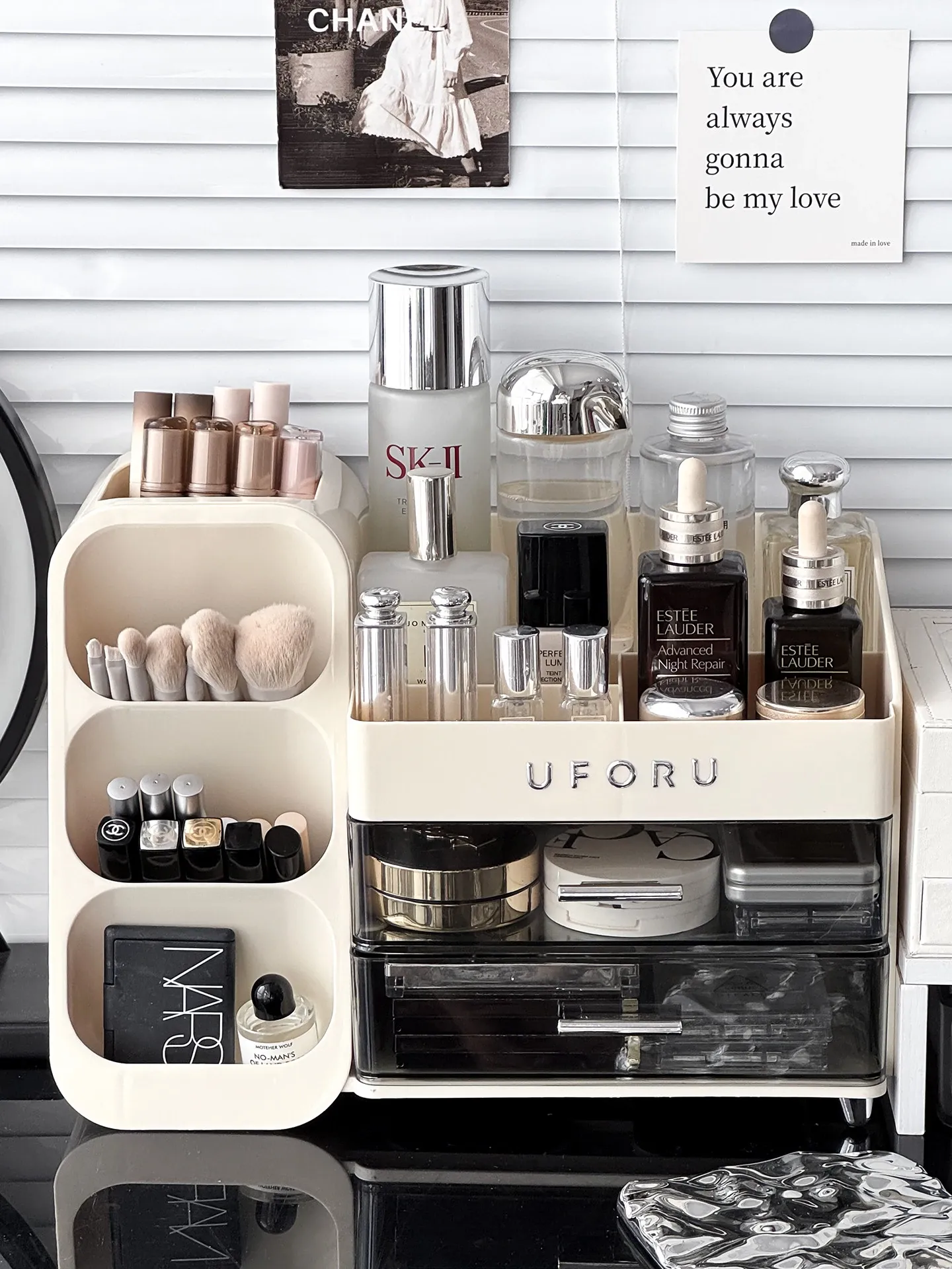 デスク上の高級感あふれる化粧品収納ボックス!大容量のコスメティックオーガナイザーで、メイク台をすっきり整頓。引き出し式で口紅やスキンケア製品を整理整頓。あなたのビューティーライフをもっと快適に!