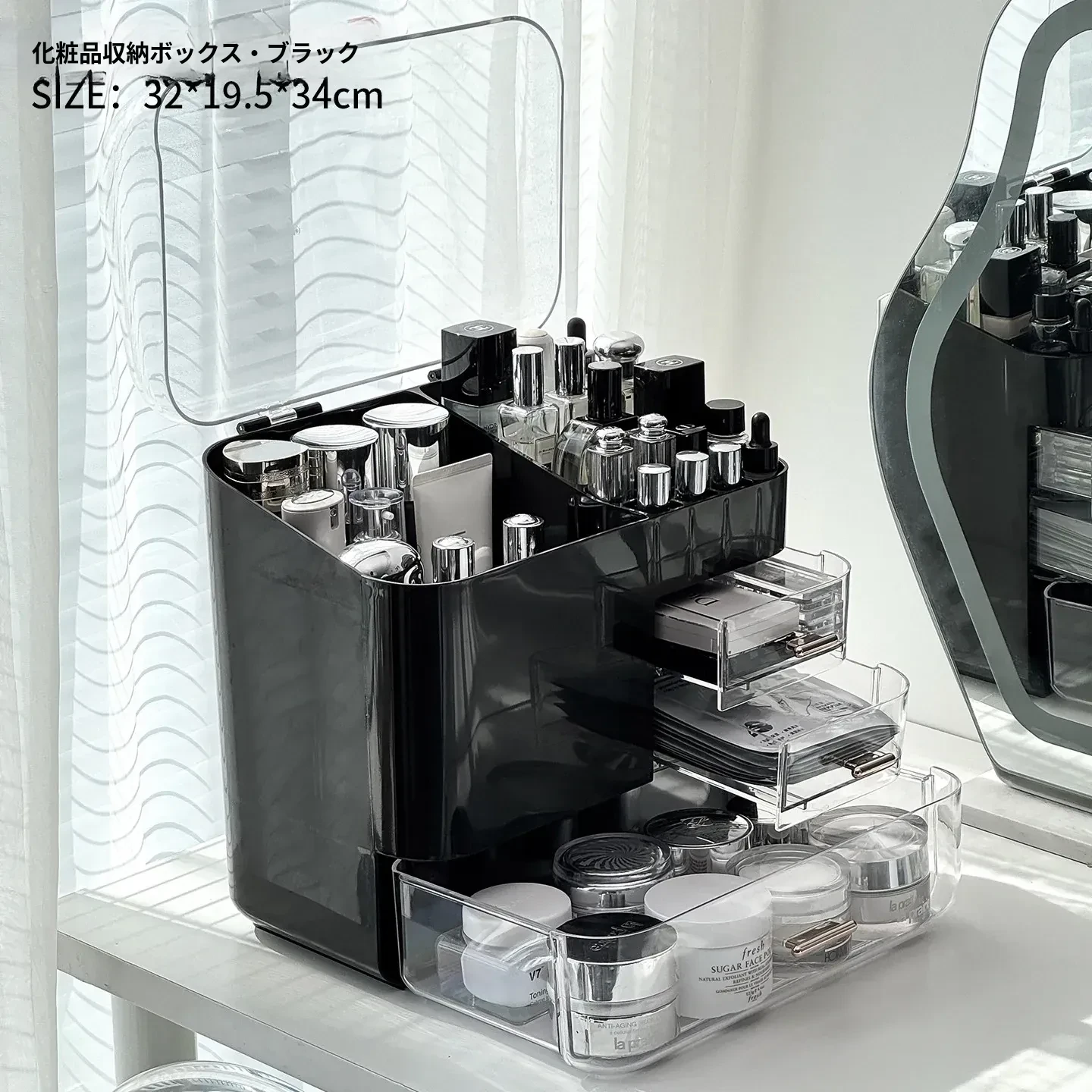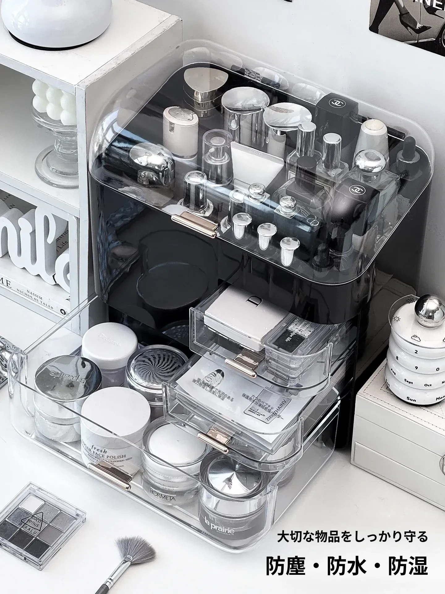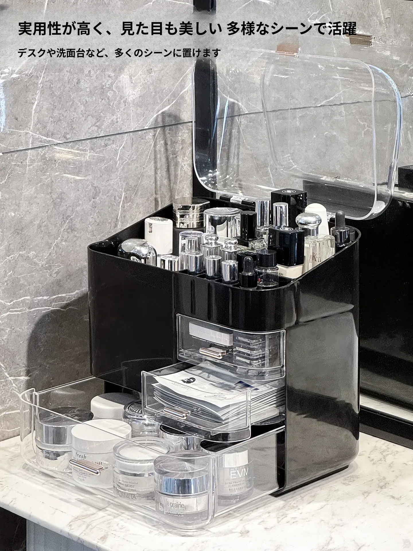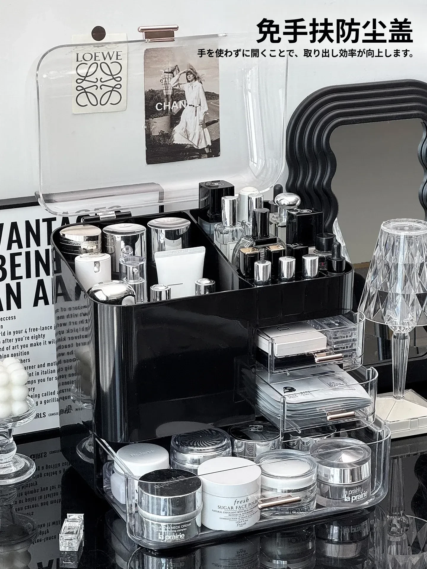 高級感あふれる化粧品収納ボックス|デスク上のほこりを防ぎ、大容量でスキンケア用品をすっきり整理!化粧台や口紅の整理に最適な収納ラックです。