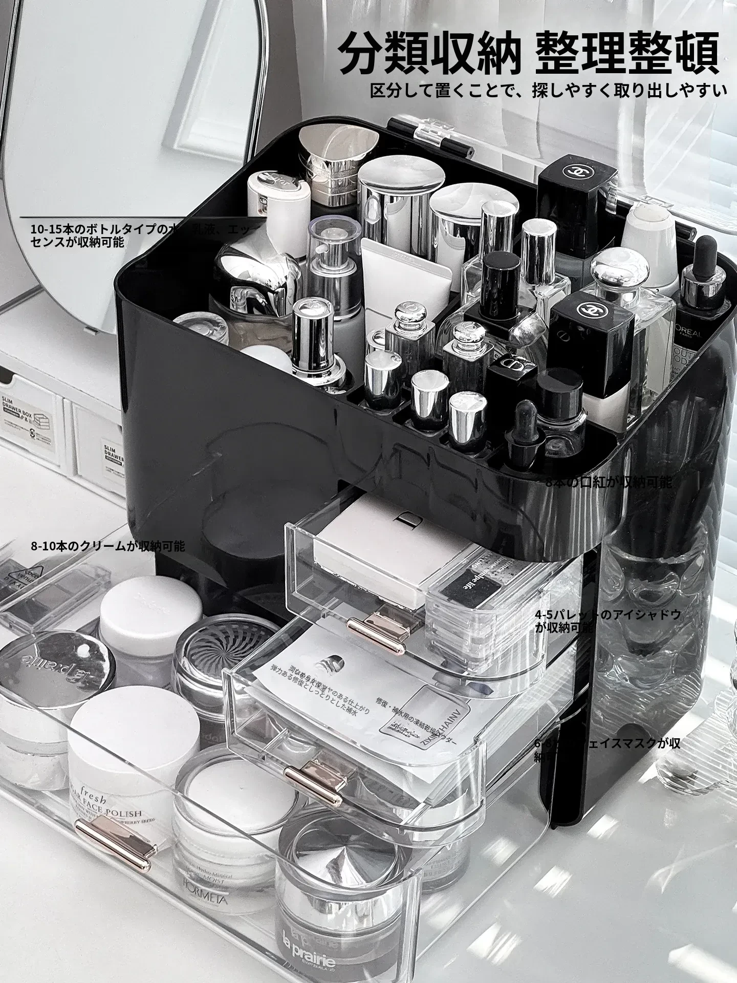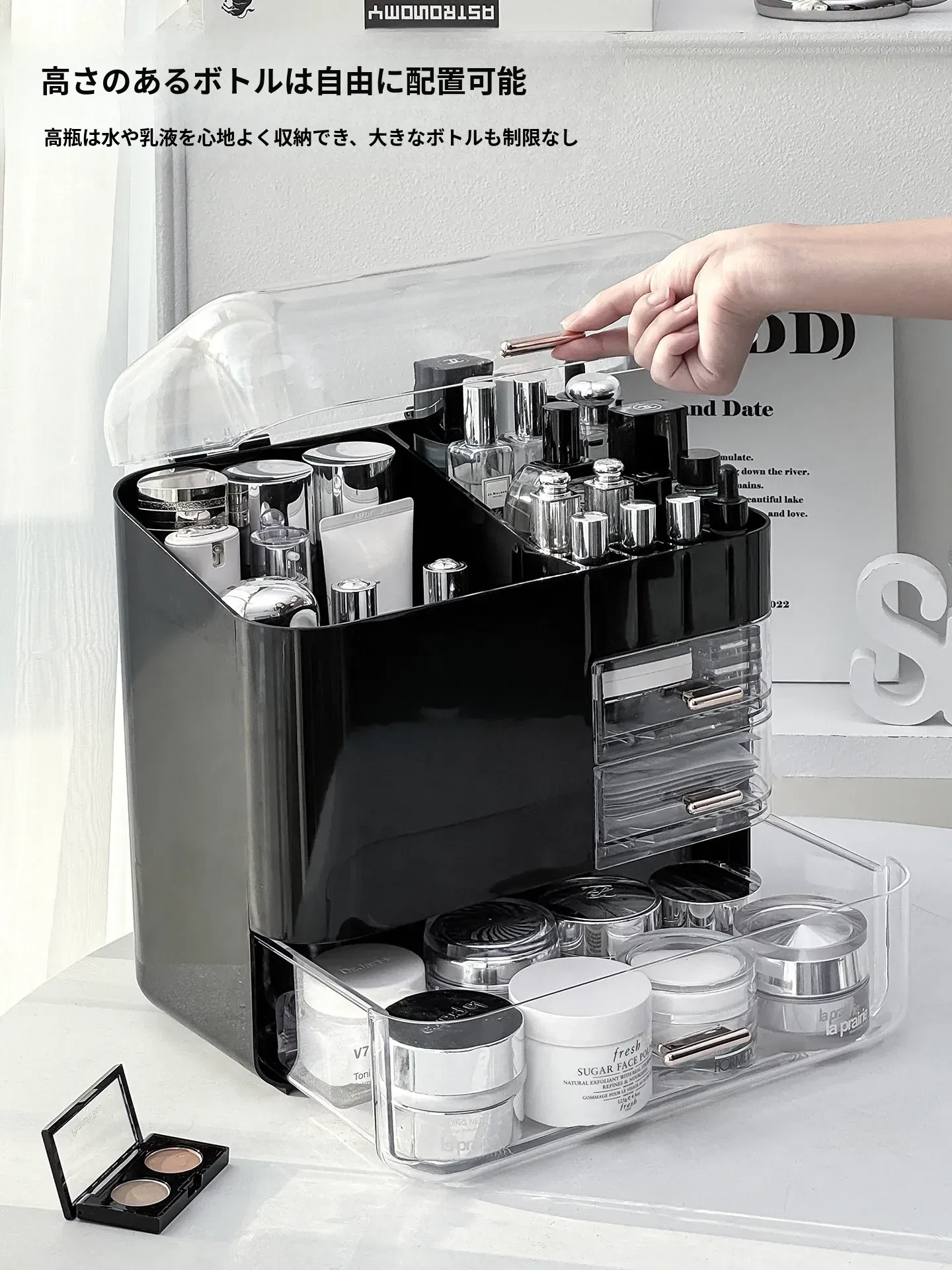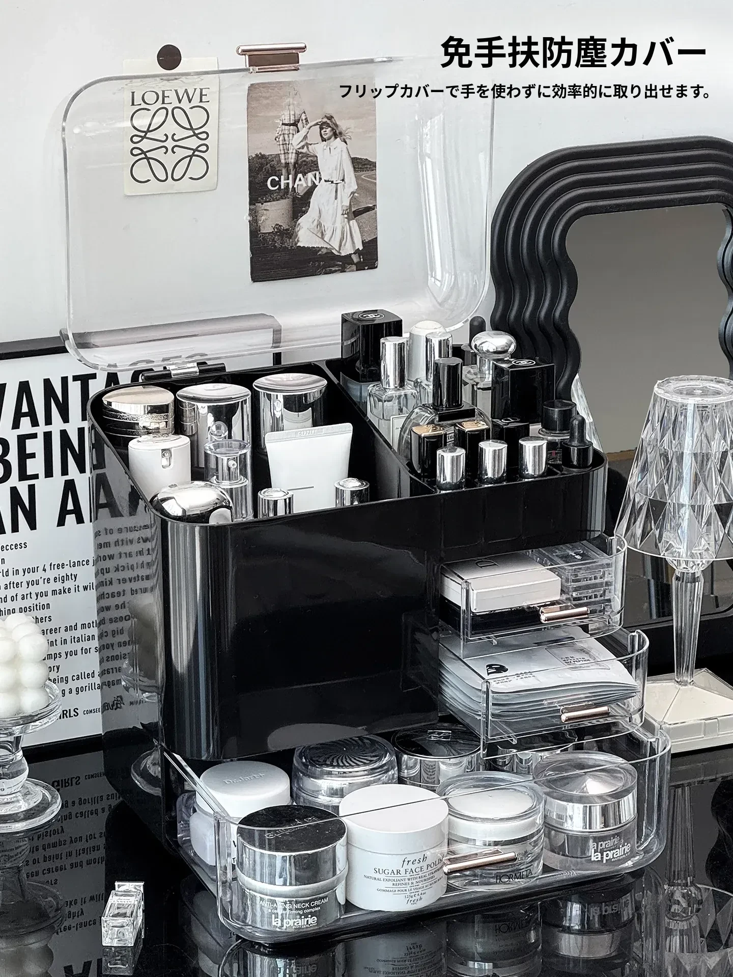 高級感あふれる化粧品収納ボックス|デスク上のほこりを防ぎ、大容量でスキンケア用品をすっきり整理!化粧台や口紅の整理に最適な収納ラックです。