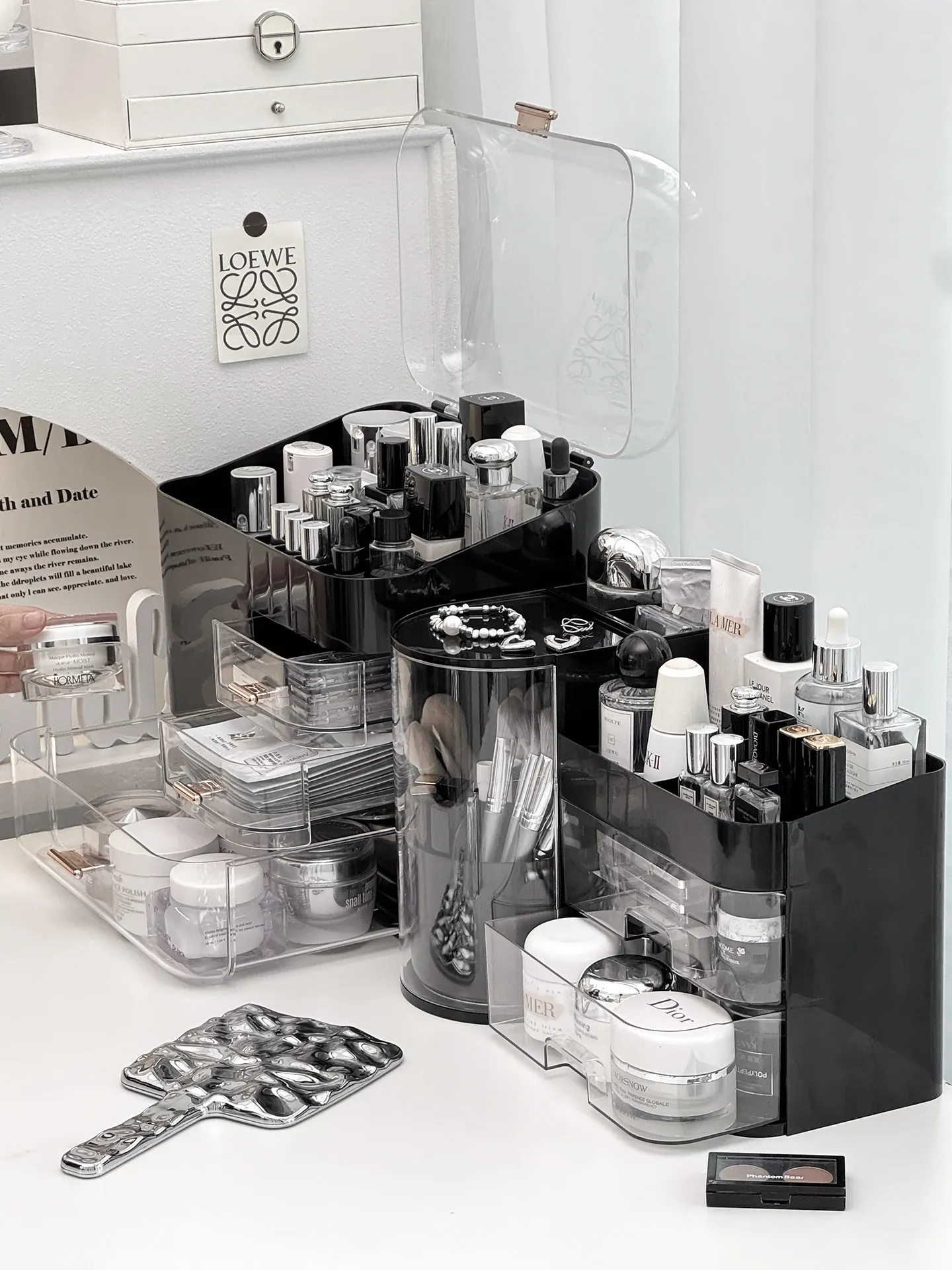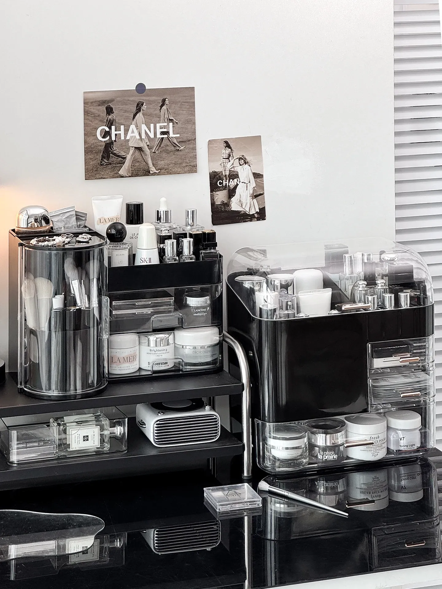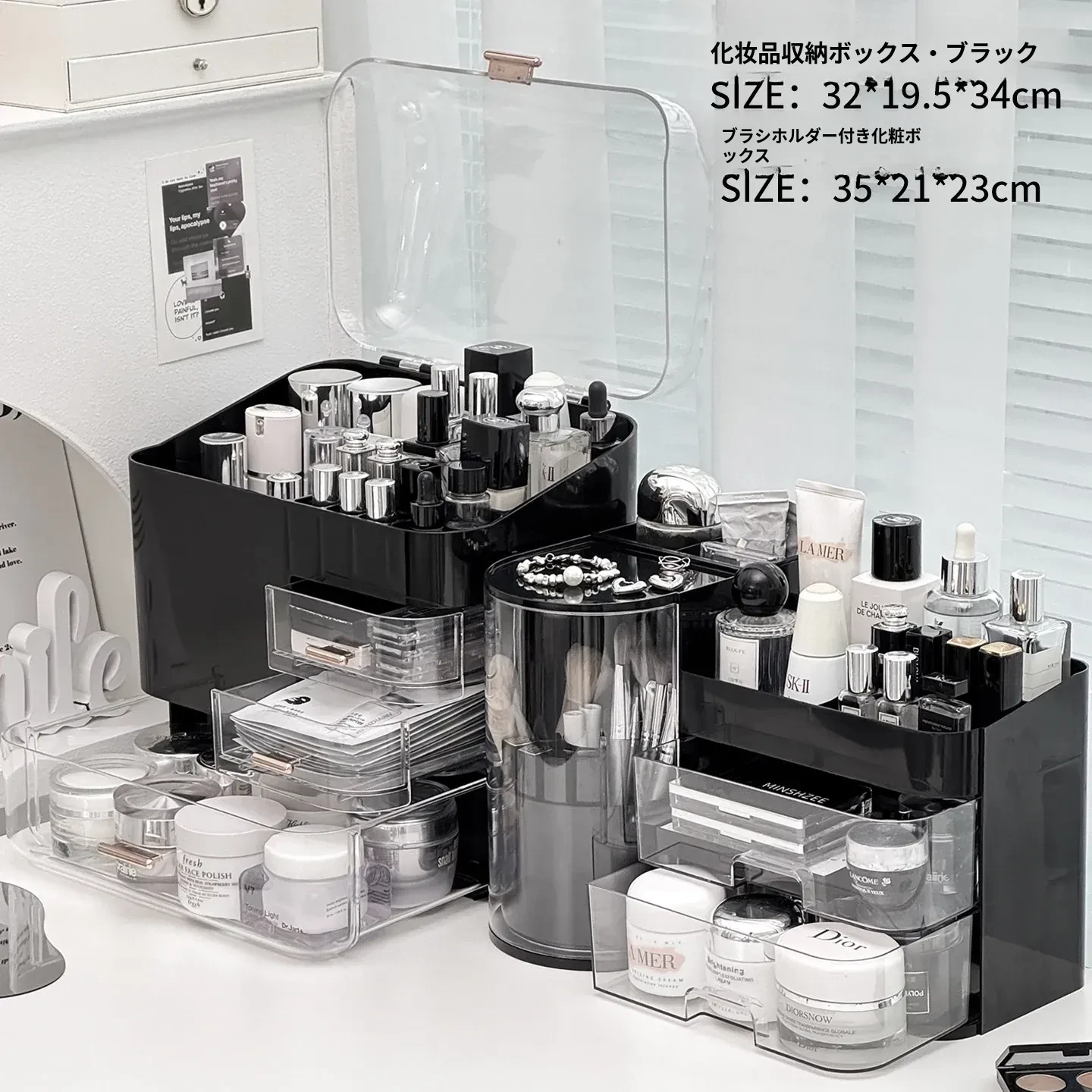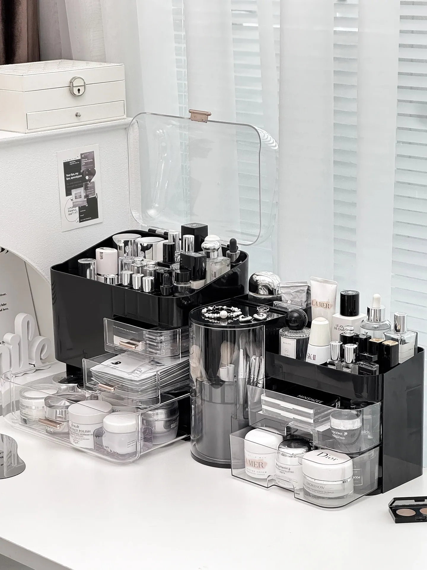 高級感あふれる化粧品収納ボックス|デスク上のほこりを防ぎ、大容量でスキンケア用品をすっきり整理!化粧台や口紅の整理に最適な収納ラックです。