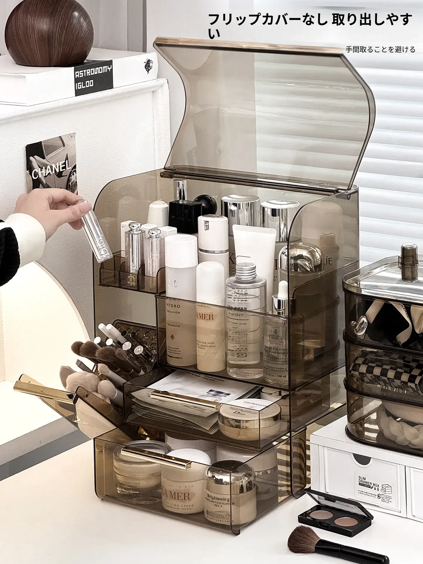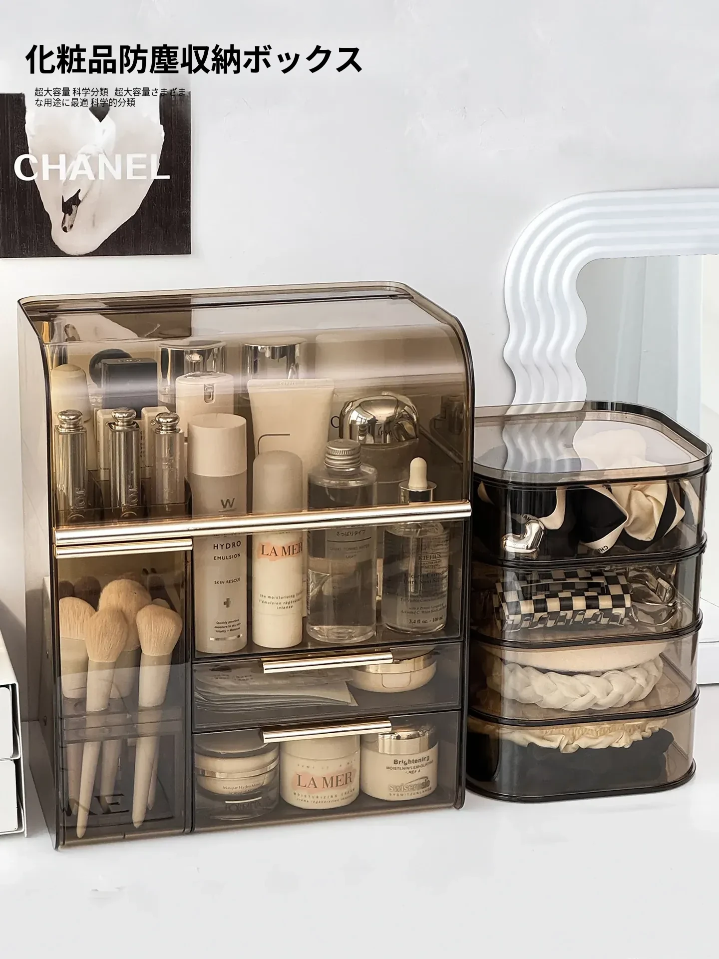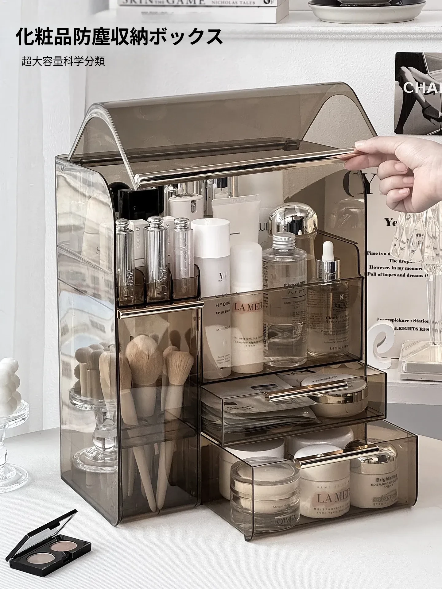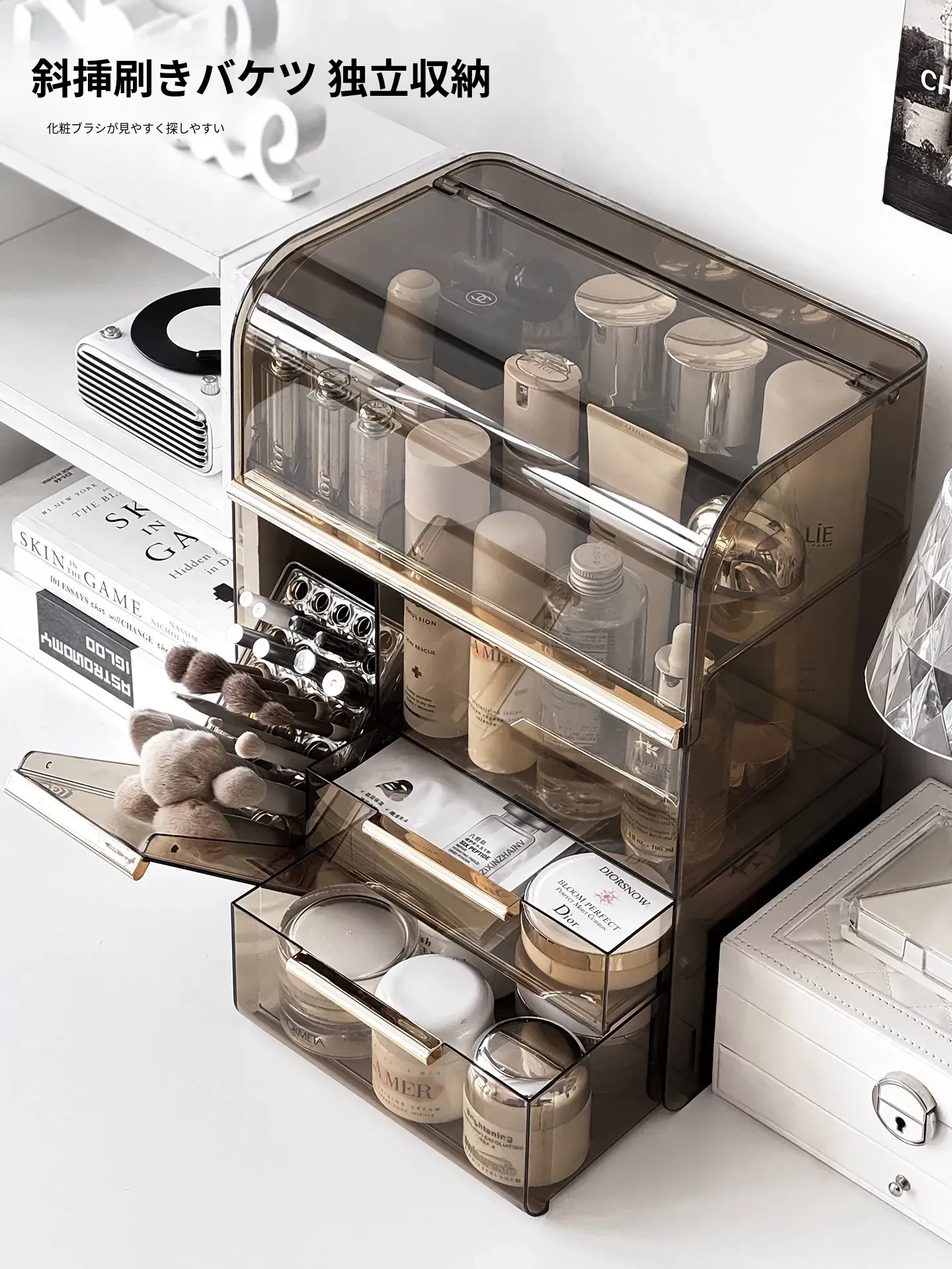 高級感溢れる化粧品収納ボックス - 大容量化粧ブラシスタンド、防塵仕様、光を避けるデザインで、洗練されたドレッサーを実現!あなたの美容アイテムを美しく整理整頓。
