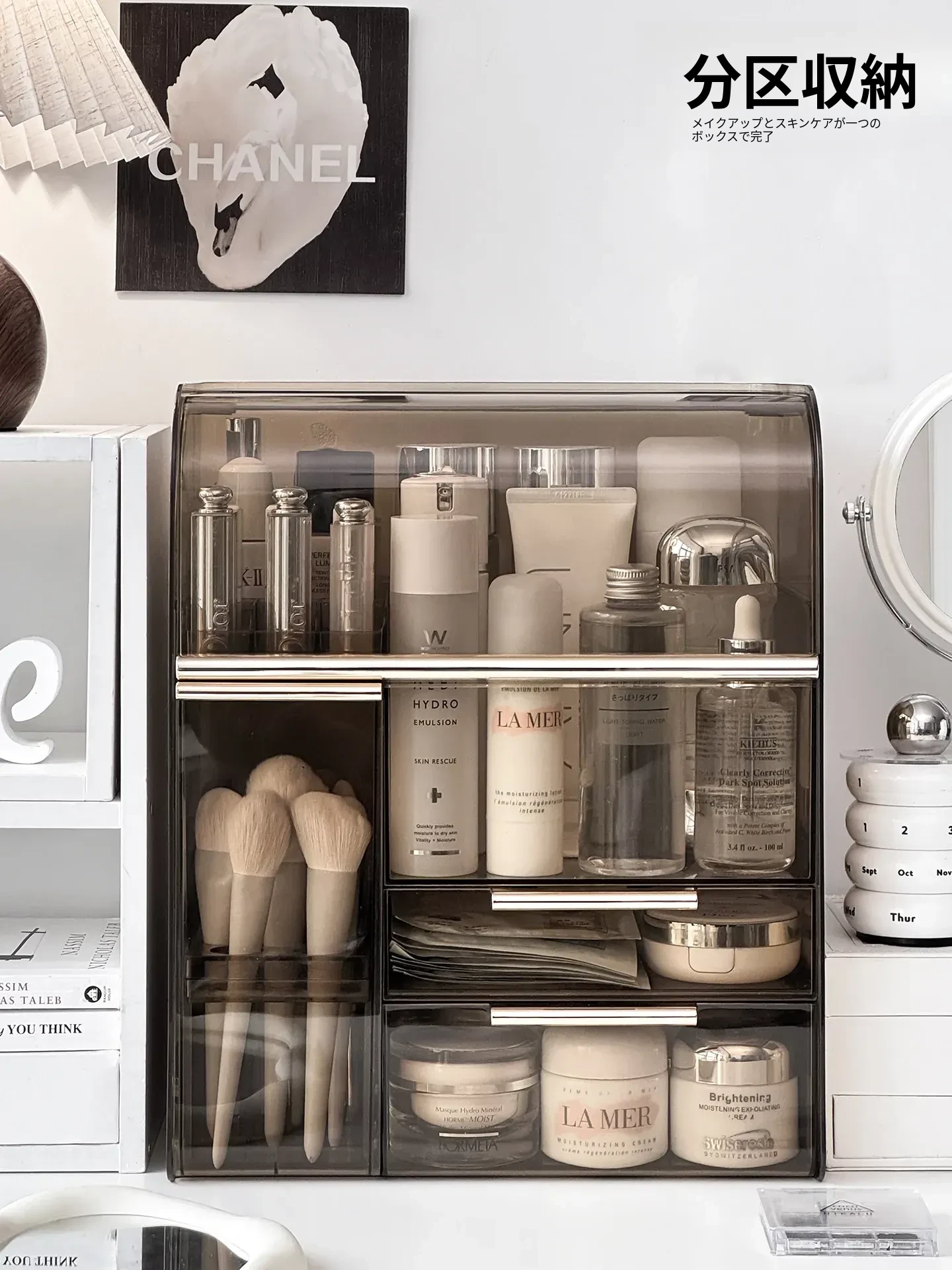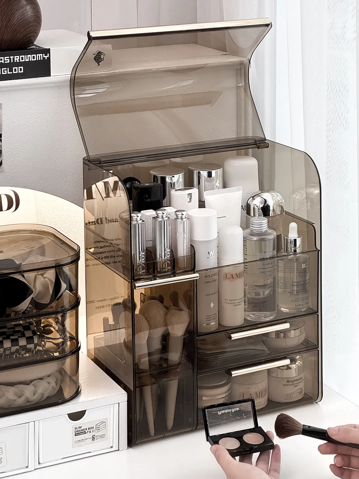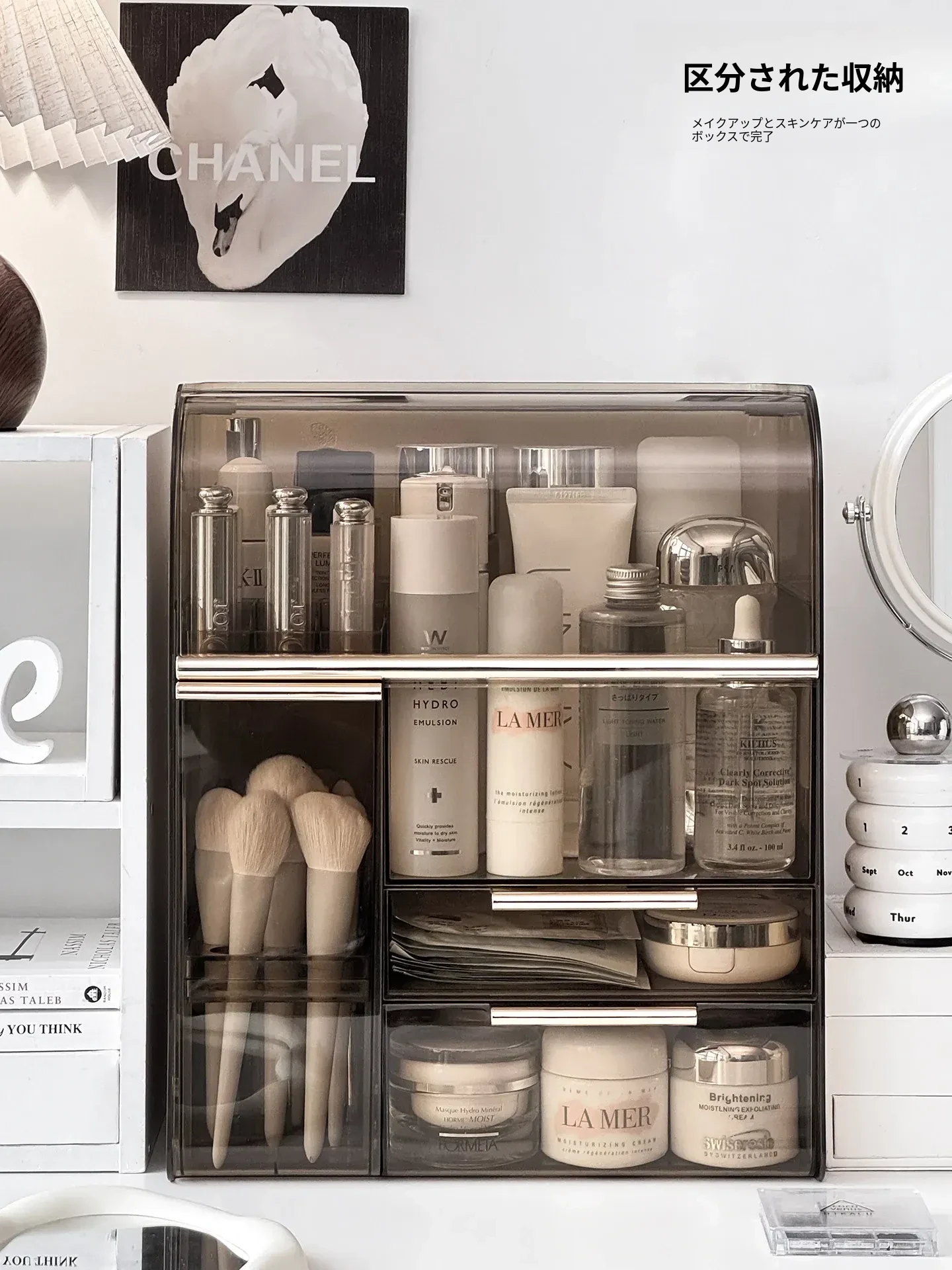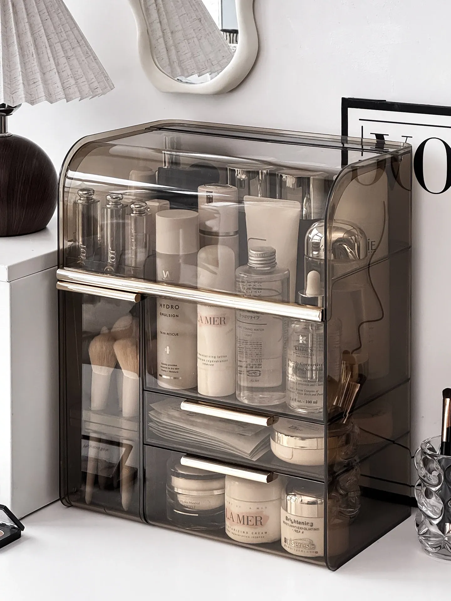 高級感溢れる化粧品収納ボックス - 大容量化粧ブラシスタンド、防塵仕様、光を避けるデザインで、洗練されたドレッサーを実現!あなたの美容アイテムを美しく整理整頓。