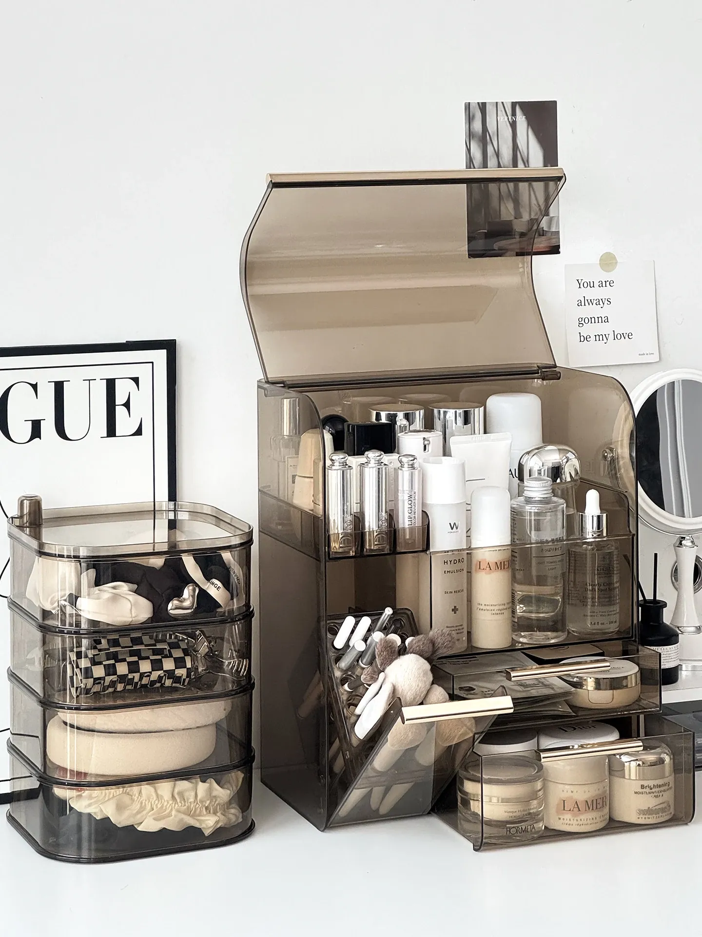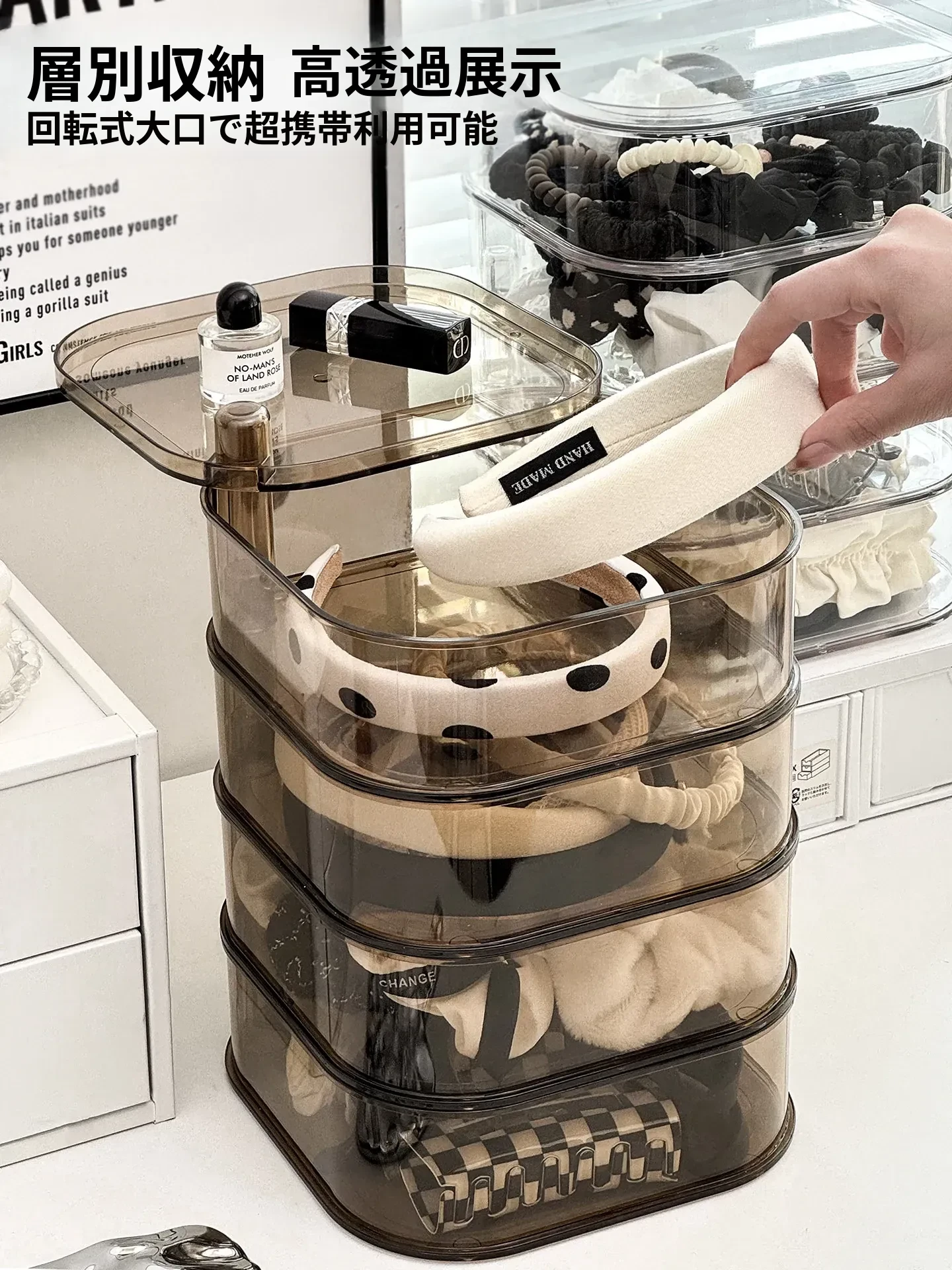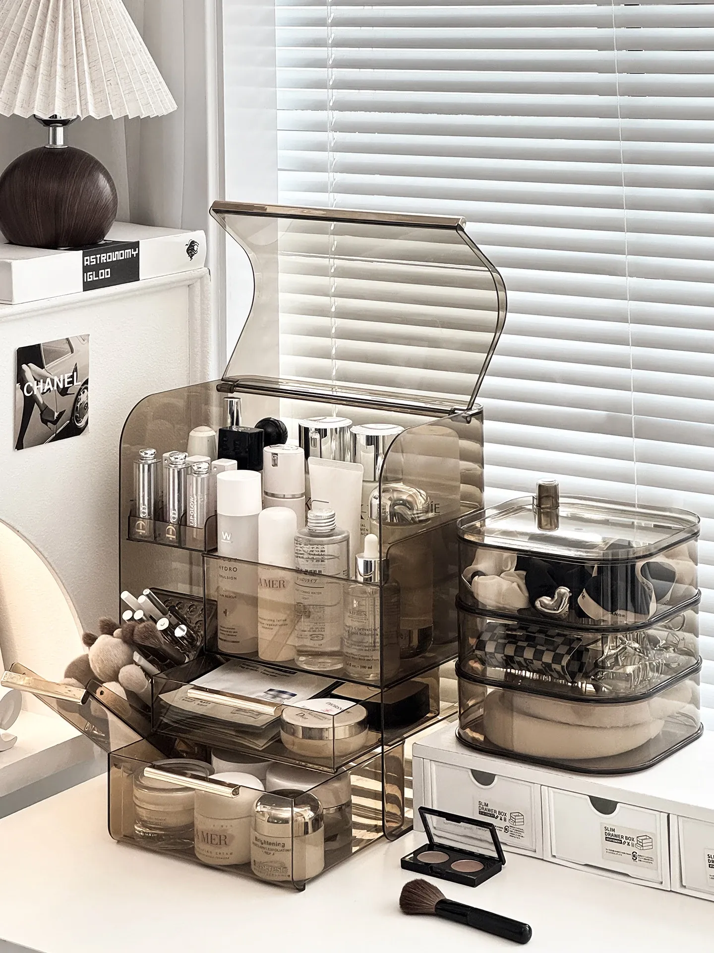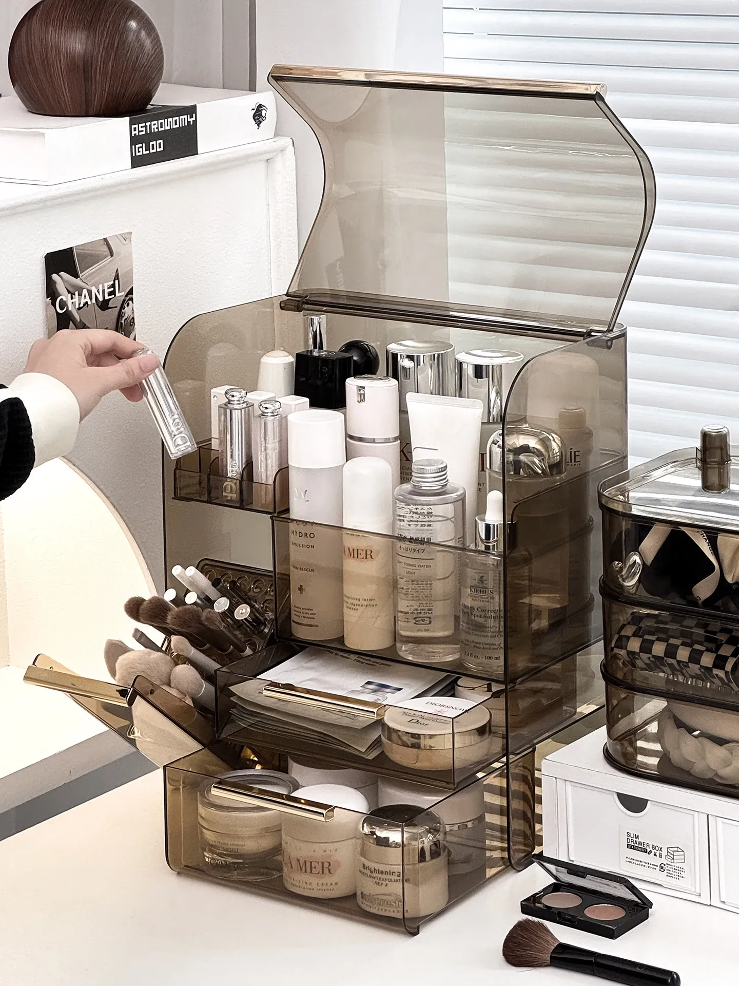 高級感溢れる化粧品収納ボックス - 大容量化粧ブラシスタンド、防塵仕様、光を避けるデザインで、洗練されたドレッサーを実現!あなたの美容アイテムを美しく整理整頓。