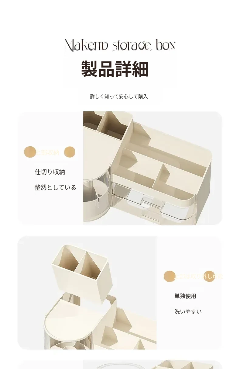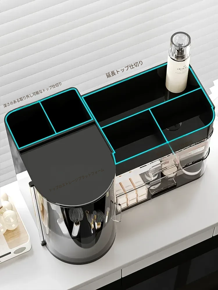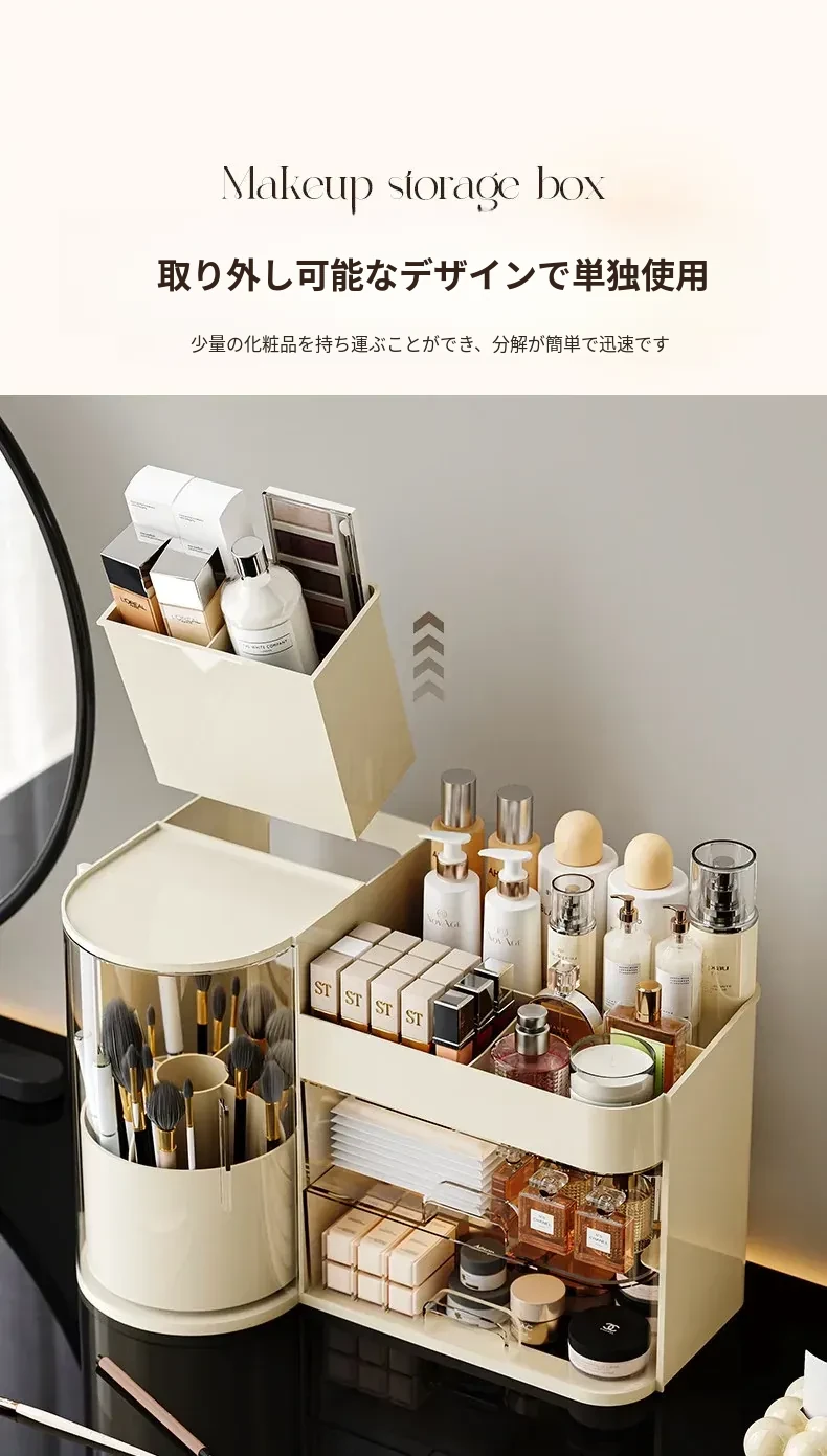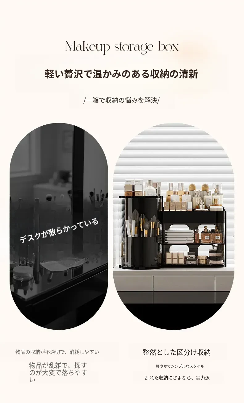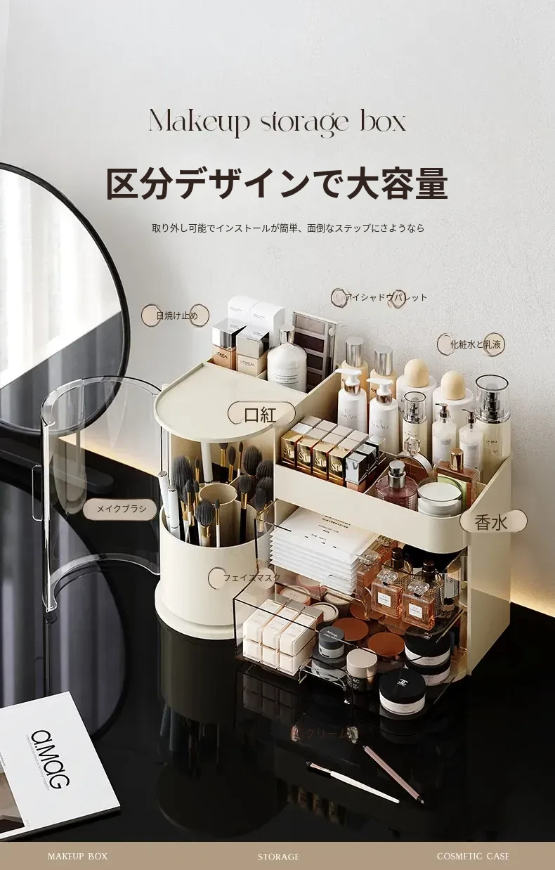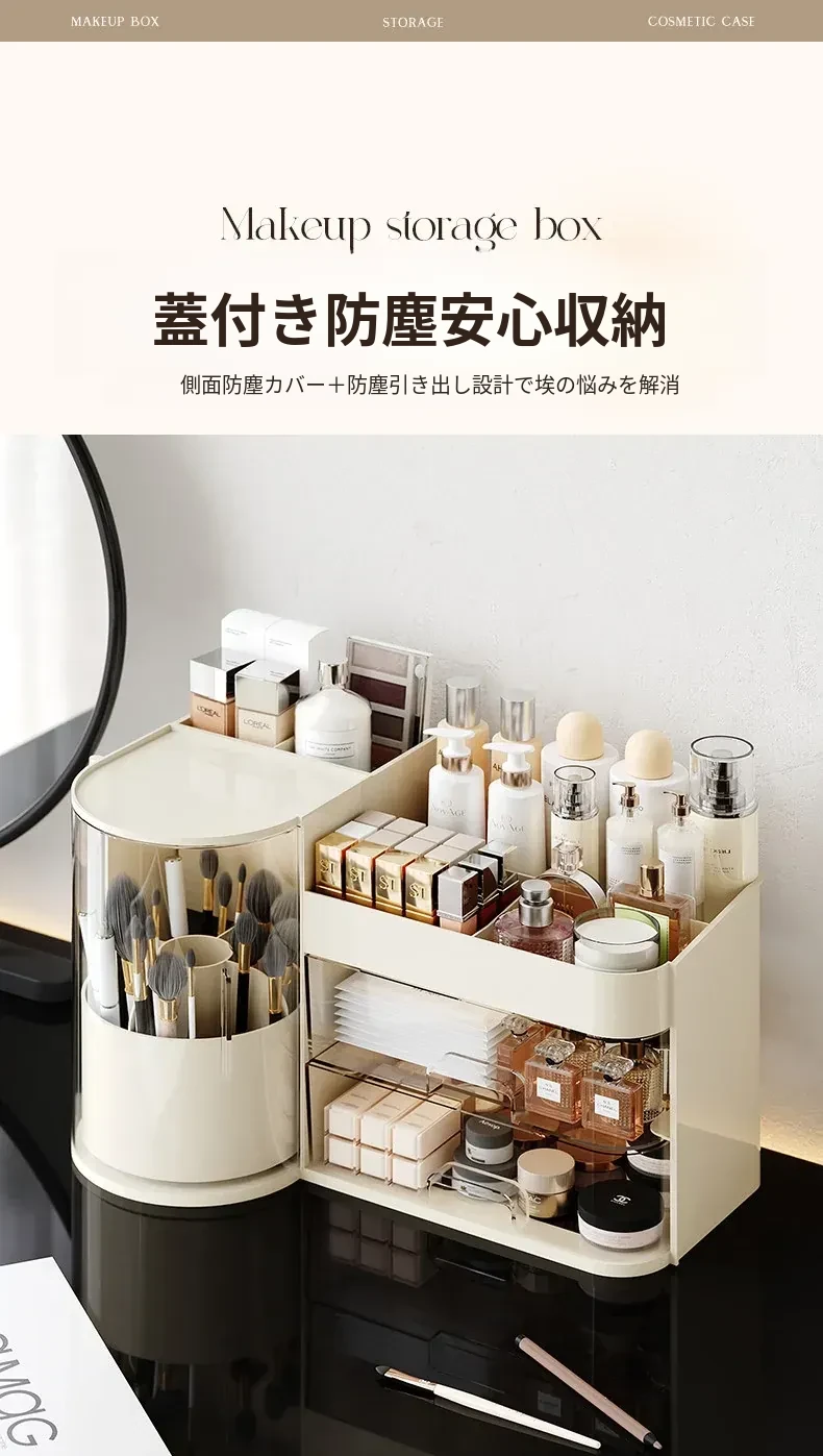 高級感漂うデスク用化粧品収納ボックス - 回転式防塵メイクブラシスタンド、ラグジュアリーな仕切り付きリップ・香水整理ケース!おしゃれで機能的な収納で、あなたのメイクアップをもっと楽しく!