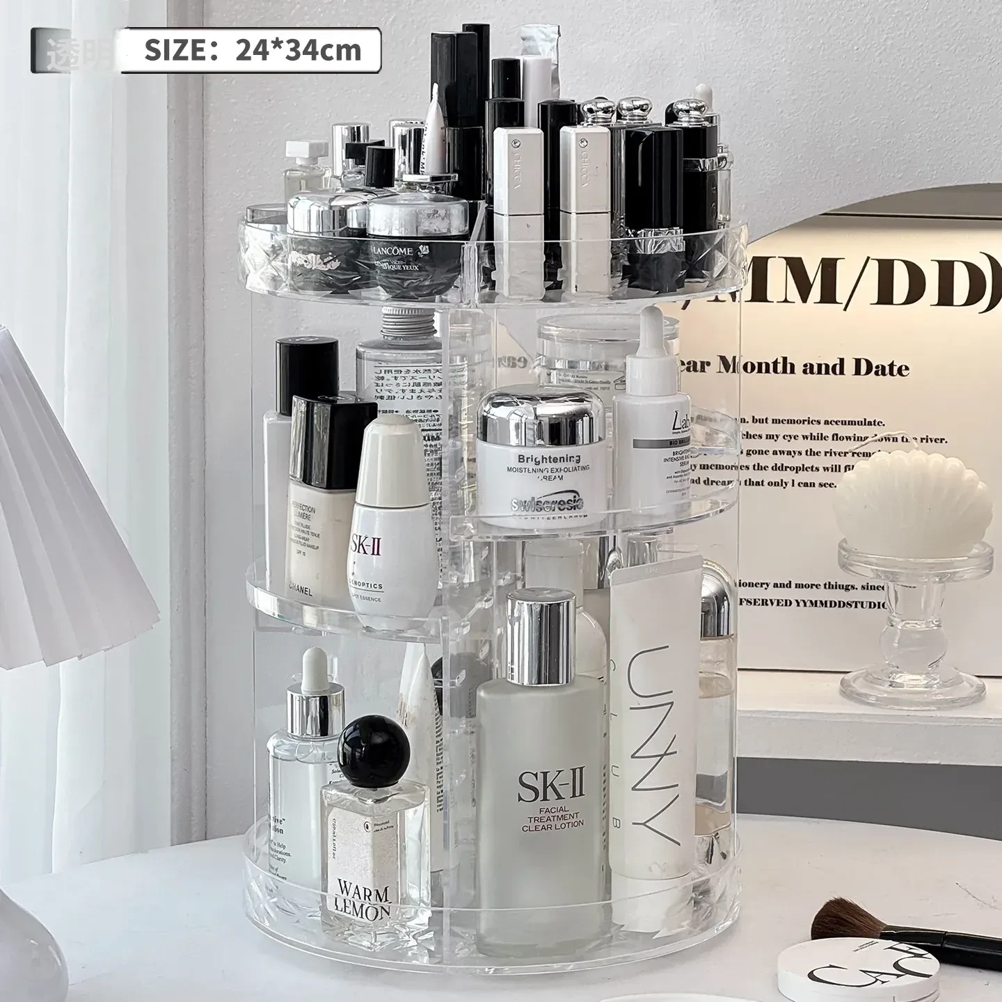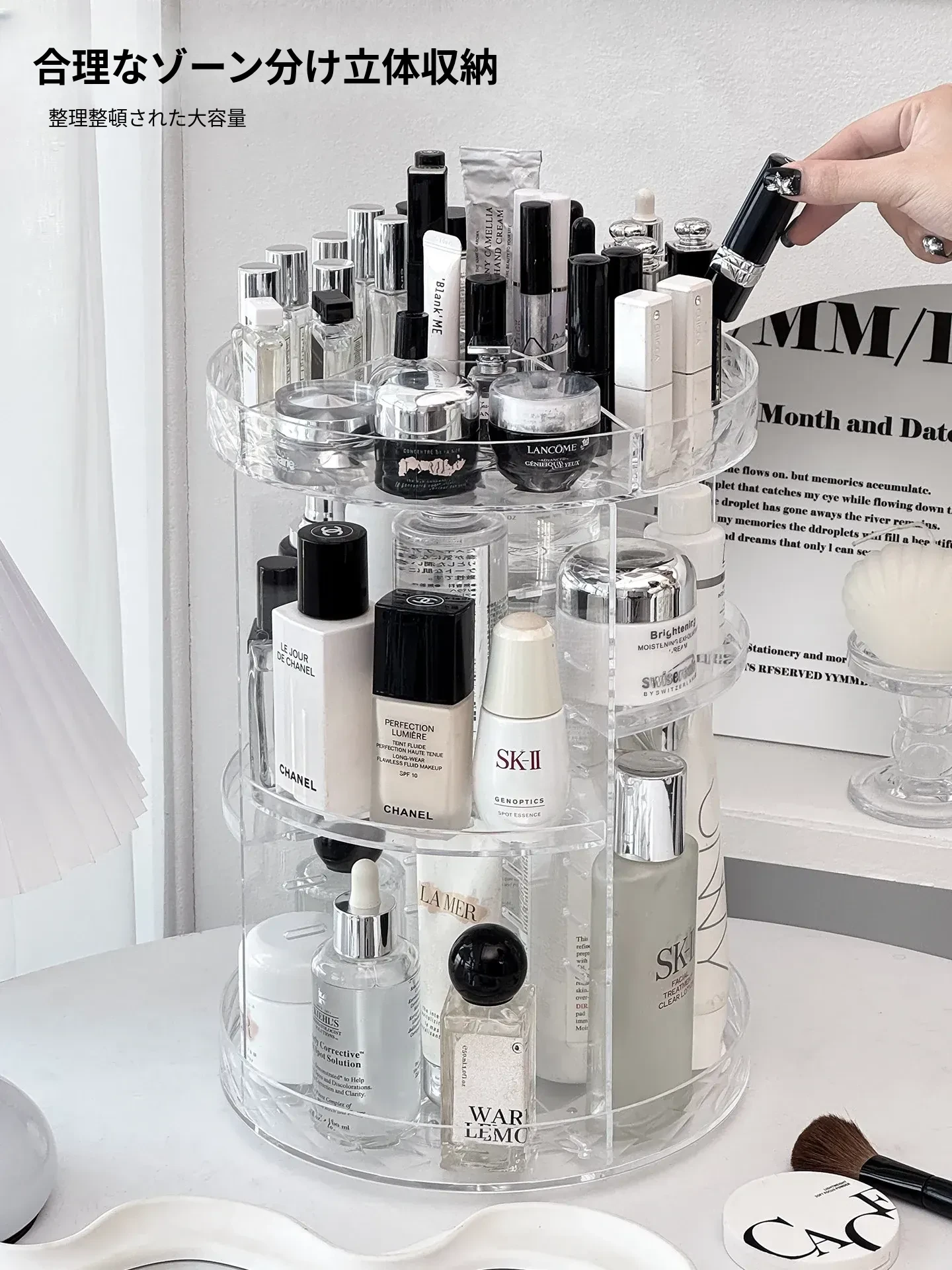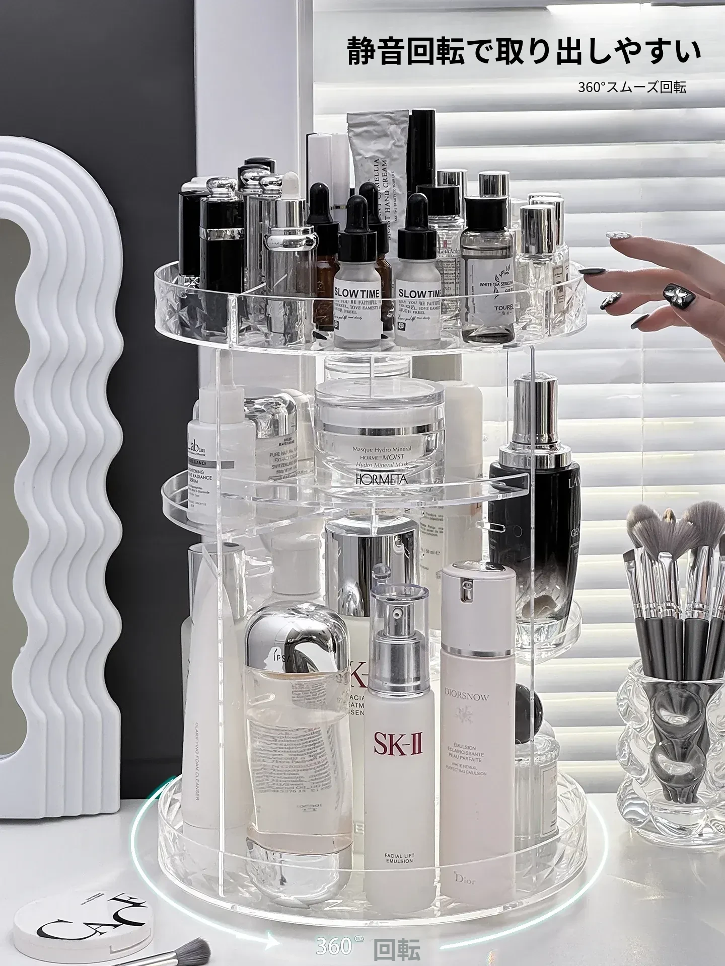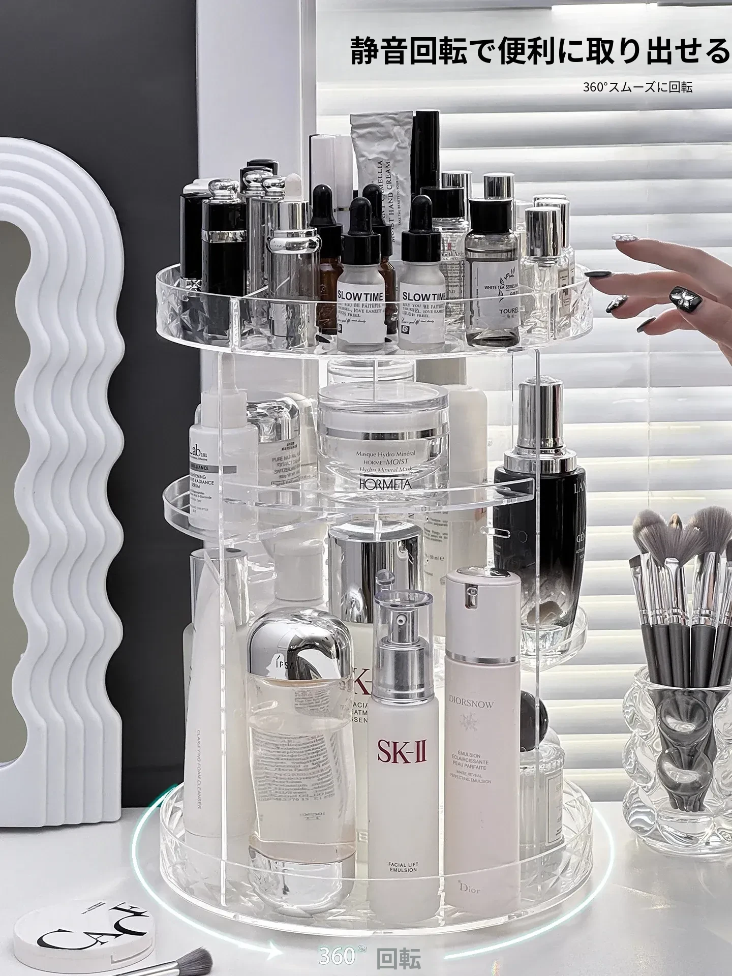 回転式デスクトップコスメ収納ボックス - 高級感あふれる化粧台!透明デザインで口紅や香水をすっきり整理、スキンケア用品も簡単アクセス。美しさを引き立てる必須アイテム!