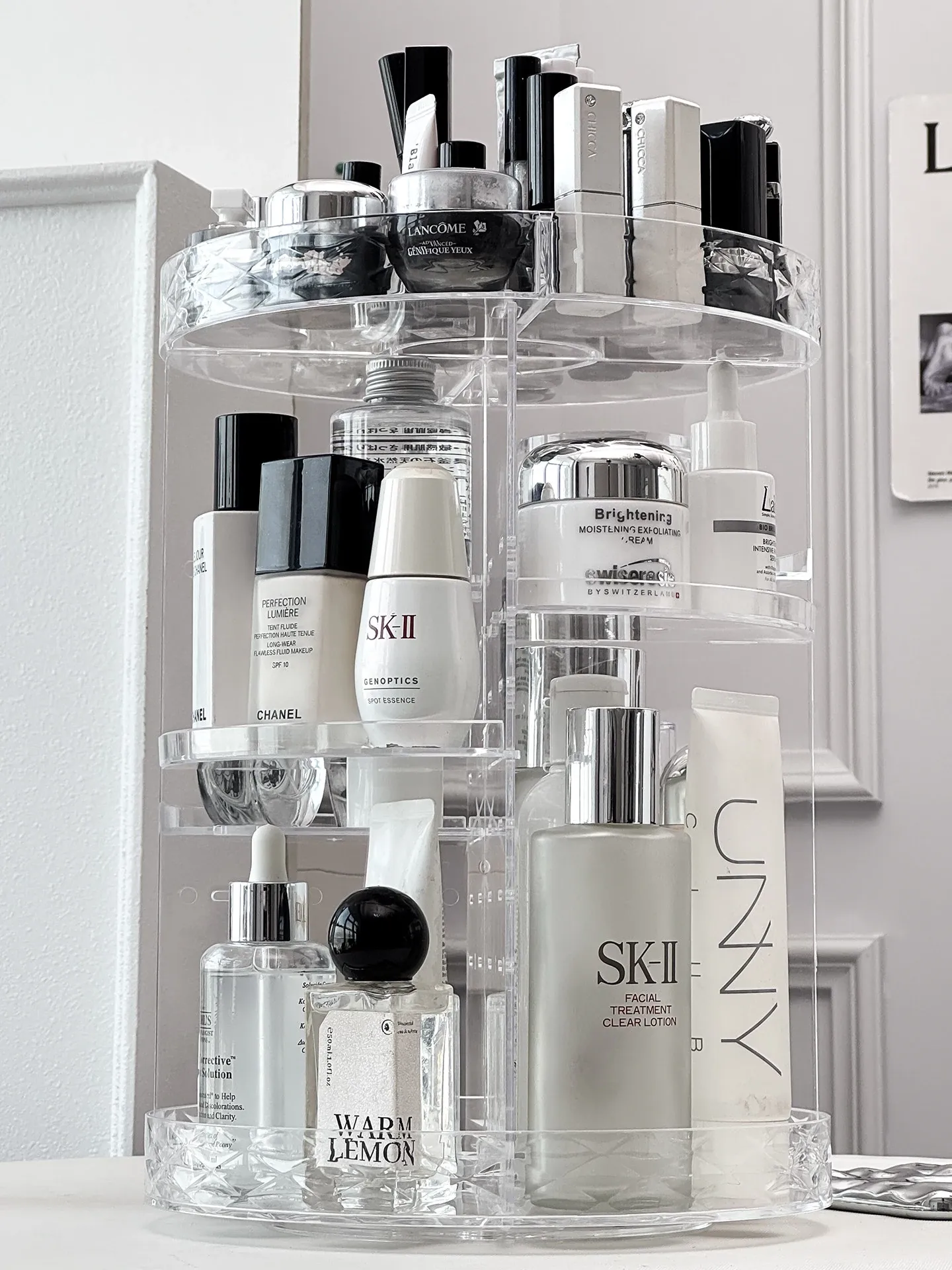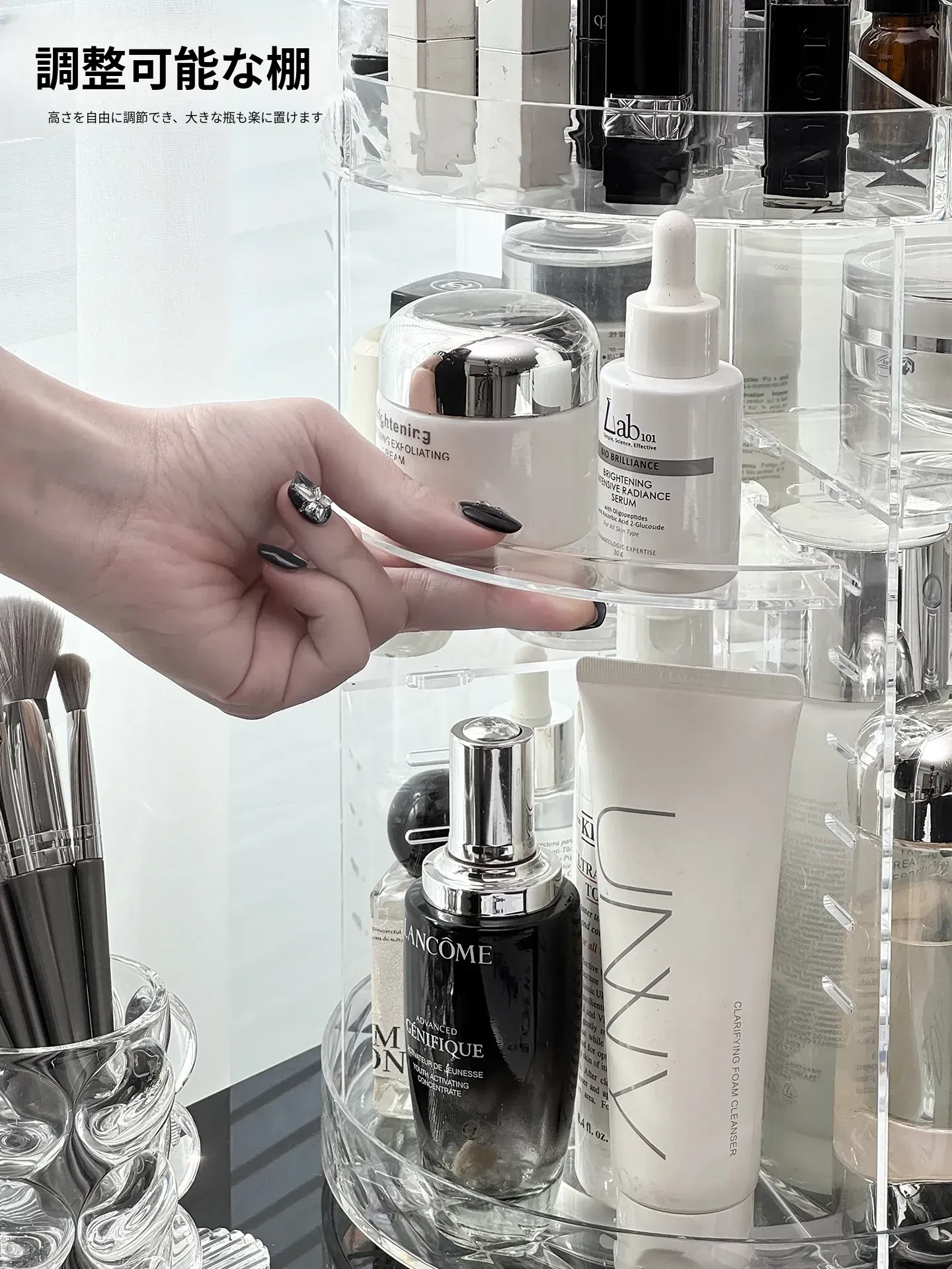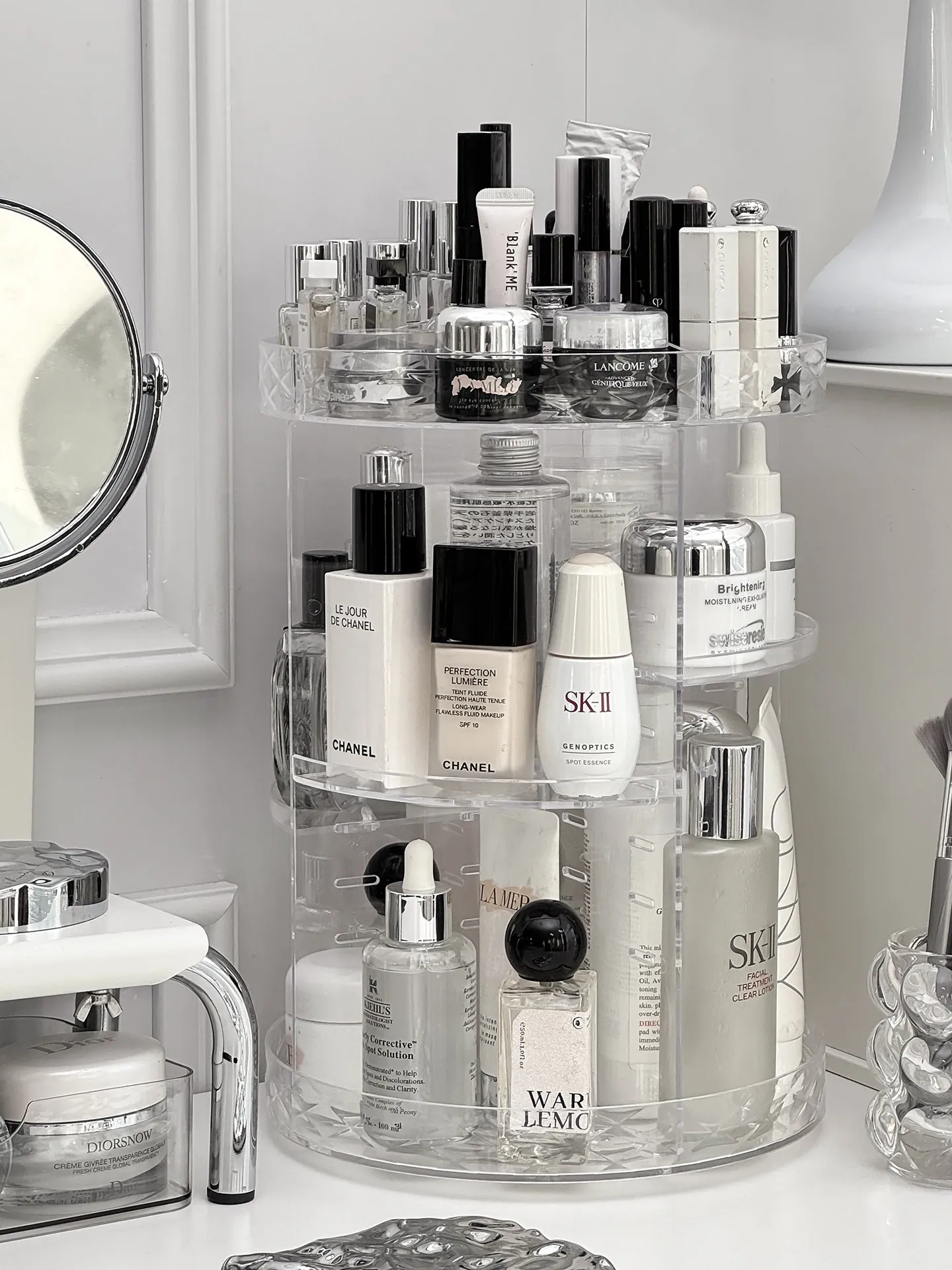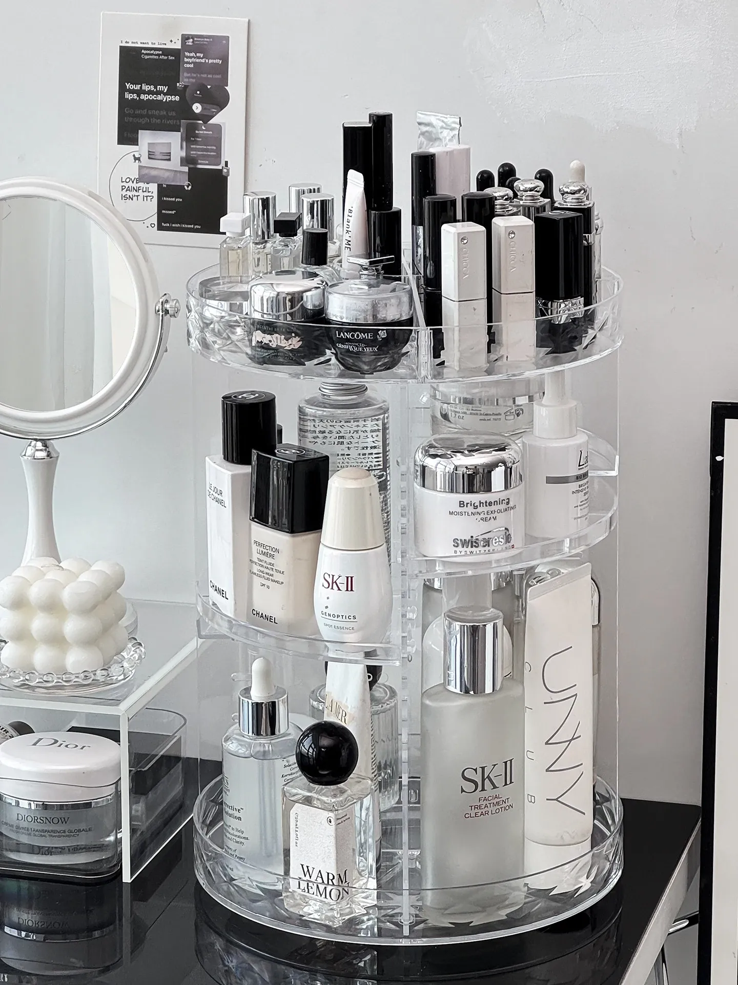 回転式デスクトップコスメ収納ボックス - 高級感あふれる化粧台!透明デザインで口紅や香水をすっきり整理、スキンケア用品も簡単アクセス。美しさを引き立てる必須アイテム!