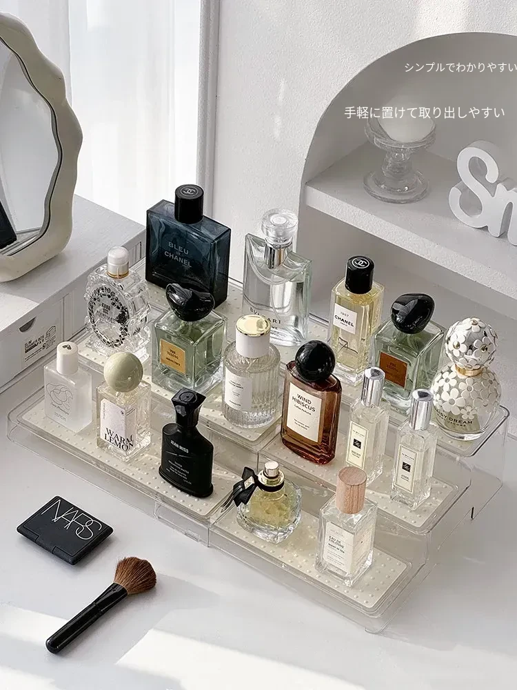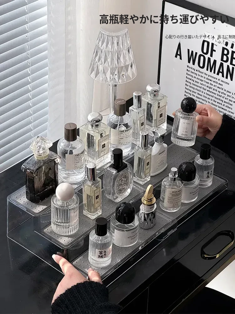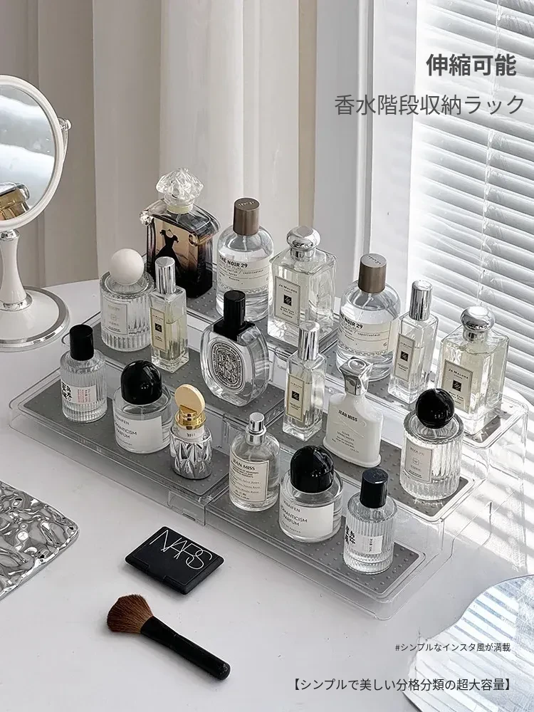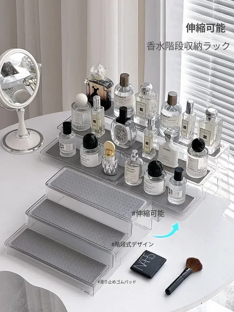 高級感漂う香水置物ラック!階段式デザインで化粧品がすっきり整理できる多層伸縮式コスメ収納ボックス。おしゃれなドレッサーを演出する必須アイテム!