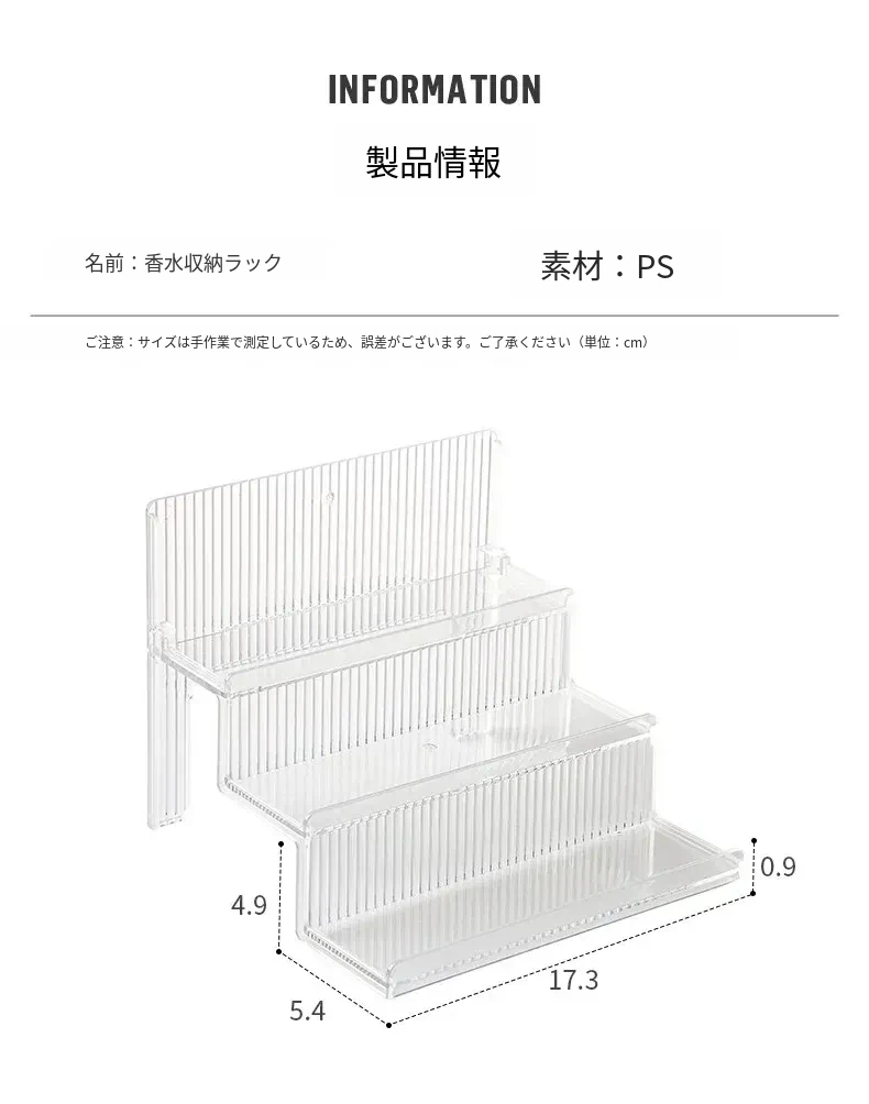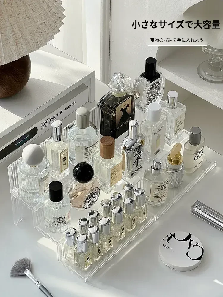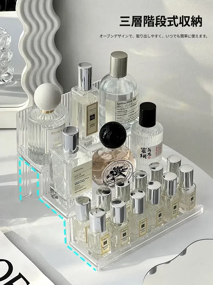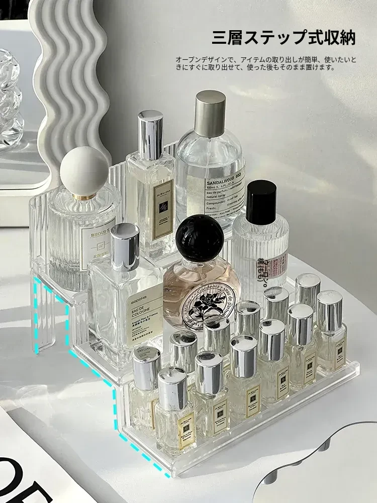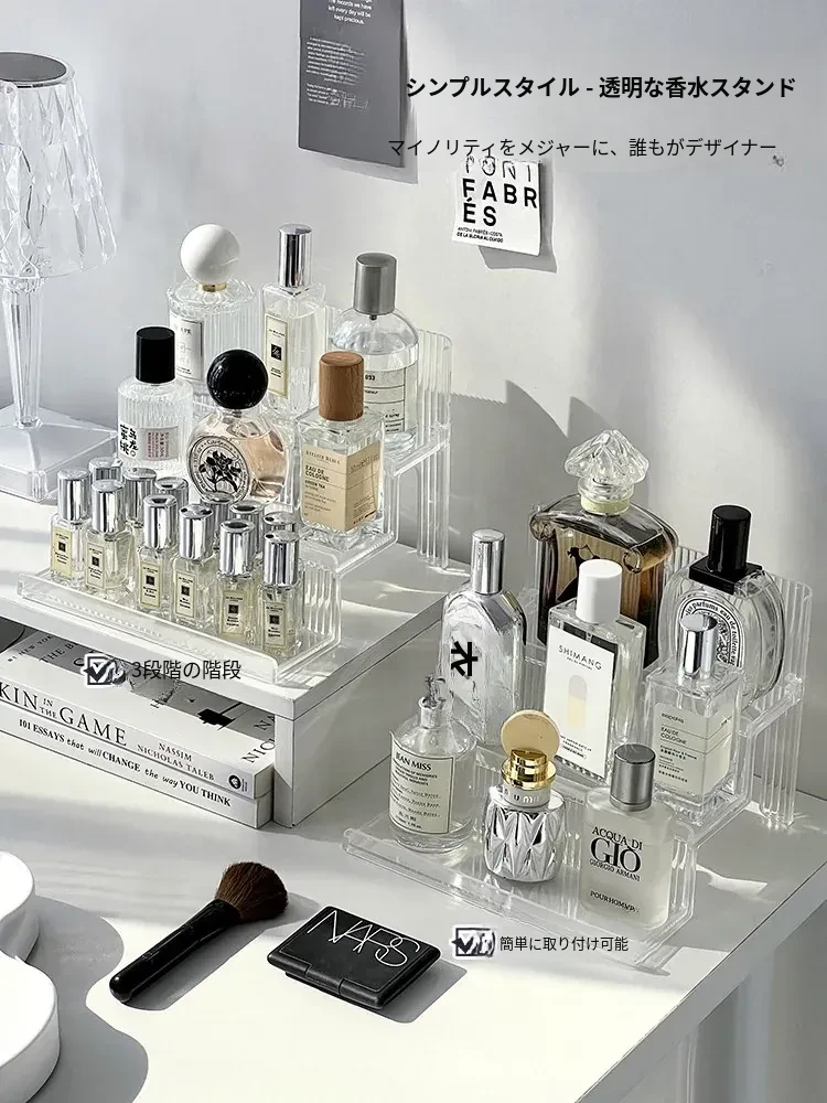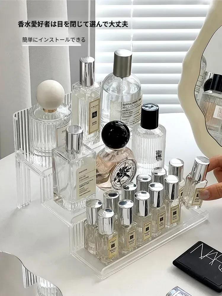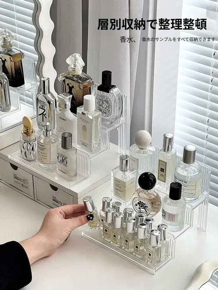 高級感漂う階段式香水収納ラック|透明デザインの化粧品整理ボックス|洗練されたコスメティックトレイであなたのドレッサーが美しく演出!
