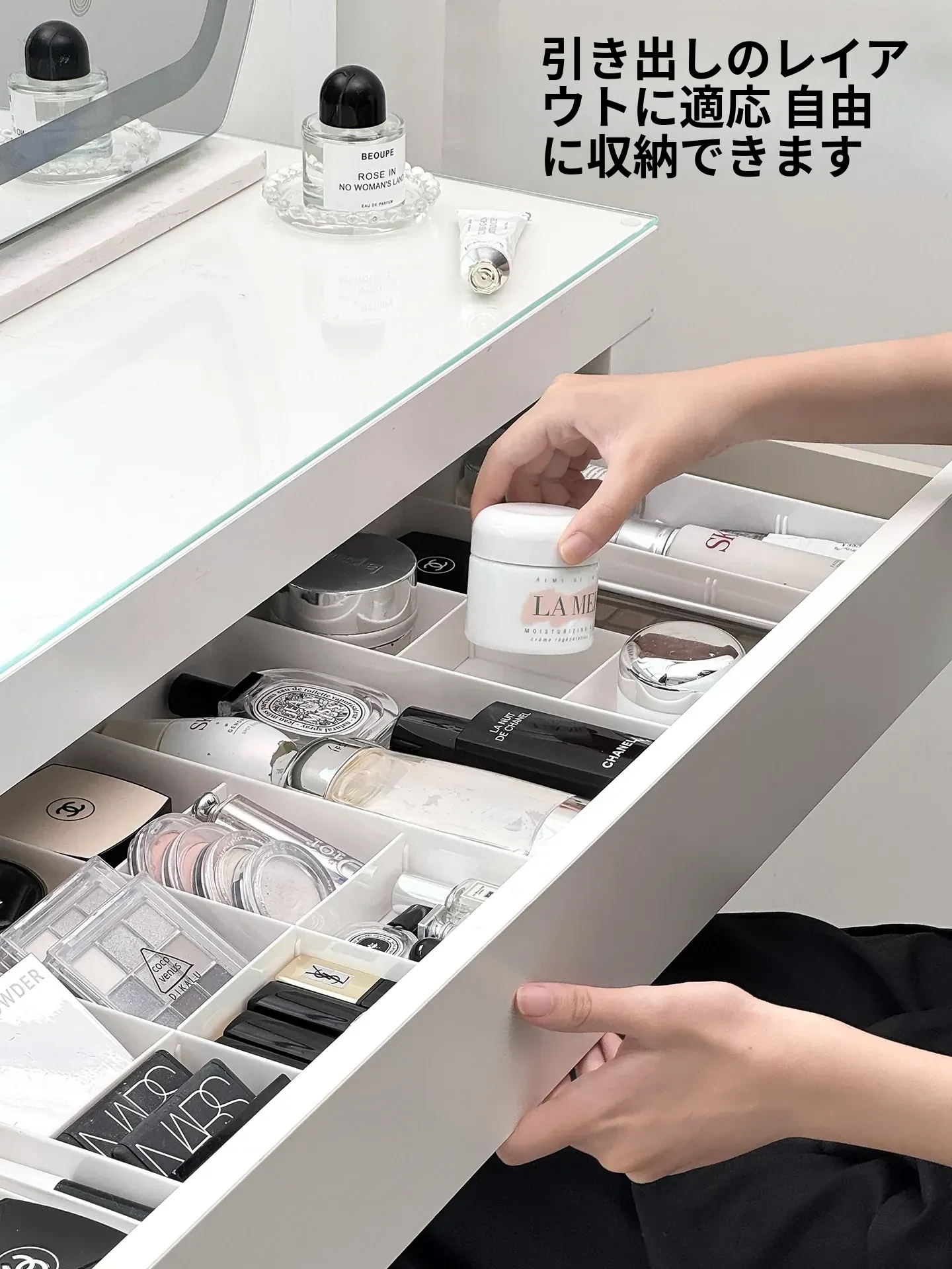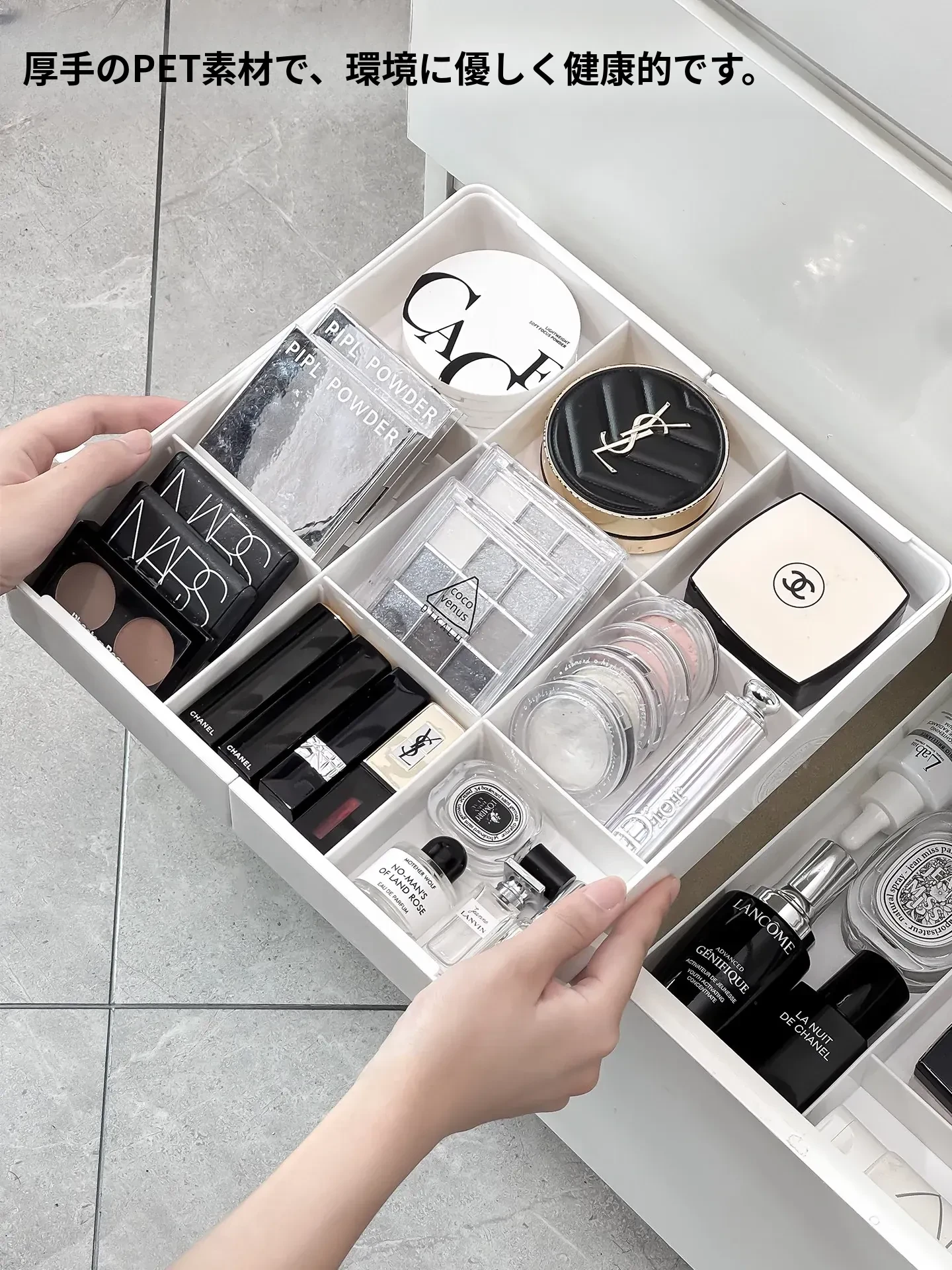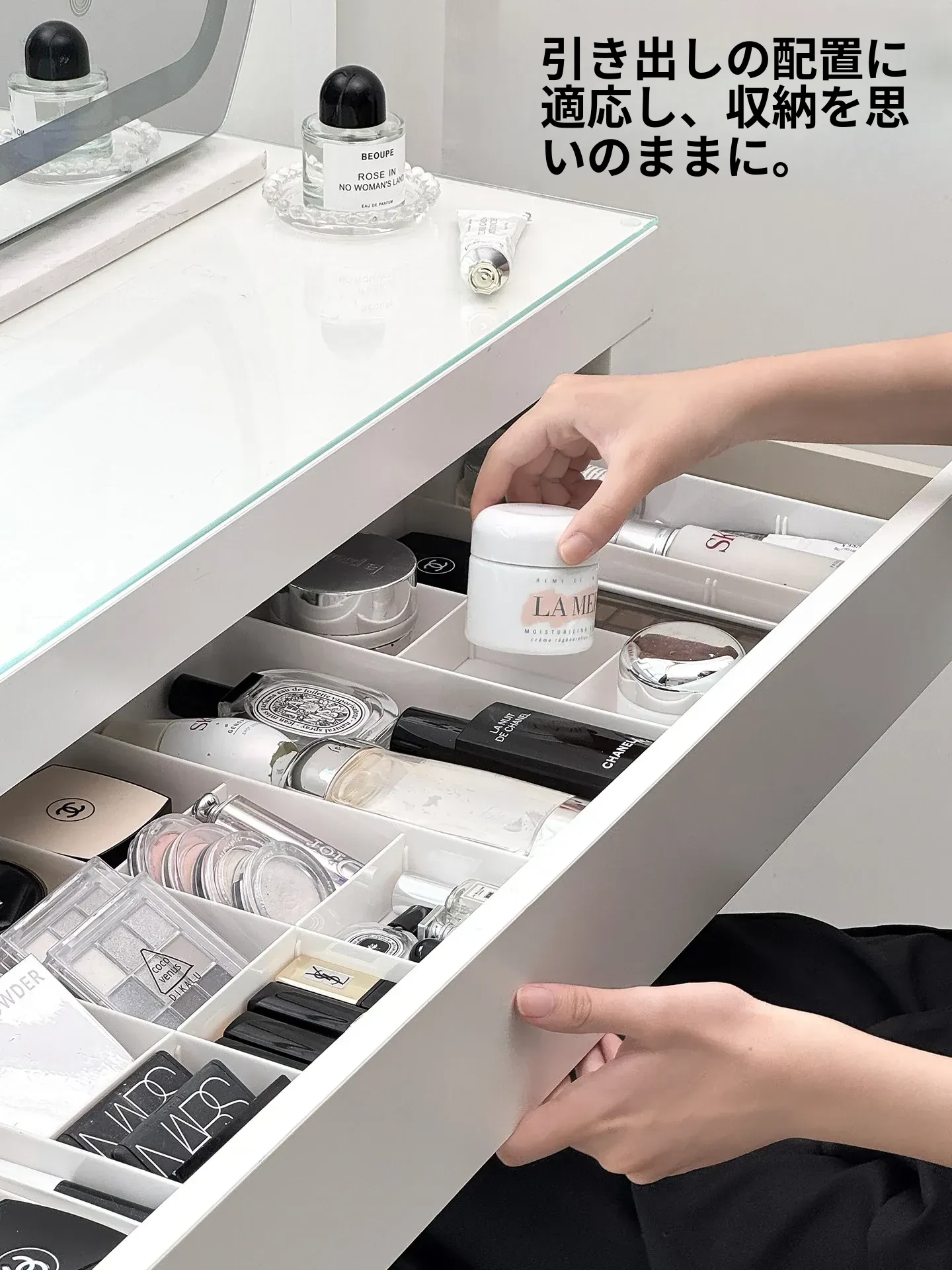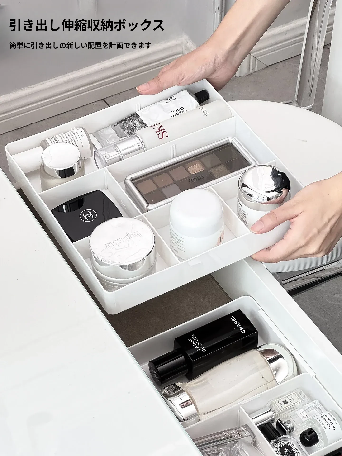 伸縮可能な引き出し収納ボックス - ドレッサー用化粧品整理トレー、リップスティックやメイクブラシをスッキリ整理できる便利な仕切り付き!あなたのビューティーアイテムを美しく整頓!
