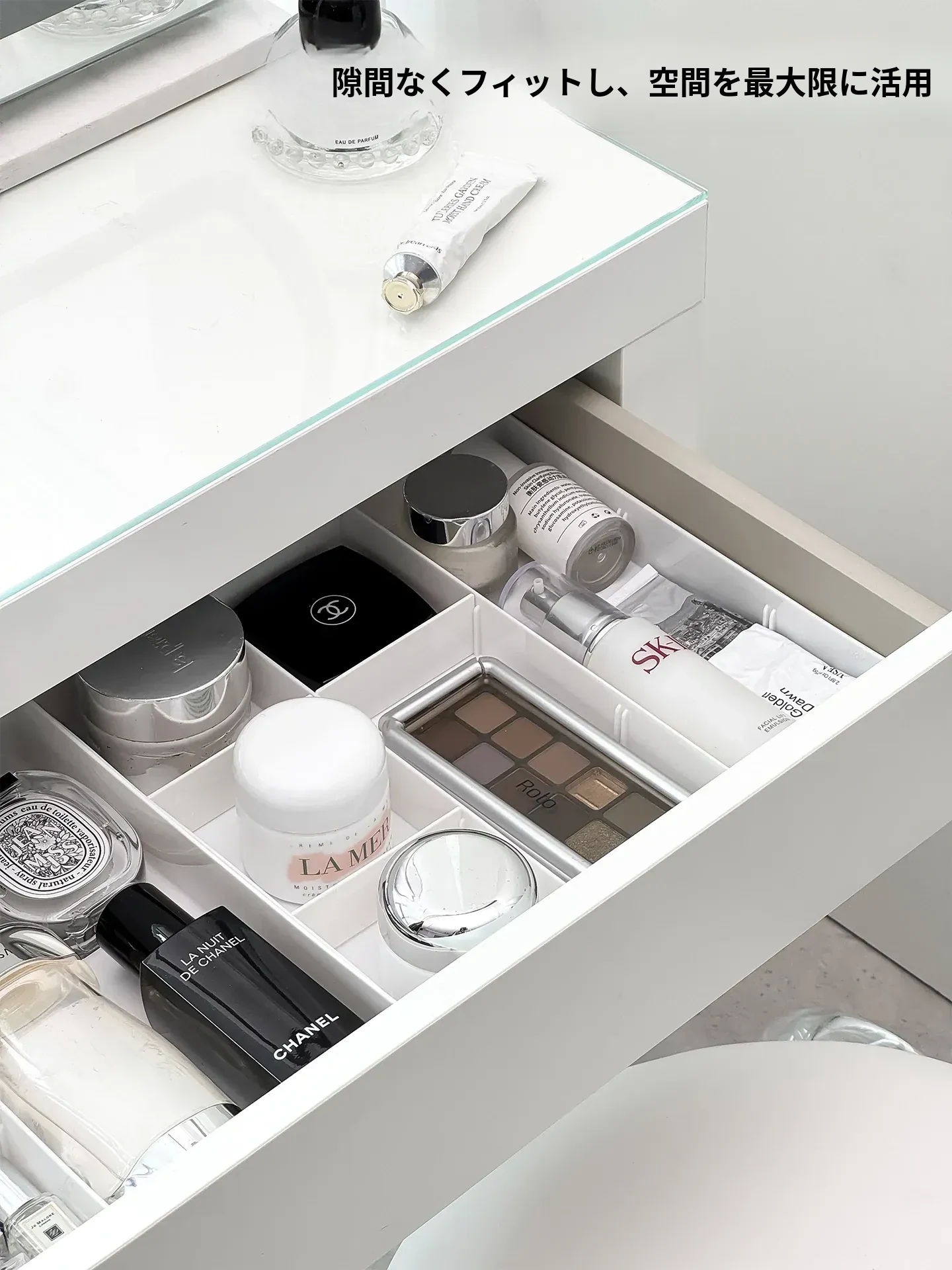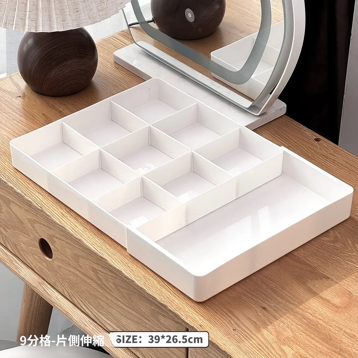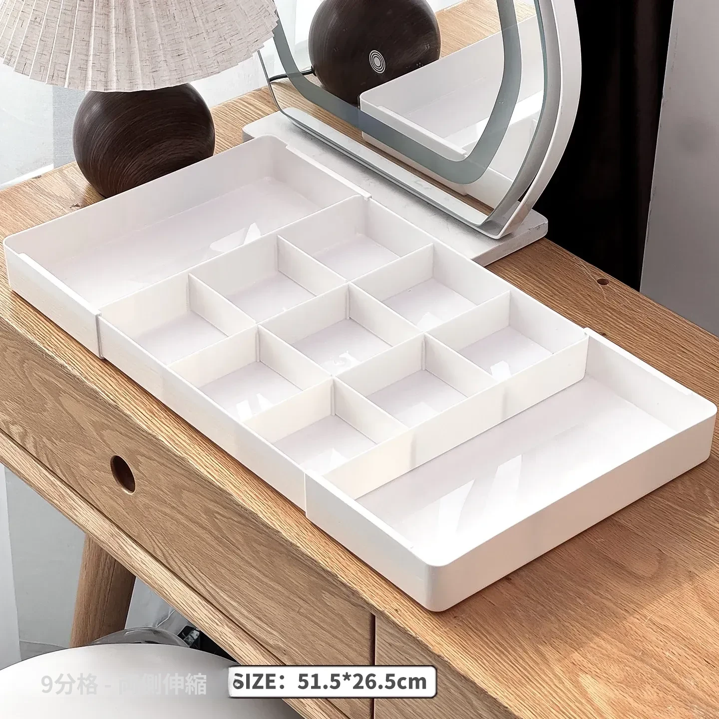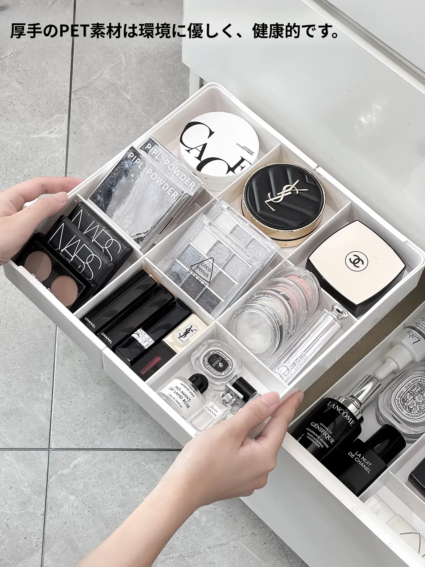伸縮可能な引き出し収納ボックス - ドレッサー用化粧品整理トレー、リップスティックやメイクブラシをスッキリ整理できる便利な仕切り付き!あなたのビューティーアイテムを美しく整頓!