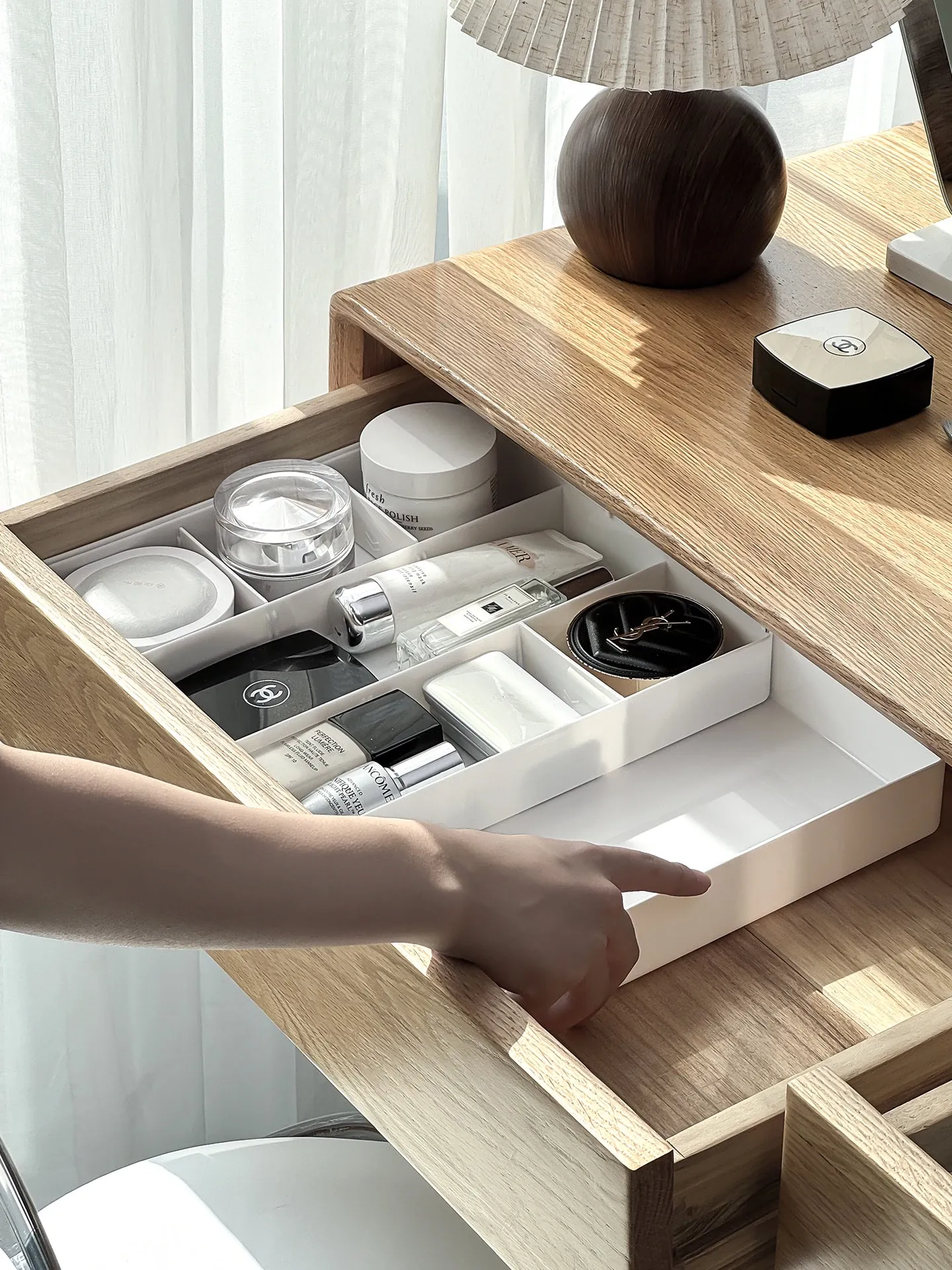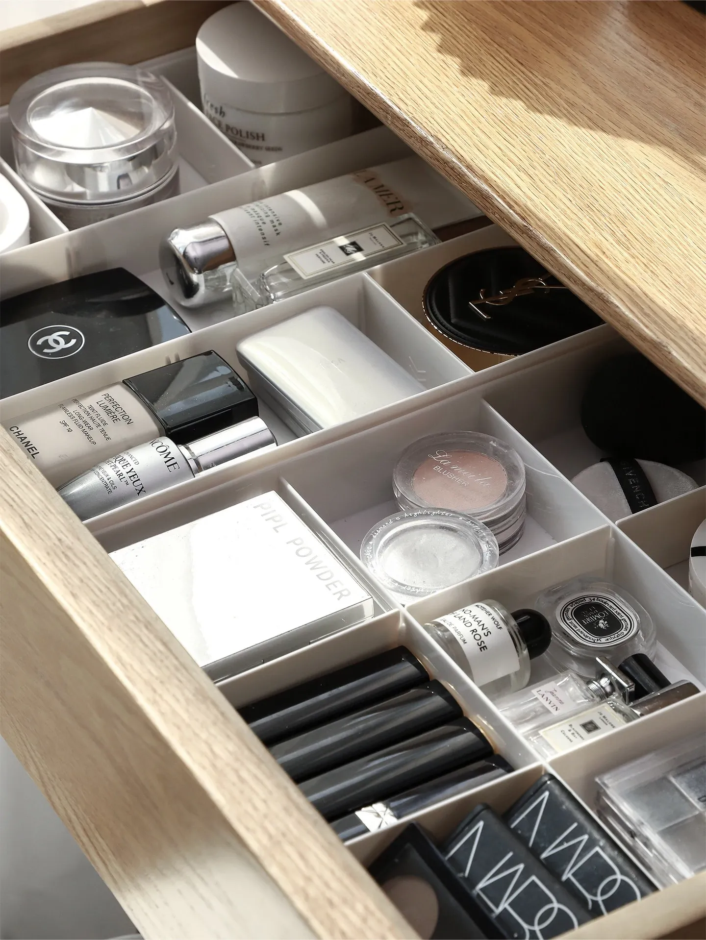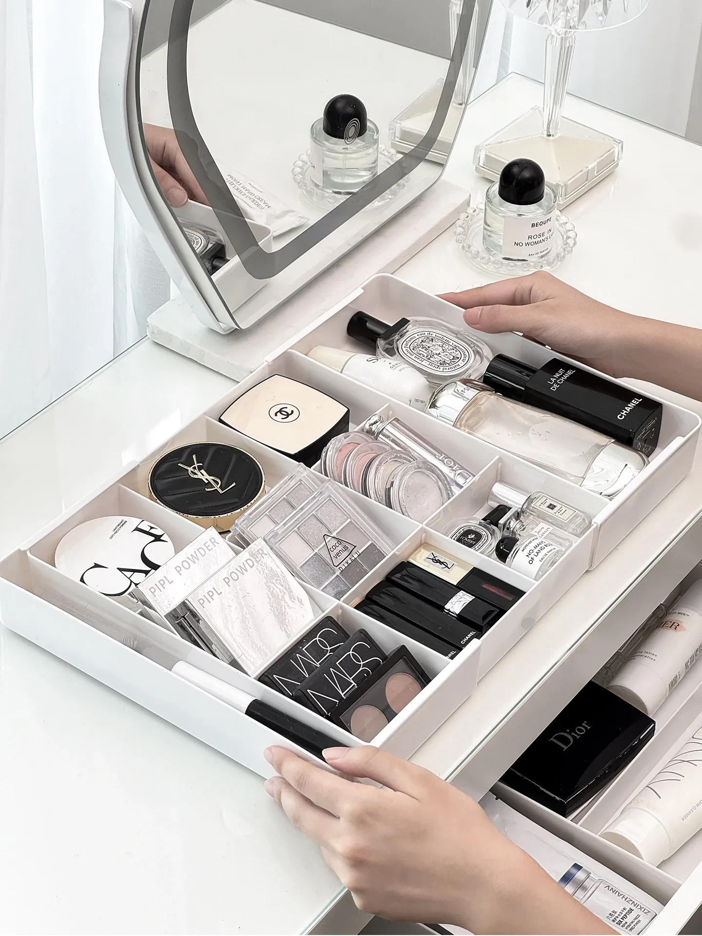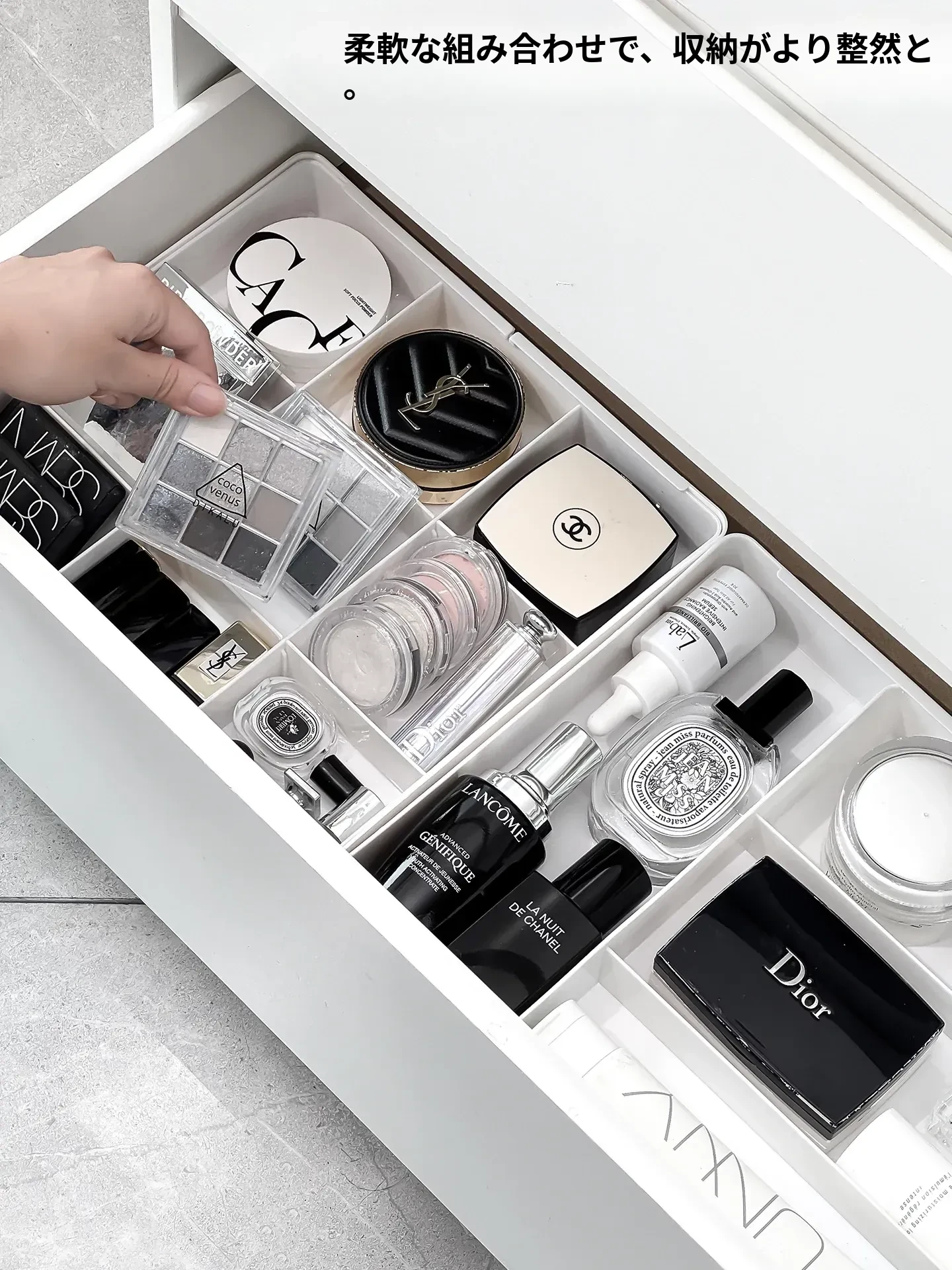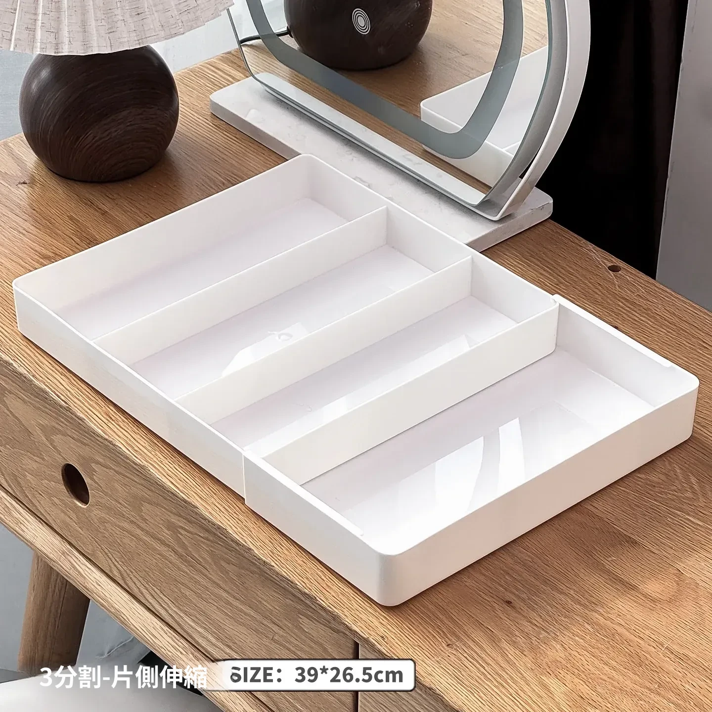伸縮可能な引き出し収納ボックス - ドレッサー用化粧品整理トレー、リップスティックやメイクブラシをスッキリ整理できる便利な仕切り付き!あなたのビューティーアイテムを美しく整頓!