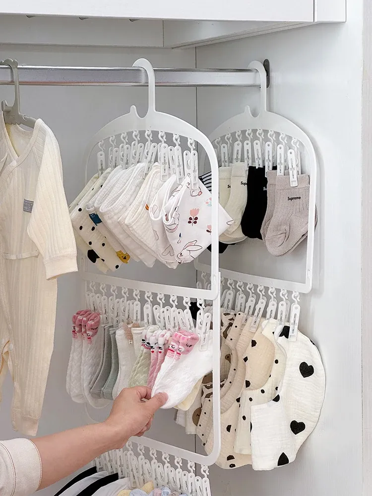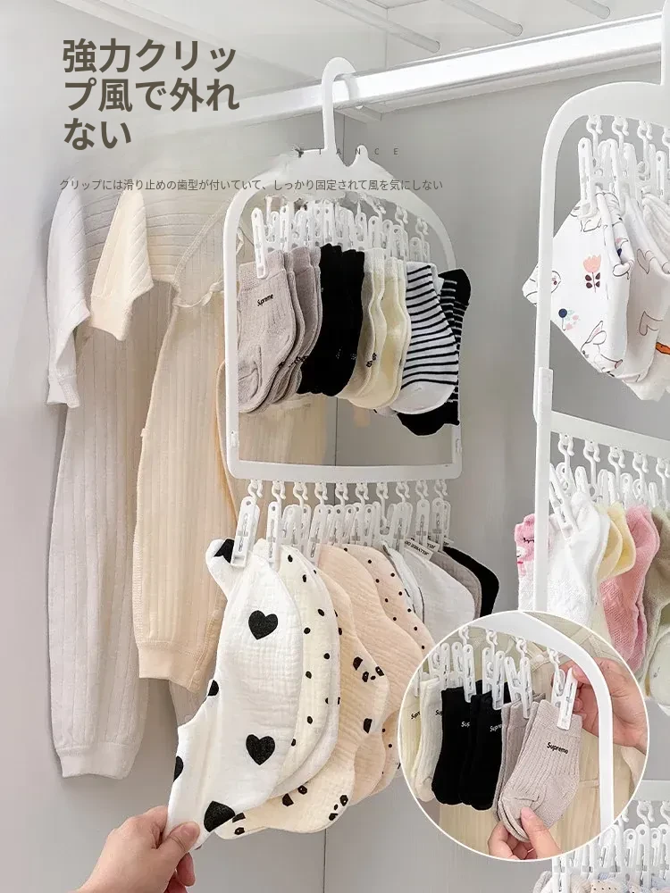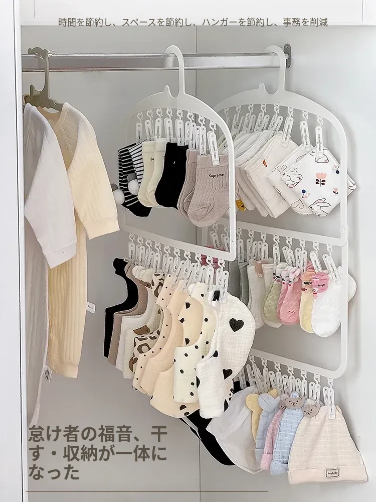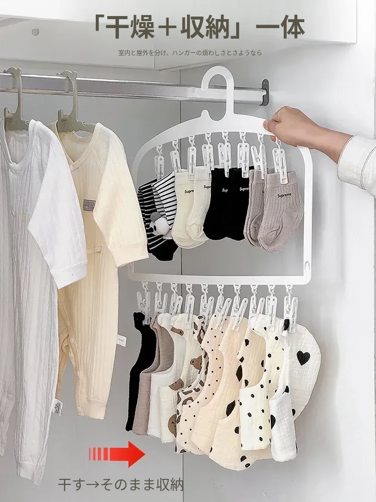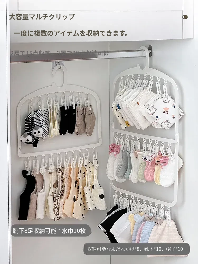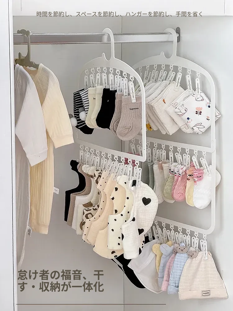 子供服収納の必需品!多機能クリップ付きベビー衣類ハンガー - おむつ、靴下、スタイ、帽子を一括収納!お部屋をスッキリ整理整頓し、育児をもっと楽に!